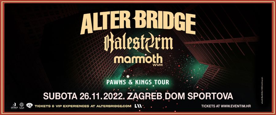 Alter Bridge so preživeli večji del letošnjega leta tako, da so ustvarjali material za pravkar izdani album “Pawns And Kings”, ki je nasledil izjemno hvaljenega predhodnika “Walk The Sky” iz leta 2019. Slednji album je lansiral skupino na prva mesta glasbenih lestvic v mnogih državah sveta. Skupina bo material novega albuma predstavila masovno na novi turneji, Myles Kennedy pa dodaja, da nas čaka rock’n’roll večer na katerem se bodo tresla tla pod nogami!