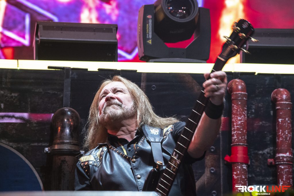 Priesti so dalje mleli brez usmiljenja in nizali klasiko za klasiko, rušilec za rušilcem, publika pa odlično podobo na odru hvaležno vračala z bučno podporo, kar je bilo videti in slišati zares prečudovito. Kot tudi obiskovalce odete v majice z logotipi bendov vse od Mayhem pa do kakšnih Poison, kar daje jasno vedeti, kaj v metalu pomeni ime Judas Priest. Poleg tega pa je tudi starostno publika izgledala tako, da bi lahko tisti najstarejši zlahka predstavljali stare starše tistim najmlajšim. Lep dokaz, da vera v metal še živi! Judas Priest so preko hita You’ve Got Another Thing Comin’, popeljali na odlično izvedeno Freewheel Burning, pa obvezni plesni Halfordov hit Turbo Lover, med katerim je z boki zibala celotna dvorana do ubijalskega dvojčka Hell Patrol in The Sentinel, med katerima je Halford vreščal kot za stavo. Neverjetno v kakšni formi se je pokazal tokrat Metal Bog (z malenkostno pomočjo odmevov ob najvišjih falzetih) in to kljub temu, da bo kmalu dopolnil spoštljivih 71 let! Halfordu se pozna, da je frontmen stare šole, saj je publiko kupil s klasičnim, a rahlo prežvečenim spodbujanjem po ponavljanju njegovih »yeah, yeah, yeah« v različnih variacijah. Vseeno tokrat velik poklon frontmenu katerega starost v resnici kaže le dolga siva brada. Po The Sentinel so Priesti set nekoliko upočasnili z epskim trojčkom A Touch of Evil, Victim of Changes in industrijsko zvenečim Blood Red Skies, med katerim se je na odru dvignil velik zidan dimnik z napisom JP Metalworks in nas z rdečo podobo pahnil naravnost v nekakšen plavž. Bend je nato nanizal dve nesmrtni pripredbi Fleetwod Mac in Joan Baez, ko se je nato izza bobnov oglasil Scott Travis pa se je točno vedelo kaj sledi – vrhunsko izvedena nesmrtna metal klasika Painkiller, ki je ubila za konec rednega dela seta in v ospredje med divjim soliranjem postavila tudi Richieja Faulknerja, ob čigar predstavi niti malo ne diši po tem, da mu je pred letom dni počila aorta in je bil praktično na smrtni postelji, ter Andyja Sneapa.