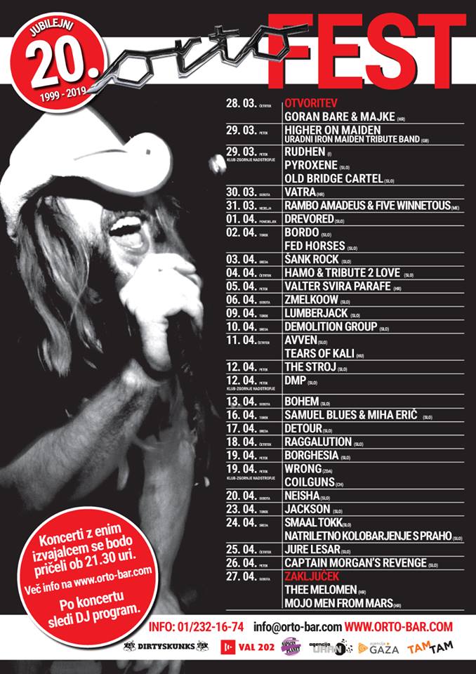 »Od 28. marca do 27. aprila 2019 bo potekal že 20. festival mednarodni, največji klubski festival v Sloveniji, Orto Fest. Gre za častitljivo obletnico takšnega festivala, ki je unikum v našem prostoru. V svoji zgodovini je gostil že več kot 550 glasbenih skupin in izvajalcev. Gre za edinstven slovenski klubski festival, ki ponuja v svojem programu številne domače in tuje, tudi vrhunske glasbene skupine, žanrsko predvsem obarvane v rockovske barve vseh odtenkov, daje pa prostor tudi drugim glasbenim zvrstem s poudarkom na kvaliteti in izvirnosti določenega trenutka.