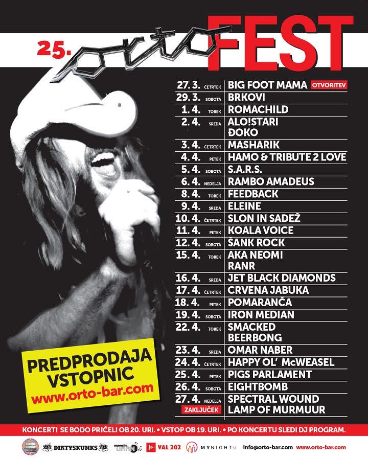 Otvoritveni koncert že 25. Orto Festa v Orto Baru v Ljubljani bo v četrtek, 27. marca pripadel vsem znani domači rock zasedbi Big Foot Mama, v soboto, 29. marca pa bodo nastopili hrvaški balkan punk rock wellness spa Brkovi.