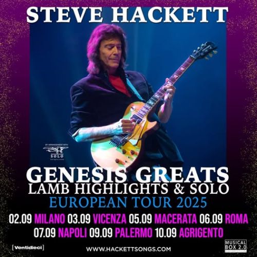 Steve Hackett, ki je tik pred izidom novega koncertnega albuma, ki mu je dodelil naslov “Live Magic at Trading Boundaries” – album izide 17. 1. 2025 pri založbi Insideout Music / Sony, bo na novih sedmih koncertnih terminih turneje “Genesis Greats Lamb Highlights & Solo” po Italiji predstavljal vrhunce Genesis albuma “The Lamb Lies Down On Broadway, priljubljene skladbe zasedbe Genesis, vrhunce svoje dolgožive samostojne kariere in skladbe iz najnovejšega samostojnega studijskega albuma “The Circus And The Nightwhale” (2024, RockLine recenzija).