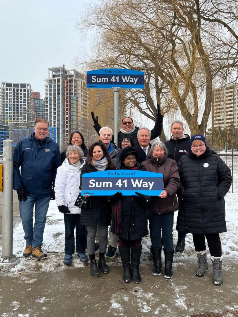 Today, #AjaxCouncil met at Falby Court with Sum 41 family members Michelle & Kevin Gordon, Mary & John, Roxy Baksh & Sharon McCaslin for the temporary renaming of this street sign to “Sum 41 Way”!