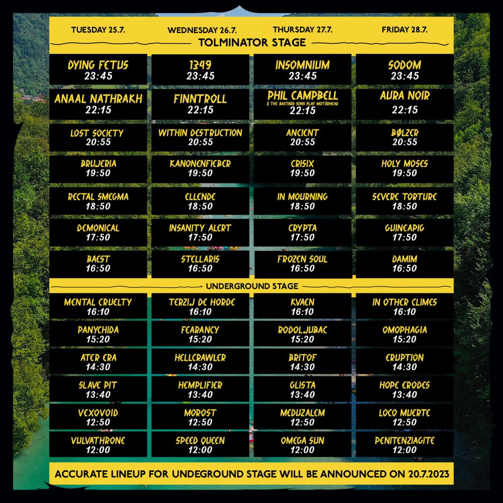 Tolminator, novi metalski festival, ki bo potekal med 25. 7. 2023 in 29. 7. 2023 v Tolminu, točneje na sotočju Tolminke in Soče, objavlja dnevni urnik (razpored) nastopajočih izvajalcev.