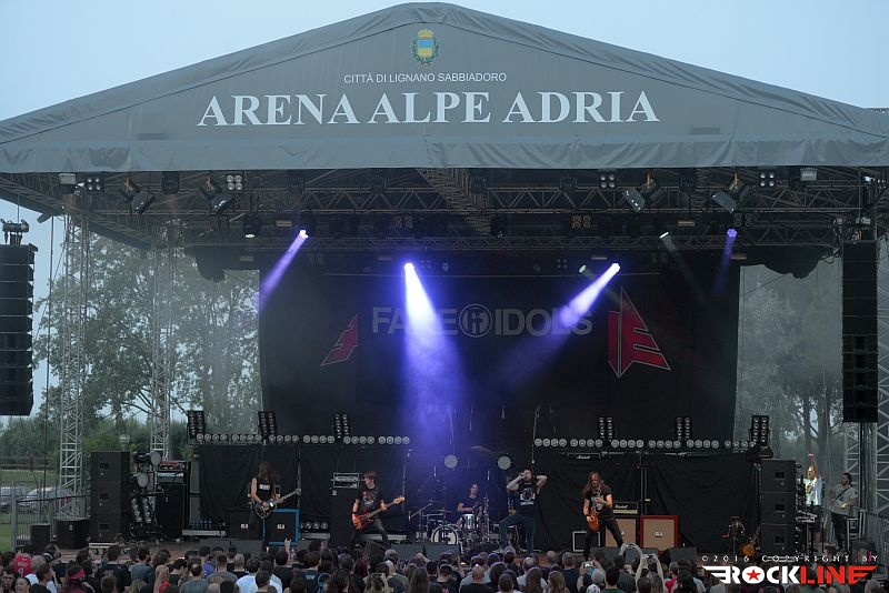 Nastop skupine v Lignanu je bil eden redkih za Aribourne v letošnjem poletju, na katerem je zasedba nastopila izven festivalskega programa, torej na samostojnem koncertnem nastopu. Še pred Airbourne pa so dobili svojo priložnost italijanski rock’n’roll žrebci, nastanjeni v provinci Pordenone (kraj Casarsa della Delizia), imenovani Fake Idols. To so taisti Fake Idols, ki bodo nastopili tudi v sklopu letošnjega Rock Camp Summer Music festivala, streljal stran od Trsta (kraj Trebče pri Opčinah). Skupina se je predstavila, kot izredno dobro skvašen in uglašen kvintet. Sestavlja ga nižja uglasitev dveh mastno grmečih Gibson Les Paul kitar, prodoren in rožljav bas, krepki in čvrsti ritmični udarci koketnih vodilnih ritmov ter besen, grleno zabeljen in aroganten vokal. Bend je izdal leta 2014 istoimenski studijski prvenec, nastop pred Airbourne v Lignanu, pa uporabil za predstavitev aktualnega, leta 2016 izdanega studijskega naslednika »Witness«. S slednjega smo slišali tudi nadvse posrečeno priredbo izvirnika The Chemical Brothers imenovano Go in avtorski I Am Fake ter Mad Fall. Čuti se, da je bend, ne glede na relativno kratek staž, izvrstno uigran in da je igral že na večjih prizoriščih, med drugim tudi na festivalu Gods of Metal. V zvočni sliki bi lahko malo bolj navili kitare med koncertom, kar se je odražalo v zlasti manj slišnih solažah, sicer pa brez pridušanja. Izredna kinetika, dinamika, nenehno tekanje članov ekipe levo in desno preko odra ter sodelovanje s publiko. Skladbe pozna publika že zelo dobro in Fake Idols so prejeli kar nekaj podpore, ko je publika sodelovala z njimi pri petju verzov. Izvrstno uvodno ogrevanje torej. Tudi angleška besedila so odpeta na suvereno visokem nivoju, kar italijanskim skupinam od vselej povzroča preglavice.