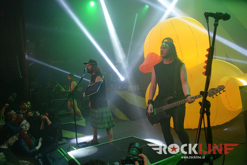 In tu je znova? Tisti orjaški gumijasti racman. Grotesknost, ki prekaša izbrane like animiranih Looney Tunes filmov, pomeni danes za Alestorm odskočno desko s katero so fantje v zadnjih letih skokovito pridobivali naklonjenost nove generacije ljubiteljev metala. Ti pa niso nujno metalci. Kot je tudi vse kar počnejo Alestorm na odrih, povsem nemetalsko. In prav v tem je hec. Kup folka nališpanega in nakičenega v pirate in piratinje, z obveznim pivom v roki. Na Alestorm se ga moraš priti nasekat. Praviloma že. Če si upaš seveda. Torej ne vedno sredi tedna. Ljudje, ki so med koncertom zatavali do šanka, so si večkrat privoščili le kozarec vode. Nezaslišanost ‘fekalij’ (v očeh true metalca). True? Kaj je že to? Je kdo še živ? Zakaj torej kozarec ‘odrešitve’ (beri: vode)? Zaradi strahu pred modrimi srajcami, ali pa preprostega dejstva da denarja za kaj več enostavno ni? To je torej nova generacija. Malo bolj disciplinirana. Bistven pa je brezbrižen žur. In tega je med Alestorm koncertih v prebitku. Točno po to pride publika. V splet parodije in zabave. Ko se pojavi na odru kitarist Mate Bodor z zategnjenimi travnato zelenimi svileno-svetlečimi telovadnimi hlač(k)ami, ki skorajda kradejo pozornost pevcu Christopherju Bowesu, veš da je vrag dostavil dodatno krepostno šalo na oder. Bowes si je zlomil/zvil roko tik pred prihodom v Ljubljano, tako da jo je tudi v Zagrebu pestoval. Tako na odru ni bilo njegovega znamenitega ‘prvega ubijalca heavy metal ikonografije’, to je klaviatur v obliki key-tar-a. A je mož s škotsko kiklo, ‘regular Joe’ (hvala za namig Denis) čepico, svojo neizpodbitno karizmo in polka-keltskim marširanjem ter korakanjem, strumno stoječ na podestu, vseskozi držal publiko ob sebi, da mu je ta pogoltno hlastala iz rok.