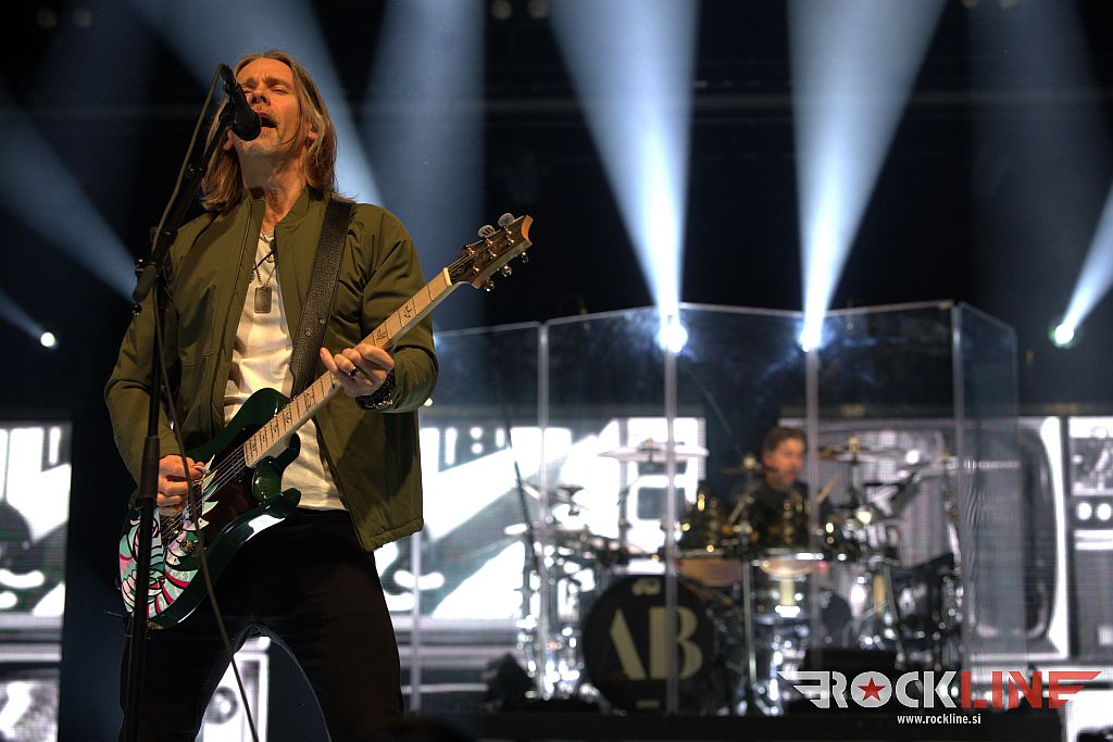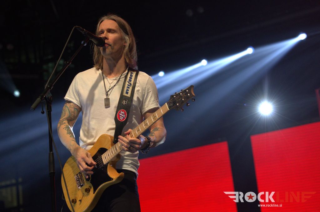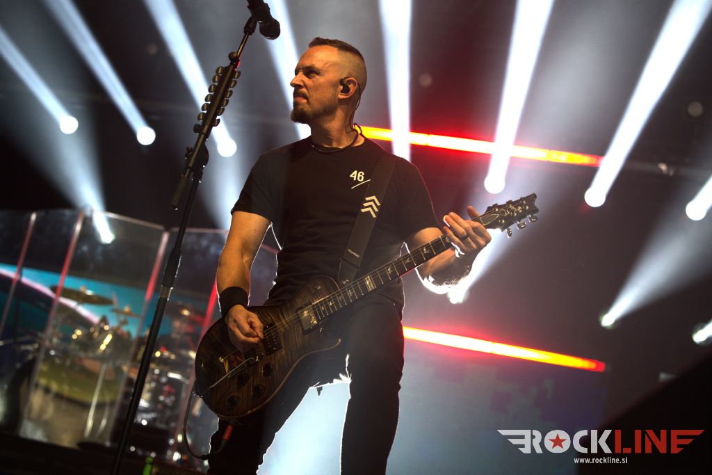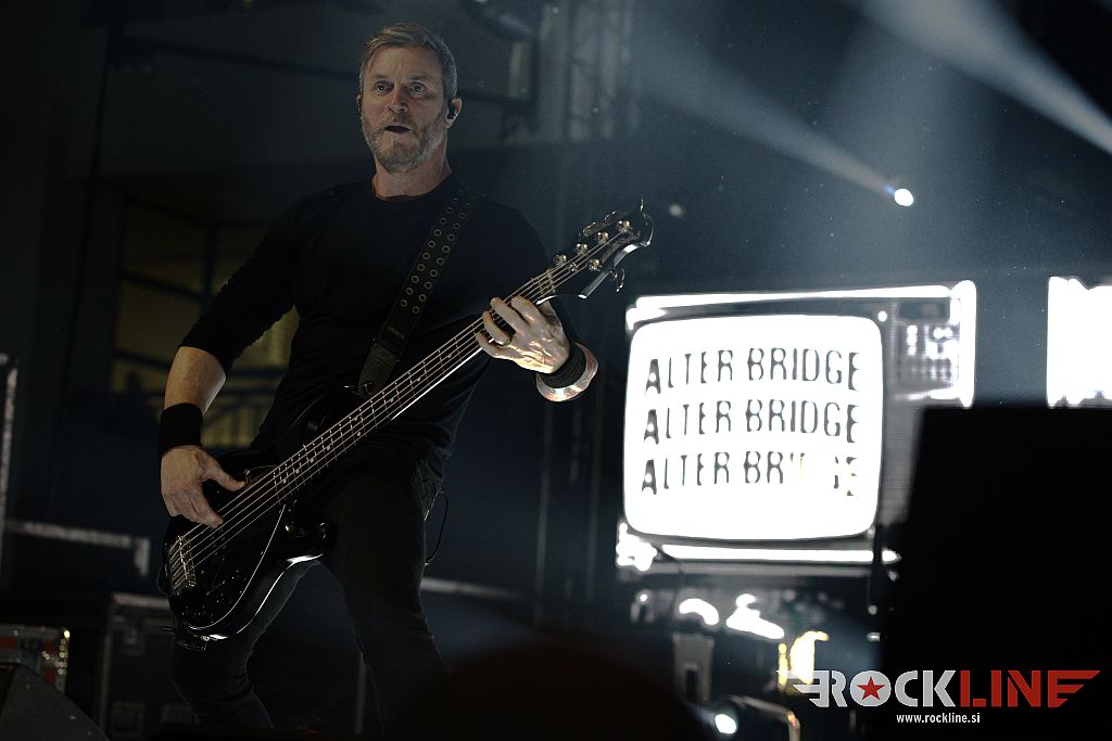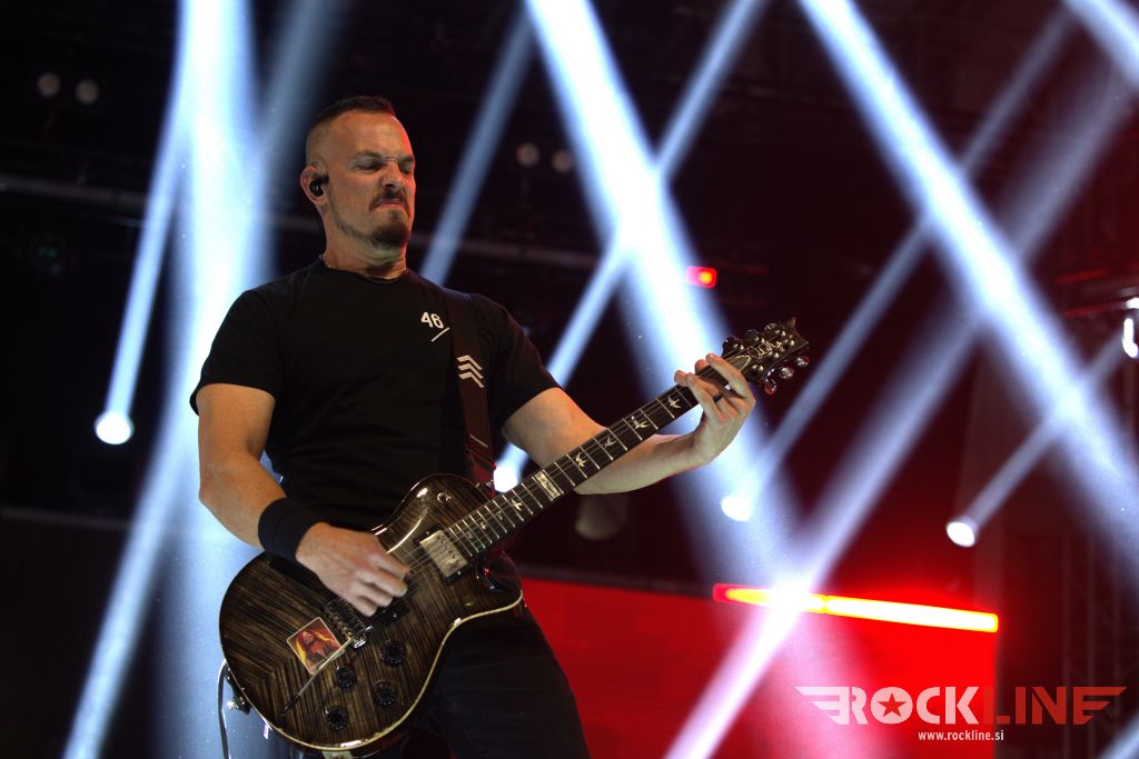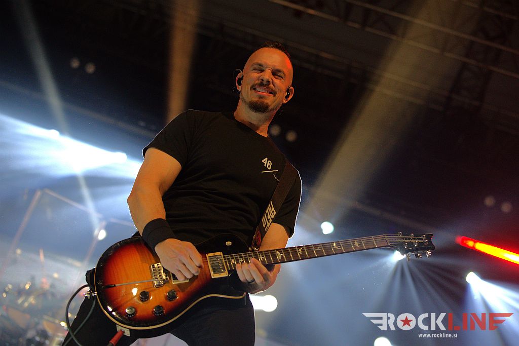 Ura je 21. 15! Ljudje so strnili prve vrste. Nagneteni. Prostor nabit. Lahko rečem, da je bilo prizorišče tik na tem da ga označiš z ‘razprodano’. Alter Bridge so udarili po pričakovanju z materialom najnovejše plate “Alter Bridge” in uvodoma na hitro odkrhnili omet s sten, ko so z brezgrajnim zaletom usekali z jurišnico Silent Divide. Bend je uvodoma osupnil že s kar pregovorno perfekcijo, ki zajema izjemen preplet rimtičnega groova in masivnega zvočnega zidu kitarske rifaže ter v katerega je vpet izjemni Myles Kennedy s svojo vokalno briljanco. Myles je že uvodoma potrdil da je tudi zelo, zelo dober kitarist. Alter Bridge to hvaležno izkoriščajo, Myles pa je zelo dejaven med komadi tudi s svojimi solažami! Sledita “Fortress” favorita mračna Addicted To Pain in za njo Cry of Achilles, ki jo je skupina glede na prejšnjo turnejo prestavila iz dodatka v sam uvodni del koncerta. To čaranje s klasikami je prililo olja na ogenj in potrdilo izjemno vez med skupino in publiko! Cry of Achilles je bil tudi prvi moment, ko sta Tremonti in Kennedy (zaradi drugačne uglasitve) pred izvedbo komada, prvič menjala kitari med koncertom. Velja pomniti tri čarobne črke, ki se jih moraš držati: PRS! To prinaša v naprej zagotovljeno zmago.