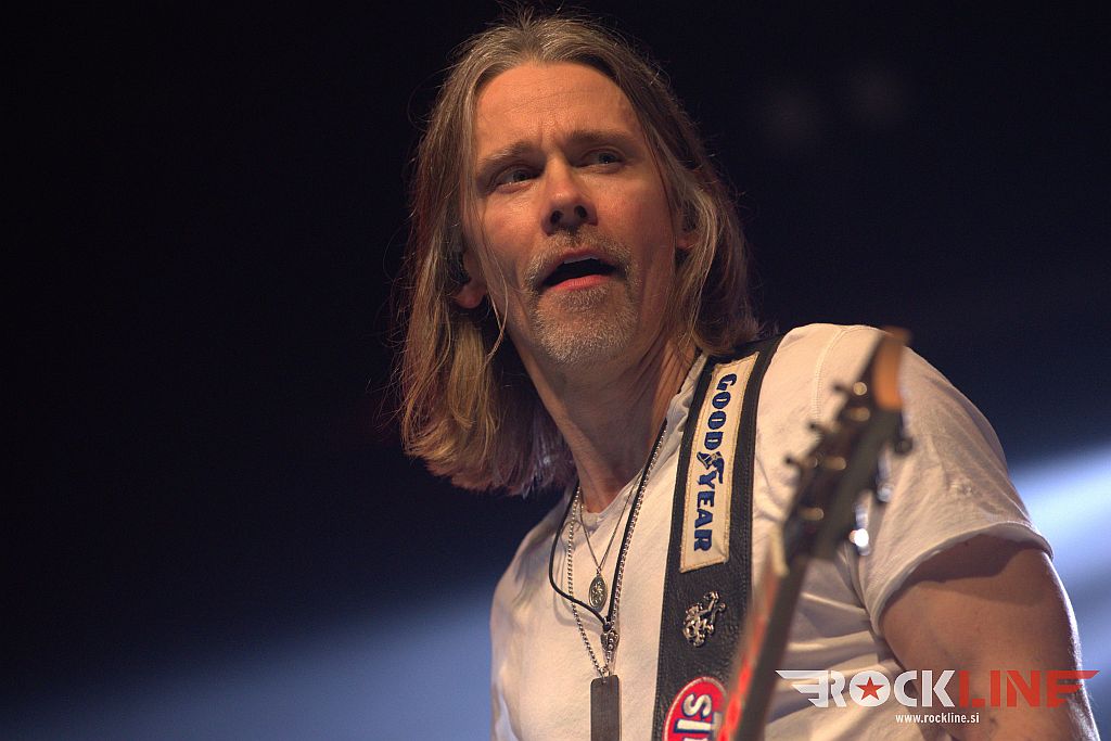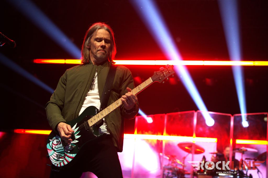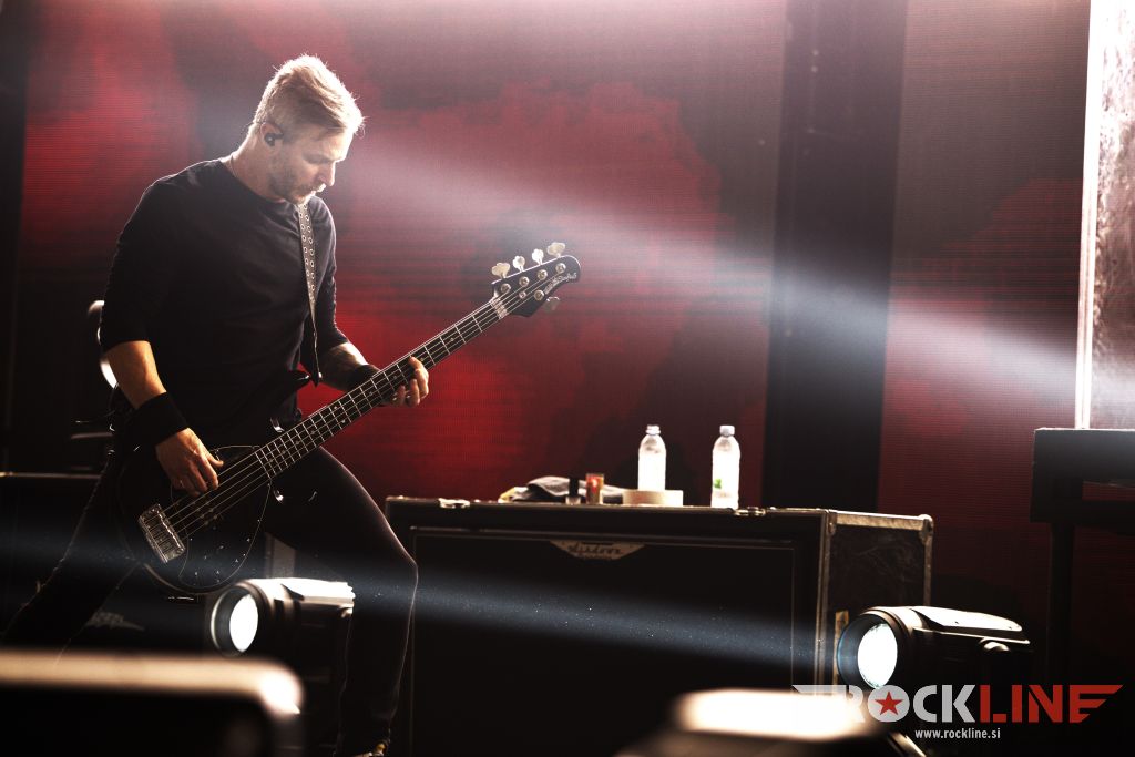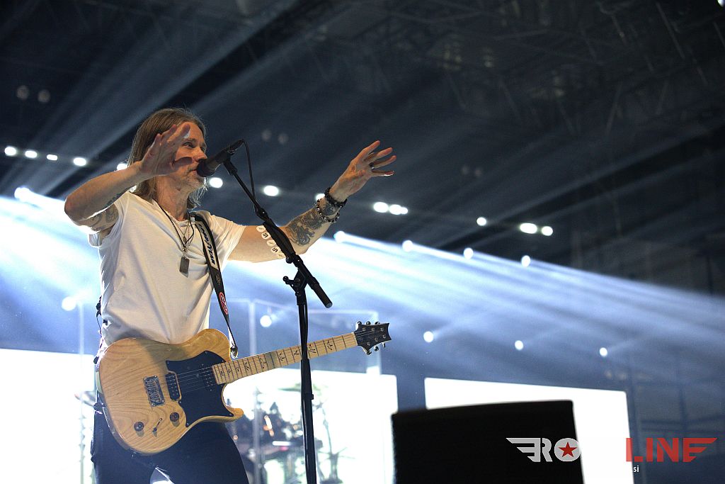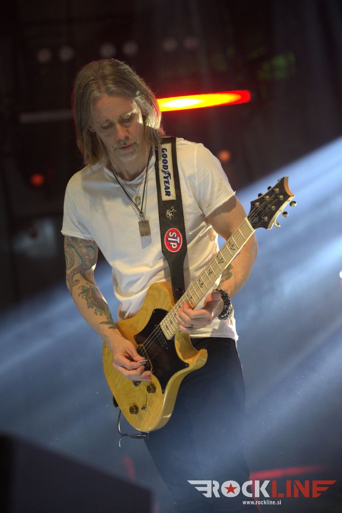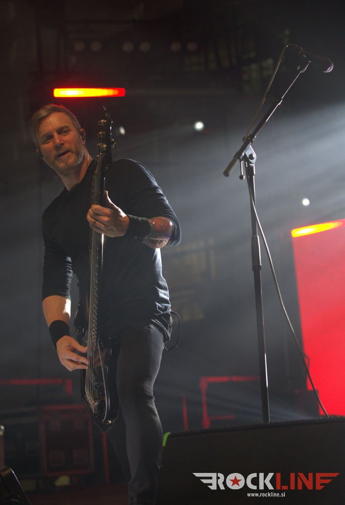 Ura je 21. 15! Ljudje so strnili prve vrste. Nagneteni. Prostor nabit. Lahko rečem, da je bilo prizorišče tik na tem da ga označiš z ‘razprodano’. Alter Bridge so udarili po pričakovanju z materialom najnovejše plate “Alter Bridge” in uvodoma na hitro odkrhnili omet s sten, ko so z brezgrajnim zaletom usekali z jurišnico Silent Divide. Bend je uvodoma osupnil že s kar pregovorno perfekcijo, ki zajema izjemen preplet rimtičnega groova in masivnega zvočnega zidu kitarske rifaže ter v katerega je vpet izjemni Myles Kennedy s svojo vokalno briljanco. Myles je že uvodoma potrdil da je tudi zelo, zelo dober kitarist. Alter Bridge to hvaležno izkoriščajo, Myles pa je zelo dejaven med komadi tudi s svojimi solažami! Sledita “Fortress” favorita mračna Addicted To Pain in za njo Cry of Achilles, ki jo je skupina glede na prejšnjo turnejo prestavila iz dodatka v sam uvodni del koncerta. To čaranje s klasikami je prililo olja na ogenj in potrdilo izjemno vez med skupino in publiko! Cry of Achilles je bil tudi prvi moment, ko sta Tremonti in Kennedy (zaradi drugačne uglasitve) pred izvedbo komada, prvič menjala kitari med koncertom. Velja pomniti tri čarobne črke, ki se jih moraš držati: PRS! To prinaša v naprej zagotovljeno zmago.