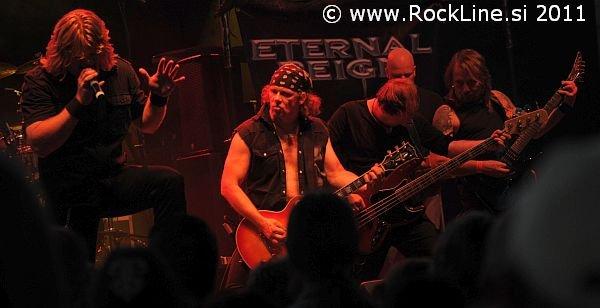 Natanko ob osmi uri zvečer so stopili na oder dvorane nemški Eternal Reign doma iz Bremna. Skupina je sekstet v postavi Björn Meyer (klaviature), Dirk Stühmer (vokal), Jörg Hassel (bas kitara), Lennart Medebach (bobni), Michael Sebastian (kitara) in Torsten Fünfhaus (kitara). Ekipa prekaljenih mačkov, ki se sicer rada preimenuje v Eternal Dio, ko se  je treba preleviti v tribute to Dio zasedbo, obstaja od leta 2002 in kljub skoraj desetletnemu obstoju, komaj v letošnjem avgustu izdaja svoj tretji studijski album z naslovom “The Dawn Of Reckoning”. Petdeset minut trpežnega ogrevanja v vožnji predvidljive klasično zasnovane in s simfoničnostjo zabeljene epopeje nemške šole heavy metala, sicer ni sprožila tevtonskih premikov nove glasbene revolucije na planetu, pač pa so se Eternal Reign predstavili, kot izjemno kompaktna in odlično uigrana zasedba, ki je svojo vlogo prve predskupine v polnosti suverene igre spretno unovčila in izkoristila. Brez dvoma so Eternal Reign v glasbenem smislu zanimivi za ljubitelje melodično izvorne oblike power metala s koreninami v klasičnih zasnovah hard rocka, kot so pozno romantični Black Sabbath (Dio, Tony Martin era) in/ali Rainbow.