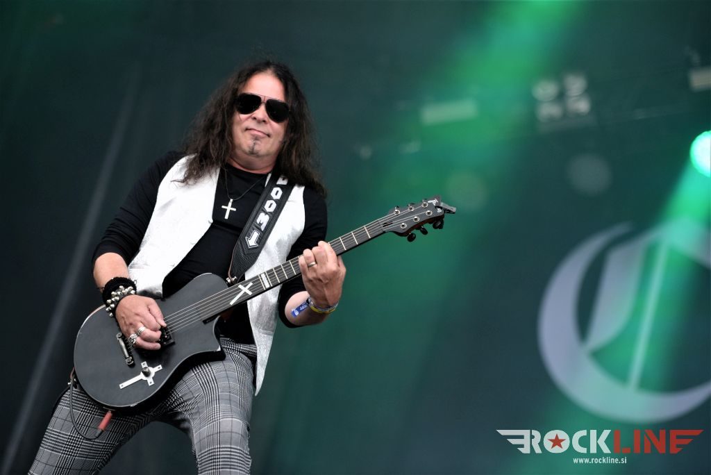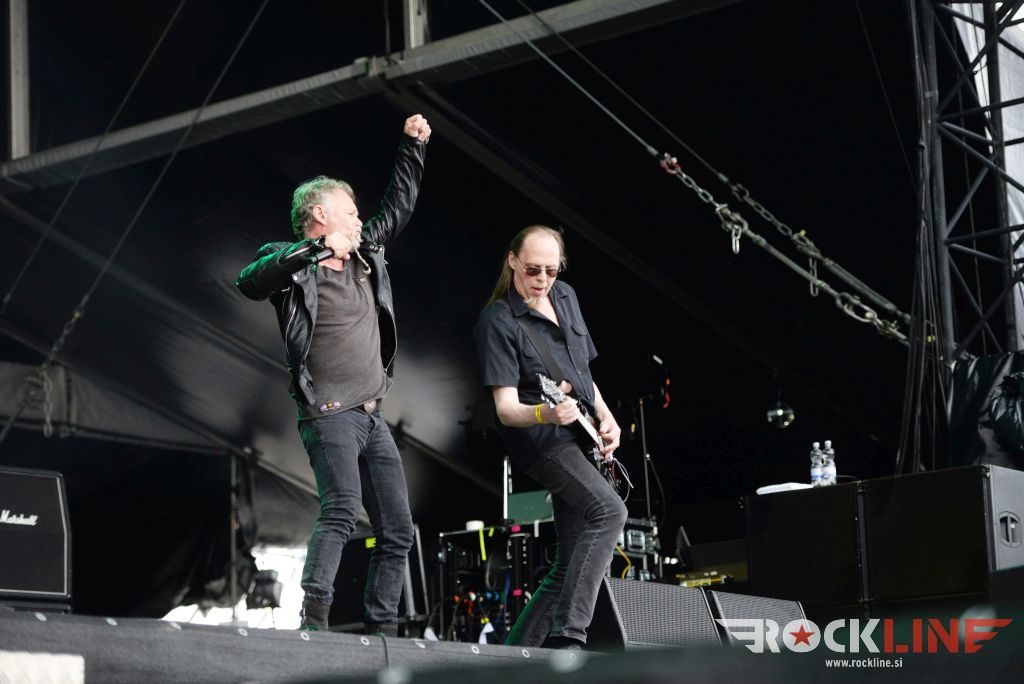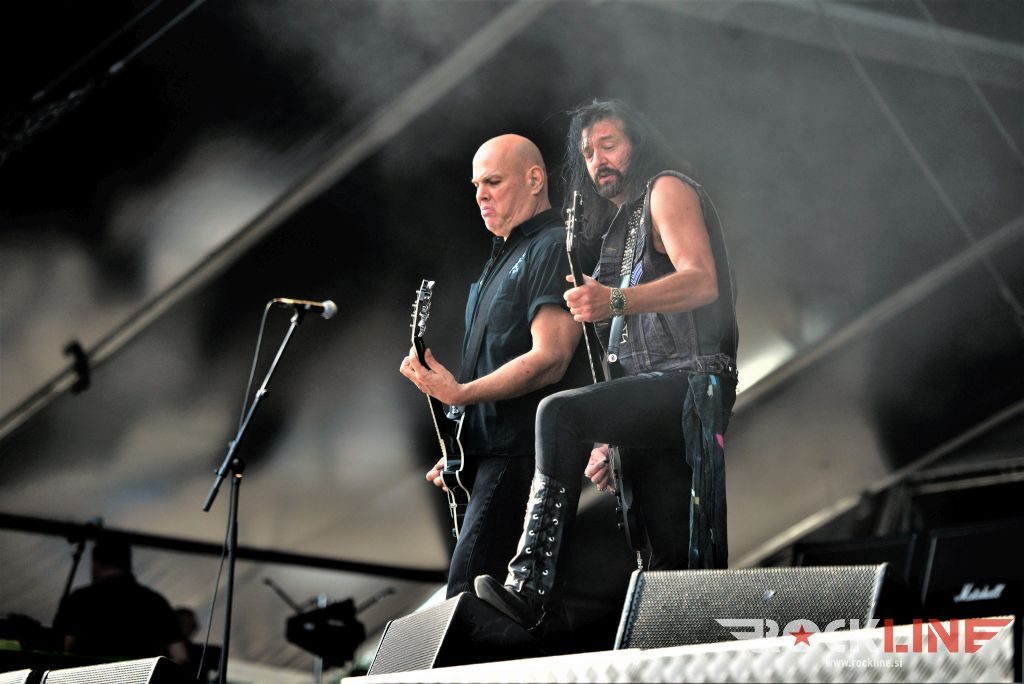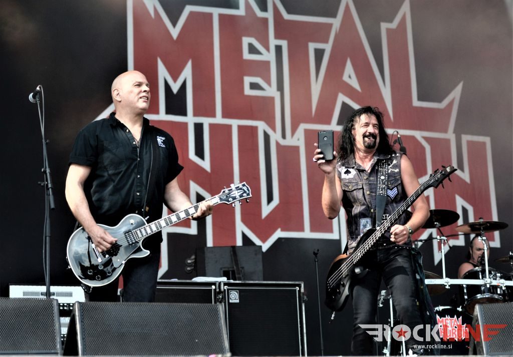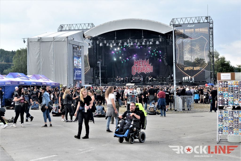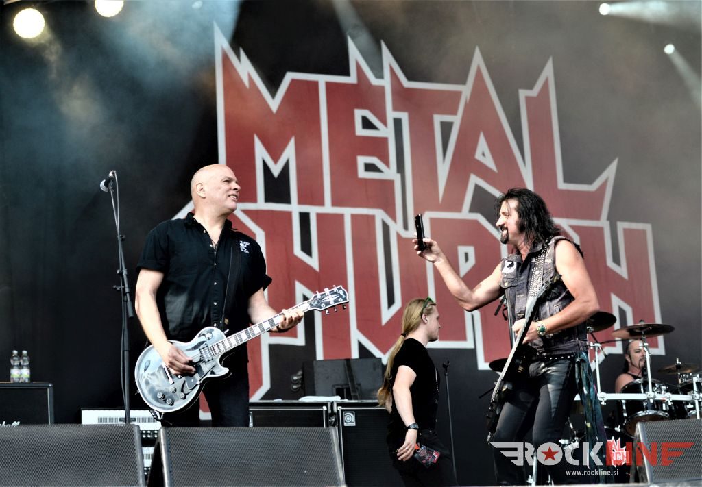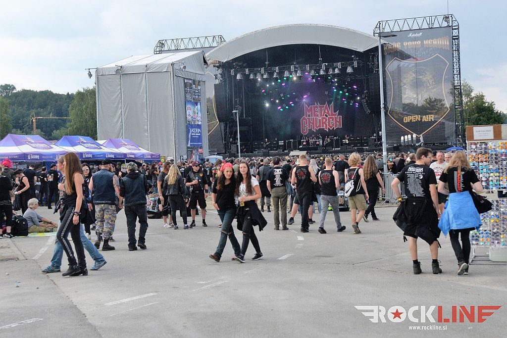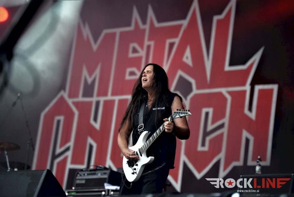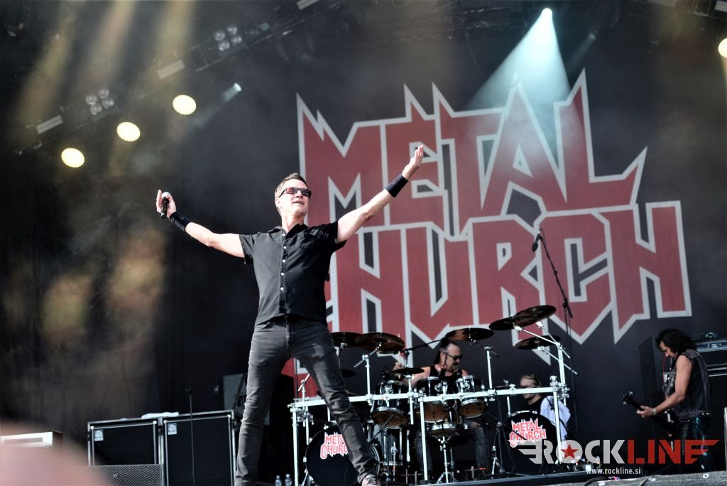 Sledil je nastop še ene kultne ameriške heavy metal zasedbe Metal Church, ki z vrnitvijo pevca Mikea Howea doživljajo pravi preporod. Bend je tako v presledku dveh let nanizal dva nova studijska albuma, aktualnega »Damned If You Do« prav v lanski jeseni. Skupino vodi neomajni »riffmeister« Kurdt Vanderhoof, na bobnih se je v ekipo vključil nekdanji W.A.S.P. bobnar Stet Howland – spomin na preteklo skupino ohranja njegova naličenost okrog oči, tu je izkušeni basist Steve Unger in mlad,i a silno agilni kitarist Rick Van Zandt, s katerim se je skupina predstavila pred leti na tolminskem Metaldays festivalu, ko je pel v skupini še Ronnie Munroe. Skratka. Set lista je to pot prikazala bolj kompleksno Vanderhoofovo plat komponiranja. Vanderhoof je sicer večplastno obtesan glasbenik, pravzaprav se glasbeno ne omejuje, to pa odraža tudi večkrat razgiban razvoj kompozicij, čeprav pripadajo Metal Church sicer okosteneli stari šoli metala. Tako je bend postavil v središče najnovejši izdelek »Damned If I Do« s katerega je izvedel v svežnju desetih skladb naslovno, By the Numners in The Black Things. En album »v rikverc«, se pravi predlani izdani album »XI«, je zastopala »Needle And Suture«, ki jo je bend odigral takoj drugo po vrsti. Skupina je vrnila v repertoar tudi nekaj več materiala iz obdobja, ko je glavne vokale za Michaelom Wayneom v ekipi prevzel Howe in sicer vedno vžigajočo »Hanging In Balance« klasiko Gods Of A Second Chance ter dve »Blessing in Disguise« točki, se pravi Badlands ter sklepno Fake Healer. Bend je pretežno statičen na odru, sploh oba kitarista, z Vanderhoofom na čelu, medtem ko je to statičnost povsem razbil hiperaktivni Howe, ki je pretekel kar se preteči da in preznojil hektolitre potu. Obrazna zariplost ter napete vratne žile v popoldanski pripeki so o tem nazorno pričale. Howe je sicer izvrstno vreščal, zadel vse najvišje lege, čeprav mu je prav pred koncem slišno pobralo nekaj moči. Izmed kultnih klasik se je bend lotil »Metal Church« klasike, sicer fenomenalne Beyond the Black, medtem ko sta ji delali družbo še dve »The Dark« kompoziciji, epska mini suita Watch The Children Pray ter Start The Fire. Bend stoji za svojimi avtorskimi stvaritvami nove dobe in to je glavno. Na odru vidno uživa in kemija, ki jo izžareva je briljantna. Kup hecov, med drugim tudi snemanje s smart phoneom basista Stevea Ungerja, ki je v tem nagajivo pristopicljal povsem do Vanderhoofa. Skratka. Bend seva izredno vedrino. Za še kakšno klasiko je skupini zmanjkalo časa, tako da jo bomo morali loviti na kakem izmed klubskih špilov. Upajmo, da se pojavijo na tleh stare celine znova čimprej, čim bliže in seveda na čim daljši turneji!