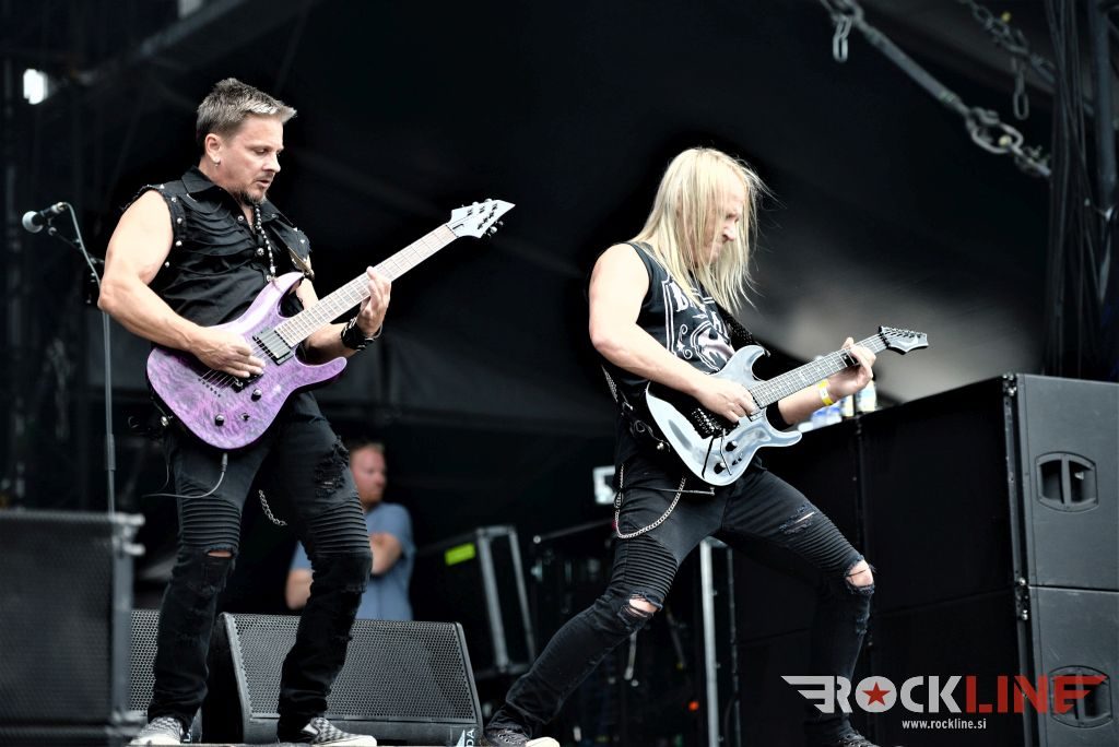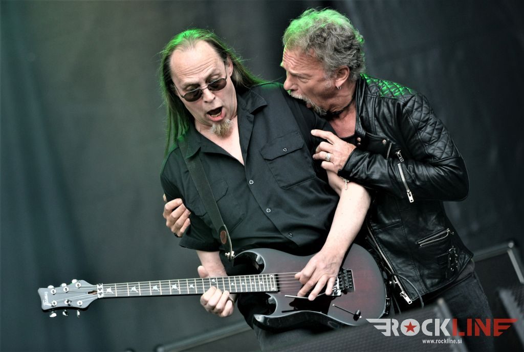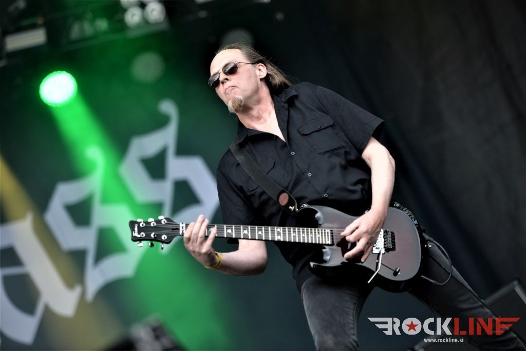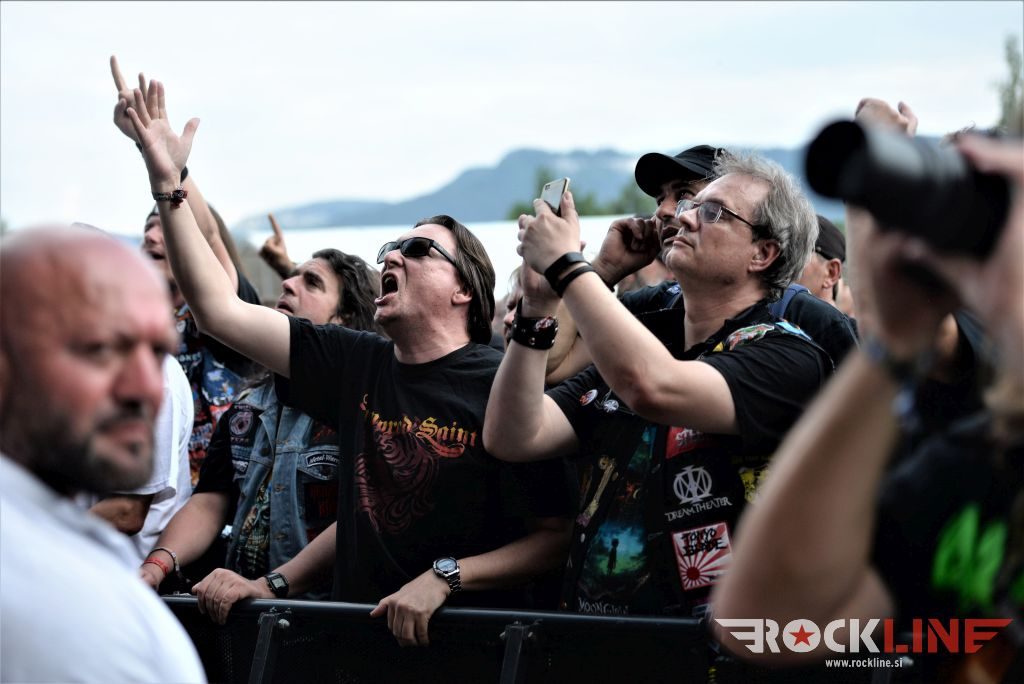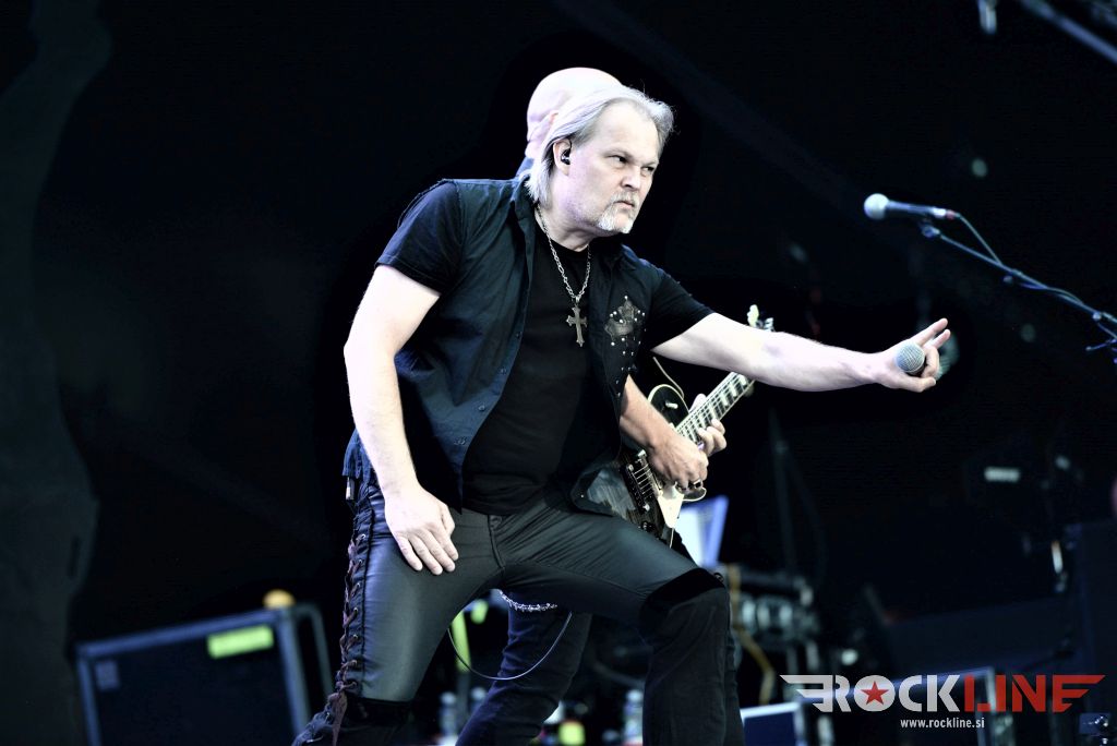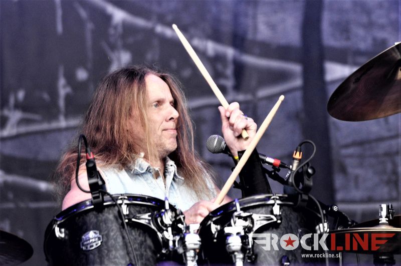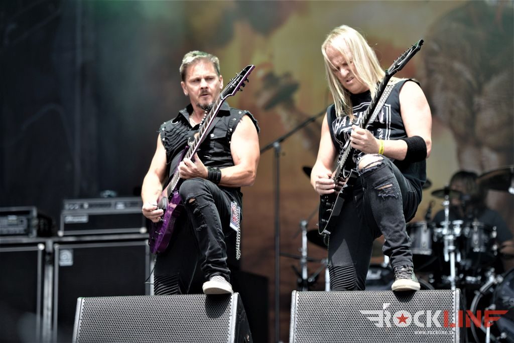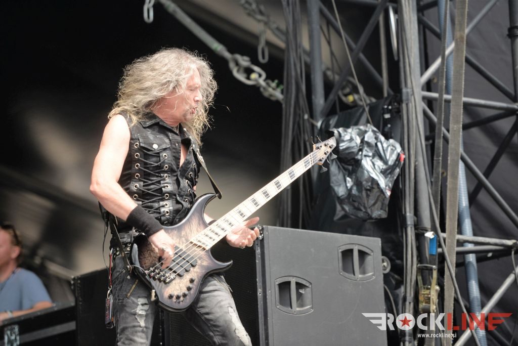 Sledil je nastop še ene kultne ameriške heavy metal zasedbe Metal Church, ki z vrnitvijo pevca Mikea Howea doživljajo pravi preporod. Bend je tako v presledku dveh let nanizal dva nova studijska albuma, aktualnega »Damned If You Do« prav v lanski jeseni. Skupino vodi neomajni »riffmeister« Kurdt Vanderhoof, na bobnih se je v ekipo vključil nekdanji W.A.S.P. bobnar Stet Howland – spomin na preteklo skupino ohranja njegova naličenost okrog oči, tu je izkušeni basist Steve Unger in mlad,i a silno agilni kitarist Rick Van Zandt, s katerim se je skupina predstavila pred leti na tolminskem Metaldays festivalu, ko je pel v skupini še Ronnie Munroe. Skratka. Set lista je to pot prikazala bolj kompleksno Vanderhoofovo plat komponiranja. Vanderhoof je sicer večplastno obtesan glasbenik, pravzaprav se glasbeno ne omejuje, to pa odraža tudi večkrat razgiban razvoj kompozicij, čeprav pripadajo Metal Church sicer okosteneli stari šoli metala. Tako je bend postavil v središče najnovejši izdelek »Damned If I Do« s katerega je izvedel v svežnju desetih skladb naslovno, By the Numners in The Black Things. En album »v rikverc«, se pravi predlani izdani album »XI«, je zastopala »Needle And Suture«, ki jo je bend odigral takoj drugo po vrsti. Skupina je vrnila v repertoar tudi nekaj več materiala iz obdobja, ko je glavne vokale za Michaelom Wayneom v ekipi prevzel Howe in sicer vedno vžigajočo »Hanging In Balance« klasiko Gods Of A Second Chance ter dve »Blessing in Disguise« točki, se pravi Badlands ter sklepno Fake Healer. Bend je pretežno statičen na odru, sploh oba kitarista, z Vanderhoofom na čelu, medtem ko je to statičnost povsem razbil hiperaktivni Howe, ki je pretekel kar se preteči da in preznojil hektolitre potu. Obrazna zariplost ter napete vratne žile v popoldanski pripeki so o tem nazorno pričale. Howe je sicer izvrstno vreščal, zadel vse najvišje lege, čeprav mu je prav pred koncem slišno pobralo nekaj moči. Izmed kultnih klasik se je bend lotil »Metal Church« klasike, sicer fenomenalne Beyond the Black, medtem ko sta ji delali družbo še dve »The Dark« kompoziciji, epska mini suita Watch The Children Pray ter Start The Fire. Bend stoji za svojimi avtorskimi stvaritvami nove dobe in to je glavno. Na odru vidno uživa in kemija, ki jo izžareva je briljantna. Kup hecov, med drugim tudi snemanje s smart phoneom basista Stevea Ungerja, ki je v tem nagajivo pristopicljal povsem do Vanderhoofa. Skratka. Bend seva izredno vedrino. Za še kakšno klasiko je skupini zmanjkalo časa, tako da jo bomo morali loviti na kakem izmed klubskih špilov. Upajmo, da se pojavijo na tleh stare celine znova čimprej, čim bliže in seveda na čim daljši turneji!