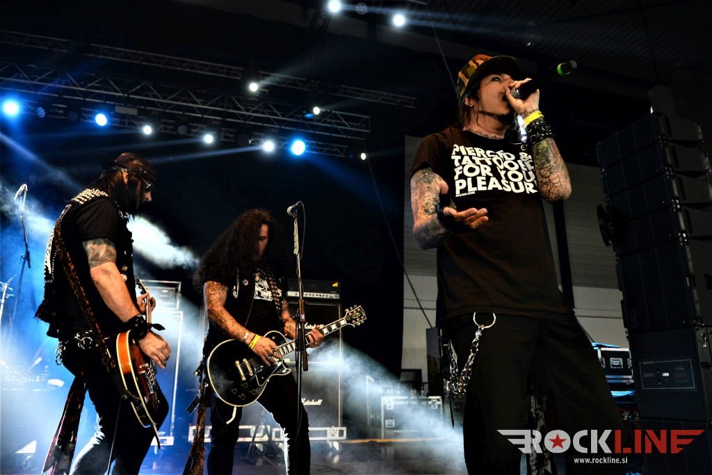 Med koncertom zasedbe Metal Church je oživelo tudi dvoransko prizorišče, kamor so se ob pol šestih popoldan namenili razgrajat nazobčani ameriški hard rock kratkohlačniki in pobalini Kickin’ Valentina. Podrapana oprava, ščepec glam šminkiranja, koketiranje s punkom, staro šolo hard rocka, ki jo je pri Guns N’ Roses nekoč konkretno spopularizirala figura Slasha, a zvok nazobčan, nižje uglašen, masten in s kopreno groova. Vse to dostavlja uvid v skupino, ki je nekako našla svojo ustvarjalno špuro pod »svobodnim« soncem. Kvartet deluje od leta 2013 in ima v žepu dva studijska albuma in EP ter hitro jaše proti tretjemu studijskemu izdelku. Zastopajo ga: vokalist D.K. Revelle, kitarist Heber Pampillon, basist Chris Taylor in bobnar Jimmy Berdine. Svojo predstavo so Kickin’ Valentina podredili predstavitvi sovjega aktualnega studijskega albuma »Imaginery Creatures«.  Naj omenimo tudi to, da bi moral bend nastopiti tu na Bang Your Headu že lansko leto, a je v zadnjem hipu odpovedal svoj nastop. Navkljub prekrivanju s koncertom Metal Church, se je v dvorani zbral kar lep kup firbcev, ki je bil priča togotni odrski predstavi štirih malopridnih mamojebcev, kjer je skrbel za dobro energijo zlasti nabriti vokalist D.K., s čepico poveznjeno preko čela in na oči, pardon temnih Ray Ban očalc in v vokalnem oziru nemalokrat spomnil na Killcode vokalista Toma Morriseya. Bend, ki torej obeta in bend, ki bo, v kolikor bo zdržal v takšni vnemi, zagotovil tudi prihodnjim generacijam prvovrstno dozo dobrega hard rock žura!