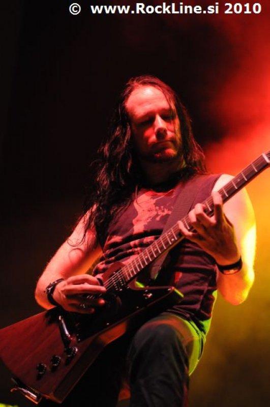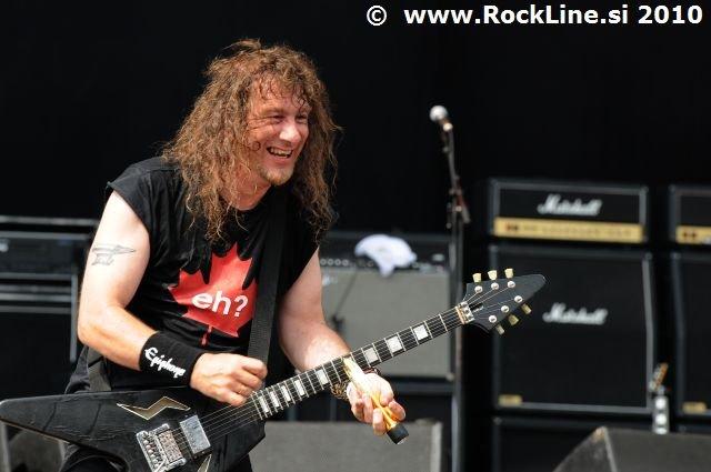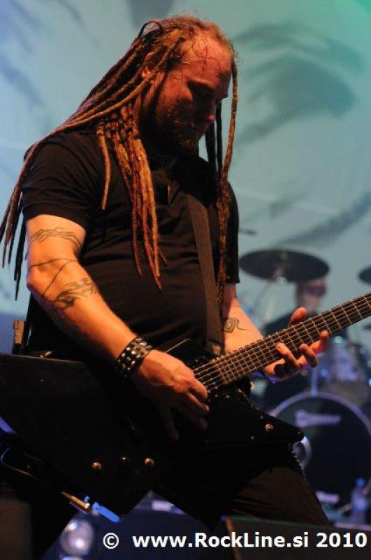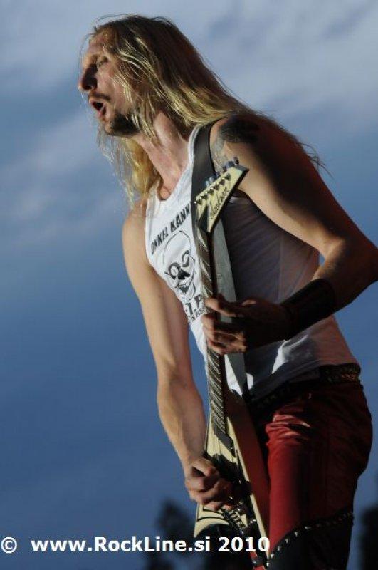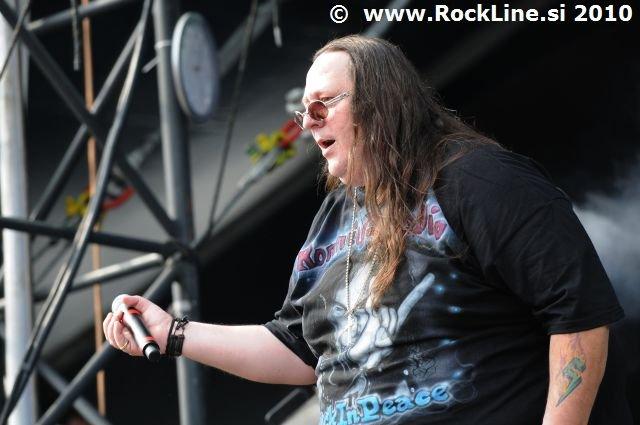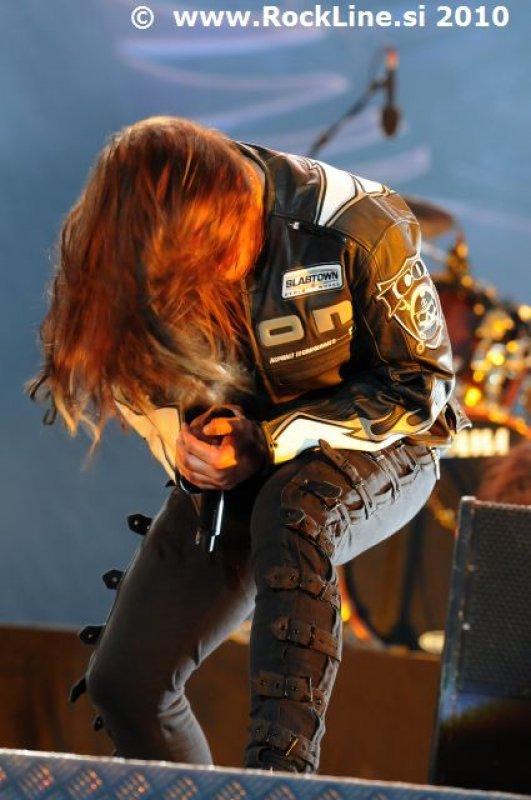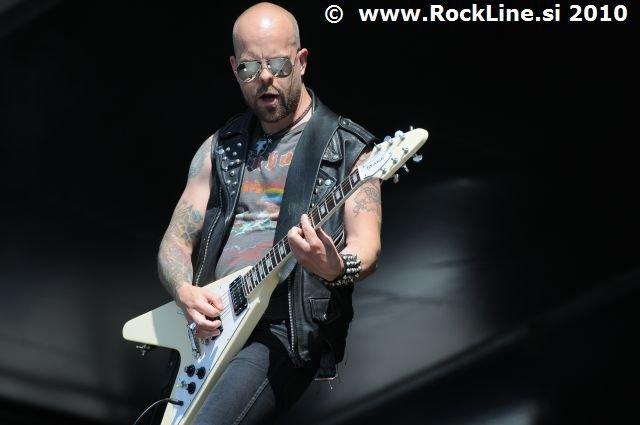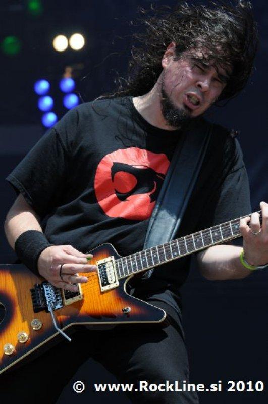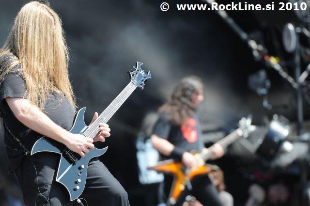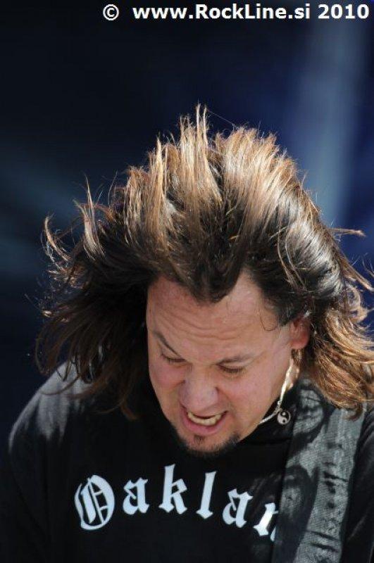 Če imaš v žepu albuma, kot sta “Forbidden Evil” in “Twisted Into Form” res, ne gre varčevati s strelivom, mar ne? Kvintet, ki je prelil krepko litražo znoja sredi neznosne opoldanske pripeke je usekal z Infinite (“Twisted Into Form”) ter pri albumu ostal skozi prve tri skladbe. Je še kaj lepšega, kot spremljati fanatično delo obeh kitaristov Locicera in Smytha, ki z nadnaravno hitrostjo drvita preko kitarskih vratov, ko se kar kadi od vse plejade udarjenih tonalitet, najbolj odštekanih kombinacij soliranja? Če lahko kje zares nad vsem uživamo, ko je govora o Forbidden, so to potem resnično kitarske solaže (“Dobro jutro!” ljubitelji Heathen in Testament). Russ Anderson, ki je po vsej verjetnosti najbolj trpel na soncu izmed članstva ekipe, to pot niti enkrat ni uporabil “cat walka”, pač pa se je bolj kot ne gugal v senci skozi 50. minut na glavnem odru, pokrit s sončnimi očali. “Rdečkar” kot je, gotovo ve, da zanj ni najbolje, če se nastavlja sončnim žarkom sredi poldneva. Russ je odpel suvereno, sicer ne najbolj silovito, kot bi človek pričakoval, a povsem zadovoljivo.