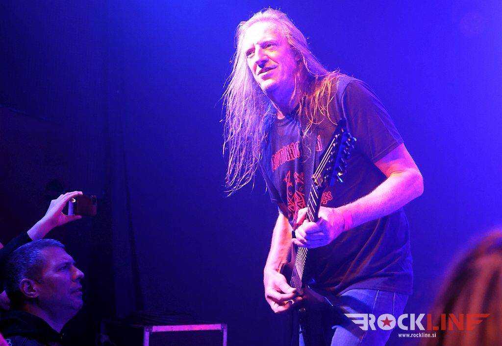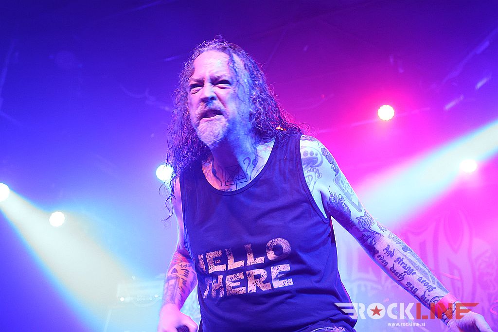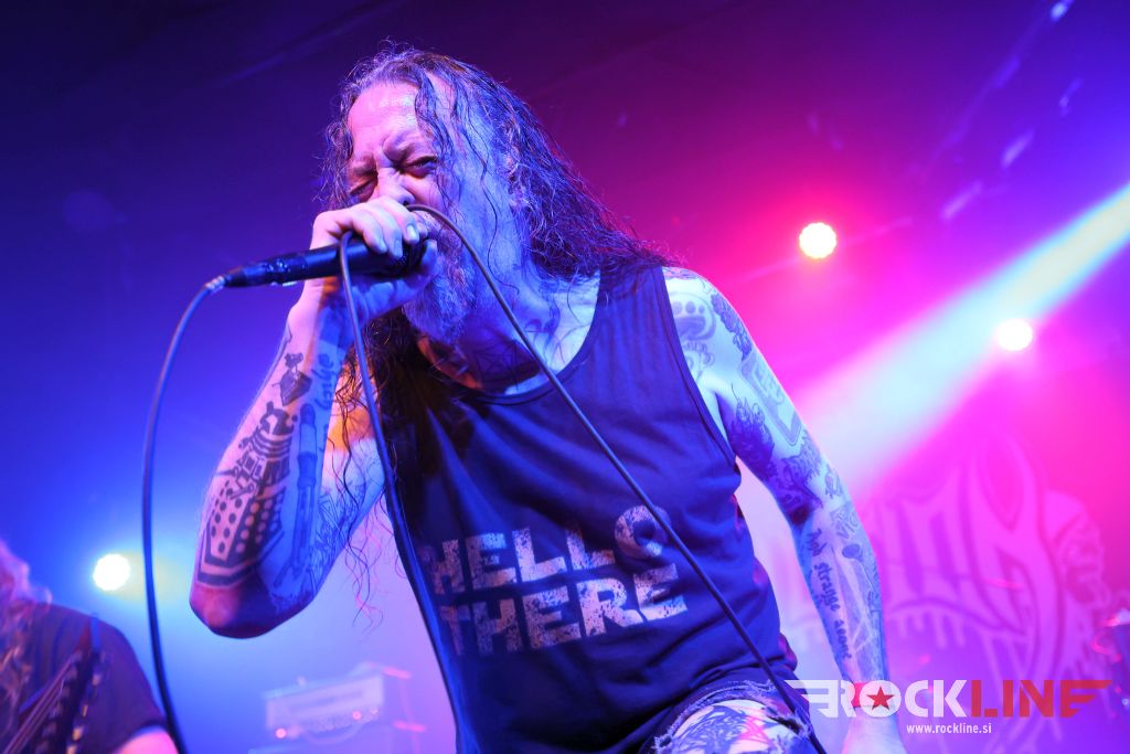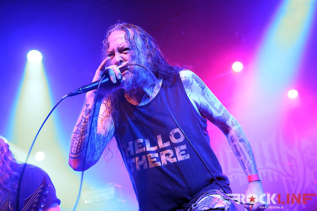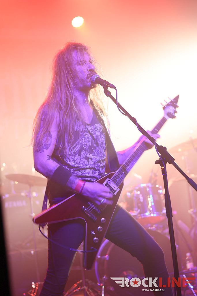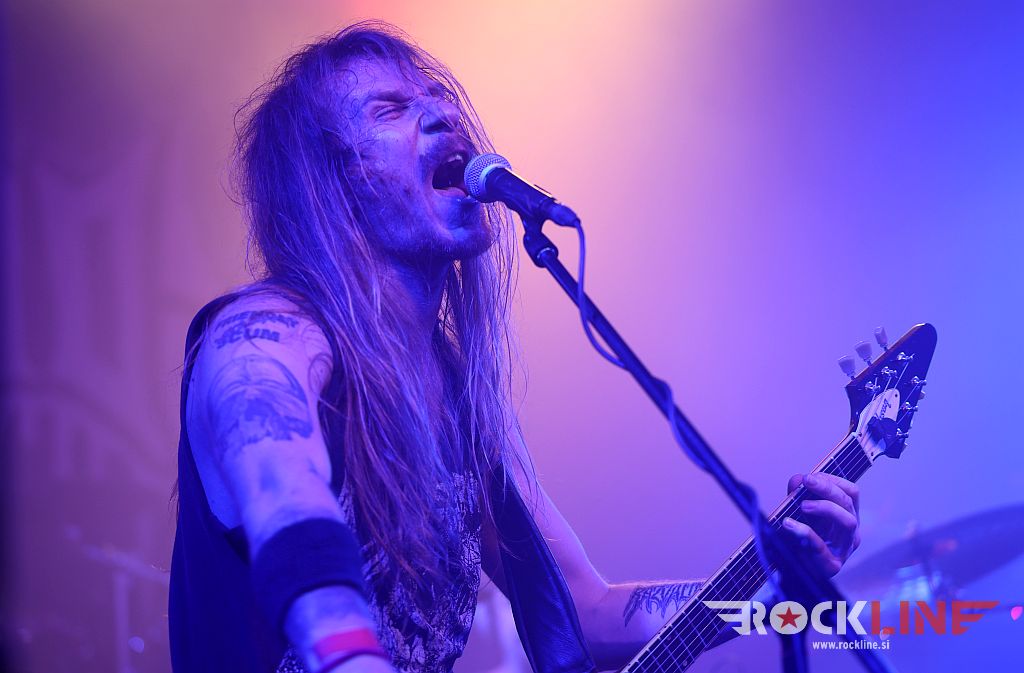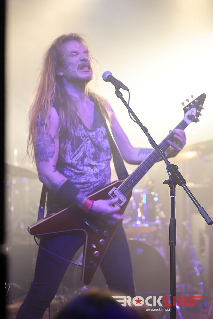 In Benediction? Ura je 22.30 h! Kvintet je dostavil natanko to kar veleva mantra ‘old school’, ki jo je legendarni vokalist Dave Ingram med koncertom neštetokrat ponovil. Serija strupenih fraz, podprtih s peklenskim delom bobnov, oziroma ritem linije, ki ti ne pusti dihati niti za hip. Ingram, pa čeprav na predzadnjem špilu turneje, vokalno suveren, prodoren in uničujoč. Njegov growl je bičal neusmiljeno, ko je oživljal serijo klasik skupine, pa tudi najnovejši material iz pravkar izdanega desetega albuma “Ravage of Empires” !