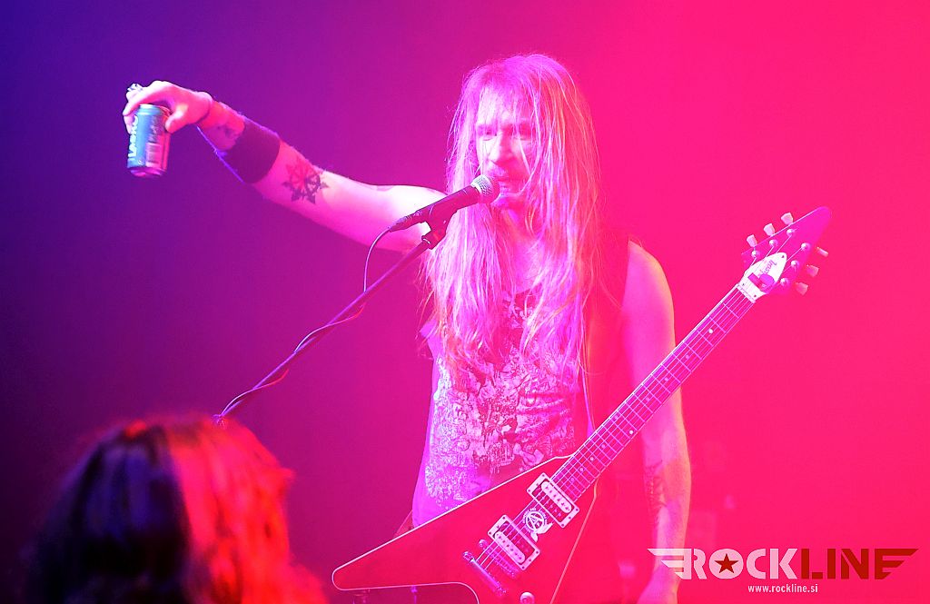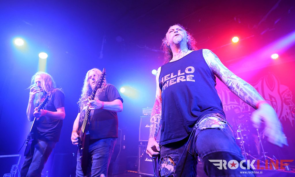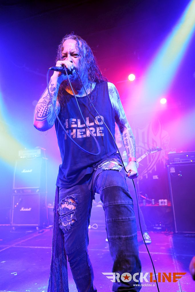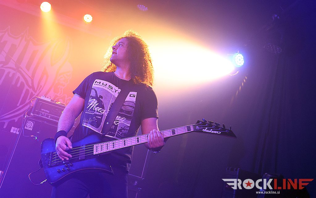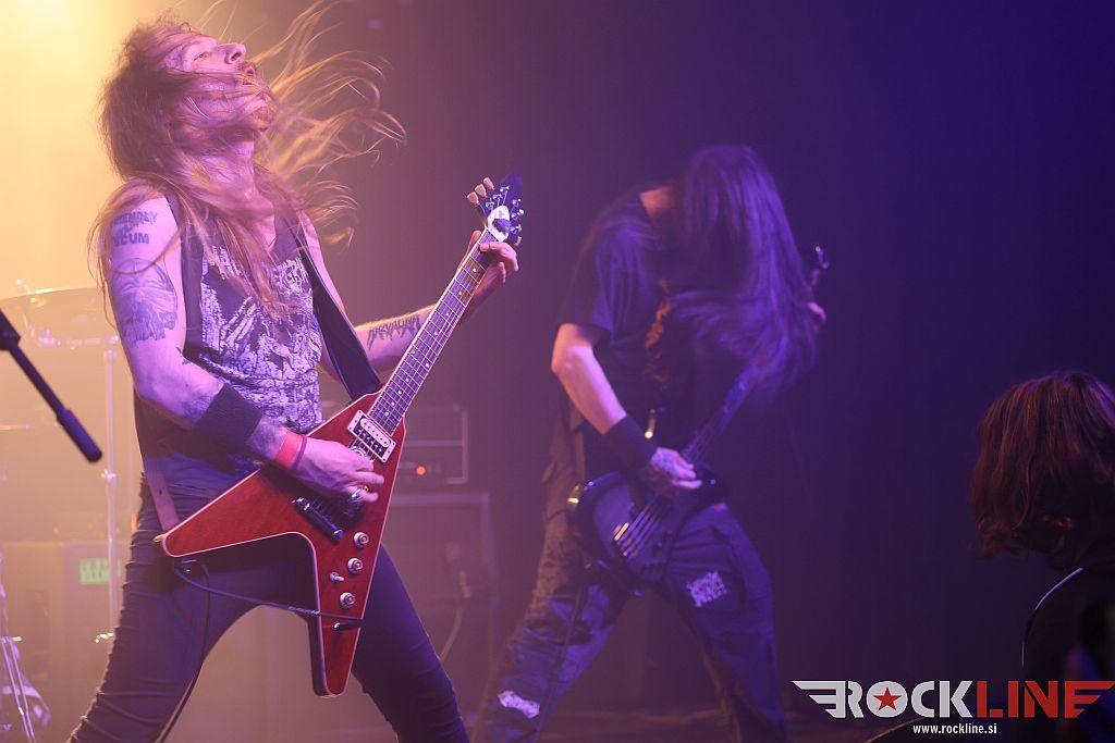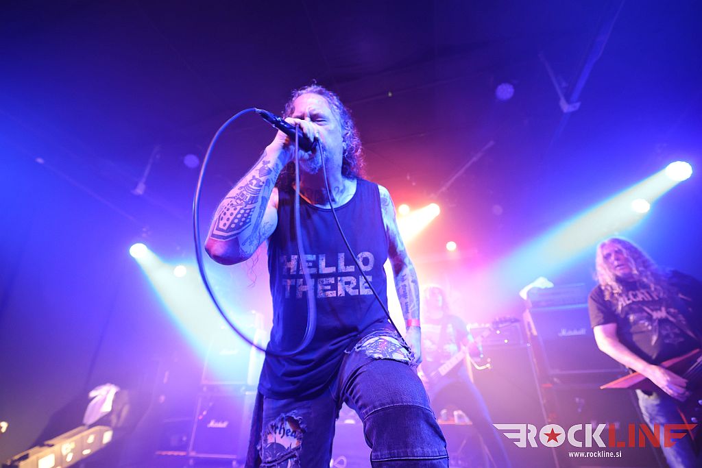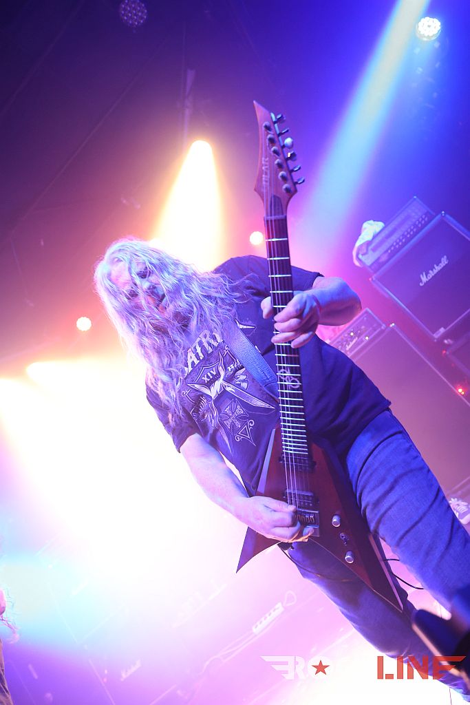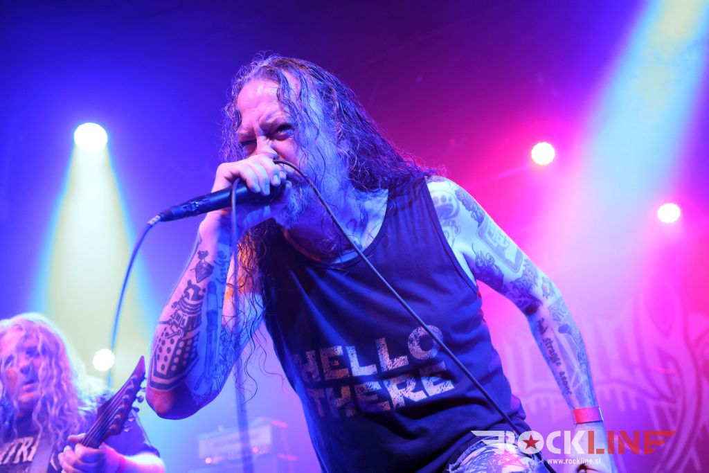 In Benediction? Ura je 22.30 h! Kvintet je dostavil natanko to kar veleva mantra ‘old school’, ki jo je legendarni vokalist Dave Ingram med koncertom neštetokrat ponovil. Serija strupenih fraz, podprtih s peklenskim delom bobnov, oziroma ritem linije, ki ti ne pusti dihati niti za hip. Ingram, pa čeprav na predzadnjem špilu turneje, vokalno suveren, prodoren in uničujoč. Njegov growl je bičal neusmiljeno, ko je oživljal serijo klasik skupine, pa tudi najnovejši material iz pravkar izdanega desetega albuma “Ravage of Empires” !