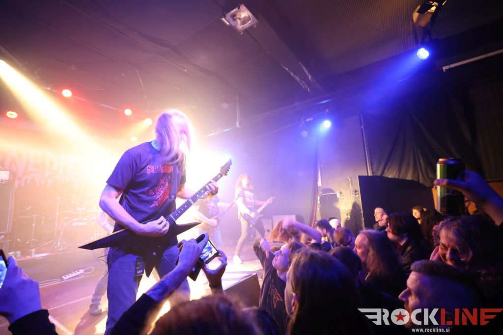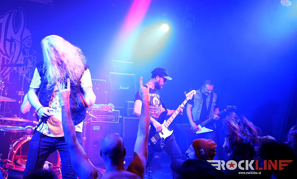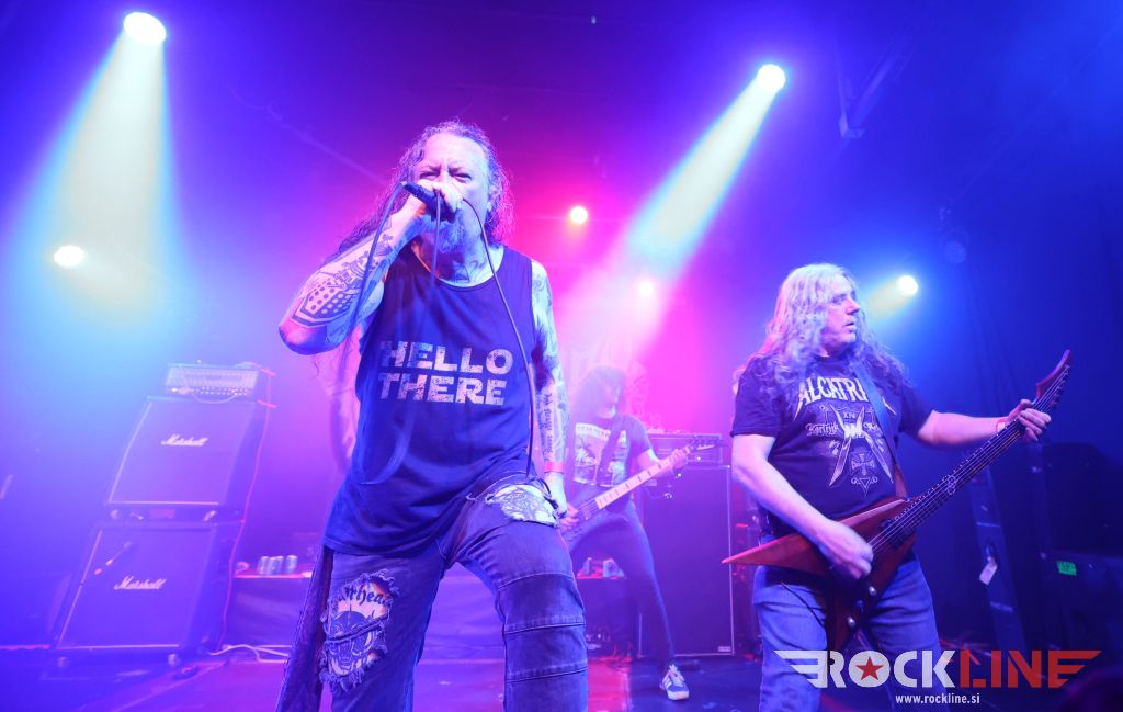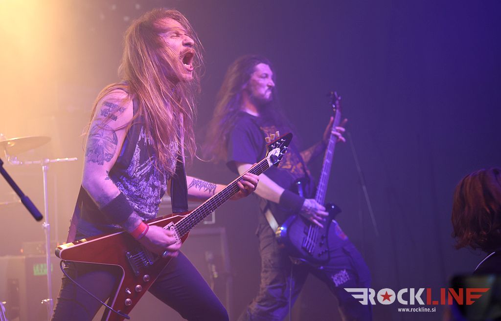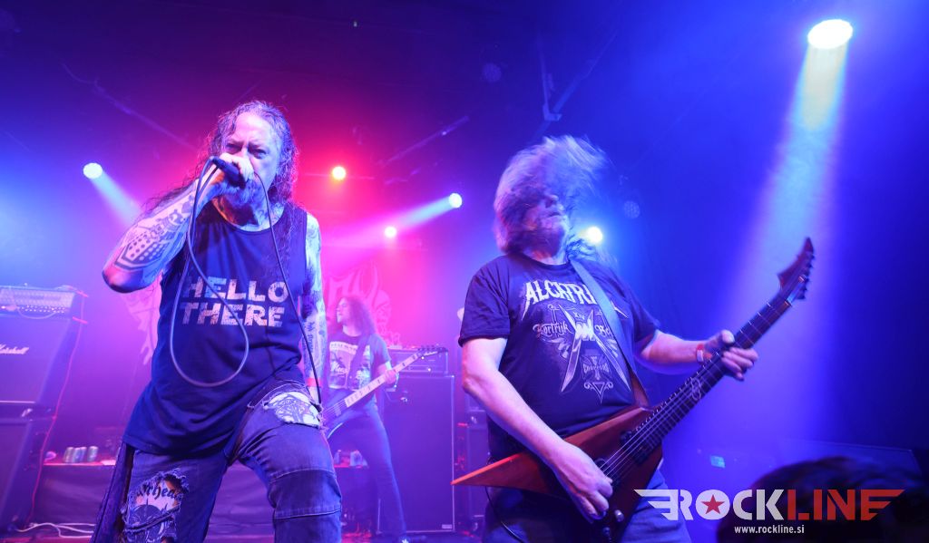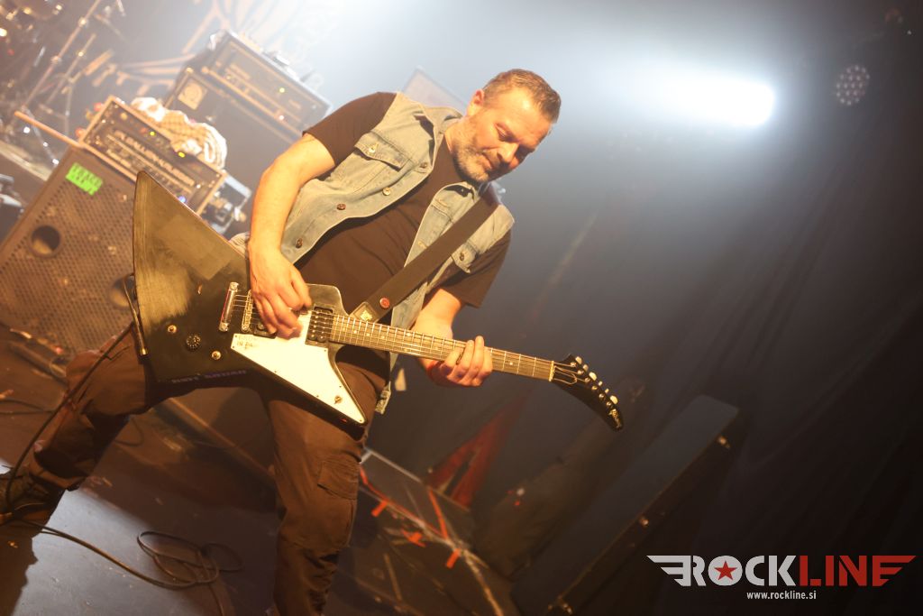 Prav v letošnjem aprilu so izdali še svoj deseti studijski album “Ravage of Empires” (Nuclear Blast Records) in obisk njihovega koncerta v Solkanu je za našo ekipo predstavljal ne le vrsto dolžnosti, pač pa tudi čast! Spet sva zamujala na prizorišče. V Mostovni nisem bil tako dolgo, da se je vmes spremenil prometni režim in klasična verzija za dosego cilja, ko zaviješ tik pred mejnim prehodom na Kolodvorsko, se je sfižila. Okej! Pa sva prišla preko Italije. Po poti čez Staro Gorico. Ni problema, a dragocene minute so curljale dalje. Vendar sva tu. Vskočiva ravno na zadnji komad slovenskih revival zastavonoš death metala iz Ljubljane, Razvalina. Vodi jih Gašper Flere. Gapa je danes na slovenski sceni tako rekoč ‘true survivor’. Kdor se spominja thrash metalcev Panikk, še posebej pa leto njihovega vznika in velikega slovenskega metalskega razcveta v tistem času, ve zakaj je temu tako. A so vse te slovenske skupine, ki so se navdihovale nad starimi časi thrash metala in death metala, z izjemo npr. Eruption, in še koga, razpadle in utonile, oziroma tonejo v pozabo. A ne Gapa. Po Panikk, je ustanovil zasedbo Razvalina in z njo obstal. Trio, ki ubija v sozvočju jurizdikcije navdihovanja s staro šolo metala in trio, ki je v dobre pol ure lomastil. Ko si prispel v prvo vrsto, je bila zanimiva ugotovitev ta, da je narod naredil do skupine tisto nehvaležno, a vljudno – vsaj dvometrsko distanco od roba odra in seveda vljudno užival v brutalizaciji prizorišča, ki ga je zajela predstavitev drugega EP-ja skupine z naslovom “Zatirani” (2024). Revitalizem stare šole brutalnih sfer death metala je izpolnil pričakovanja. Gapa je odličen frontman, karizme mu ne primanjkuje, srčnosti še manj. Trio je opravil delo z veliko odliko, izkazal odlično mero uigranosti in že uvodoma pošteno nakuril publiko.