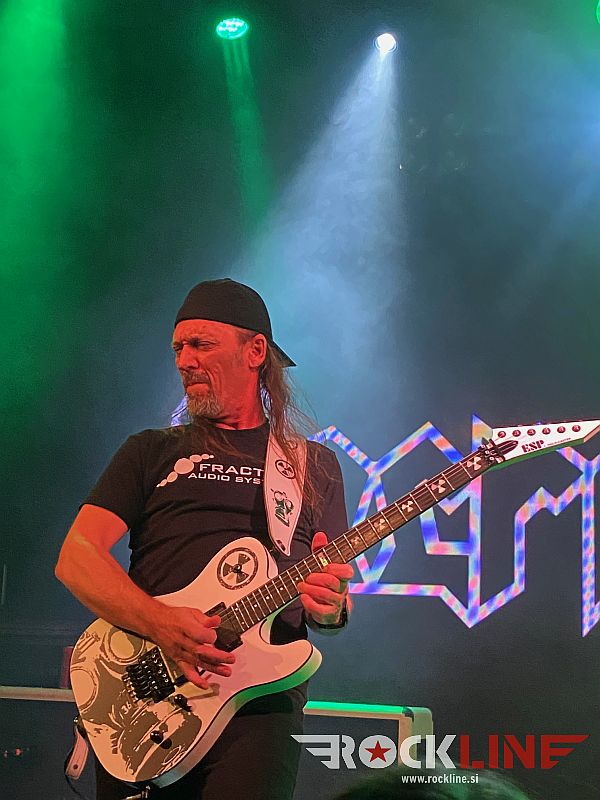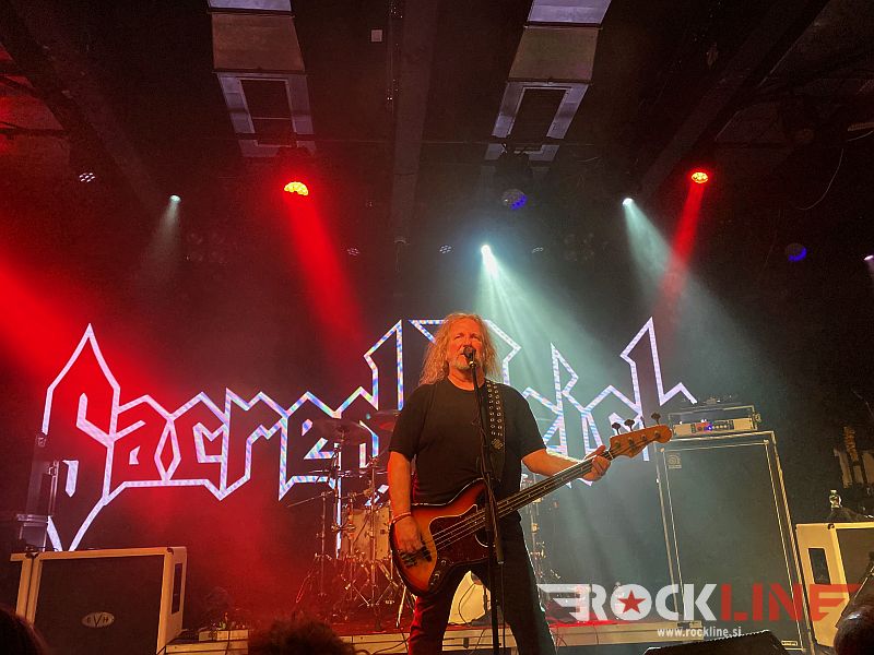 Kot tretji so se povzpeli na oder Sacred Reich. Še ena ekipa bibličnih razsežnosti, ko govorimo o thrash metalu. Kvartet zastopata danes dva originalna člana basist in vokalist Phil Rind in glavni kitarist Wiley Arnett (hja – če bi imela Dr. House in Ian Anderson skupaj sina, bi mu bilo gotovo ime Wiley Arnett), postavo za zapolnjujeta še prekaljeni in velecenjeni bobnarski mojster Dave McClain (znan po sodelovanju z Machine Head) ter mladenič in (pretežni ritem) kitarist Joey Radziwill. Tudi Sacred Reich so si privoščili med letoma 2000 in 2006 pavzo, potem pa se reaktivirali ter vrsto let vzdrževali vsaj koncertno kontinuiteto, vse dokler nismo leta 2019 naposled le prejeli njihov peti studijski album »Awakening« (RockLine recenzija). Publika je do prihoda Sacred Reich na oder izgubila nekaj obiskovalcev – očitno so nekateri res prišli v prvi vrsti zaradi Death Angel, čeprav je ohranjala Cvetličarna še naprej več kot zavidljivo polnost. To niti ne čudi. Četudi generacijski vrstnici, sta obe skupini svojevrstni in precej različni glasbeni beštiji. Se je pa zato dalo malo lažje dihati. Mosh piti so sledili tudi v nadaljevanju – tako kot med Death Angel, deležni smo bili celo poizkusa neuspešnega ‘stage dive-a’ (s konkretno trdim pristankom). Sacred Reich so z izjemo materiala iz albuma »Heal« (1996) uvrstili v uro in petnajst minut material iz preostalih petih albumov ter seveda nadobvezno EP-ja »Surf Nicaragua«. Rind, ki je v marcu 2022 prestal težjo infekcijo dihal, je ujel odlično vokalno formo. Njegov čisti in avtoritativni vokal še vedno strese in zgrabi, ko se loteva nepopustljivega bevskanja. McClain, ki je bil založen s pol manj tom bobni, kot pred njim Carroll, je naslavljal med koncertom izjemno točnost in preciznost. Ni pozabil na dva kotla. Arnett v vlogi glavne solo kitare ostaja izvedbeno standarden, odlično pa se je vklapljal tudi nasršeni mladenič Joey, ki je na prvi frontni črti med nastopom prinašal na oder največ kinetike. Seveda je prednjačil v obilnem prebitku material izdan in posnet med letoma 1988 in 1993, vanj pa so Sacred Reich vpeli še tri točke najnovejšega albuma »Awakening«.