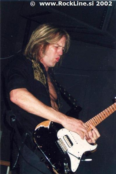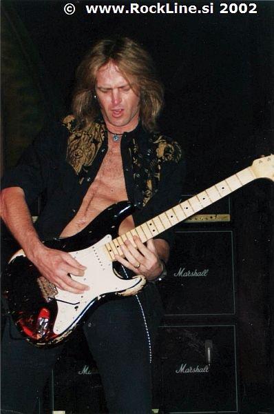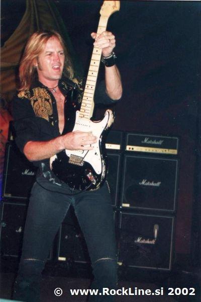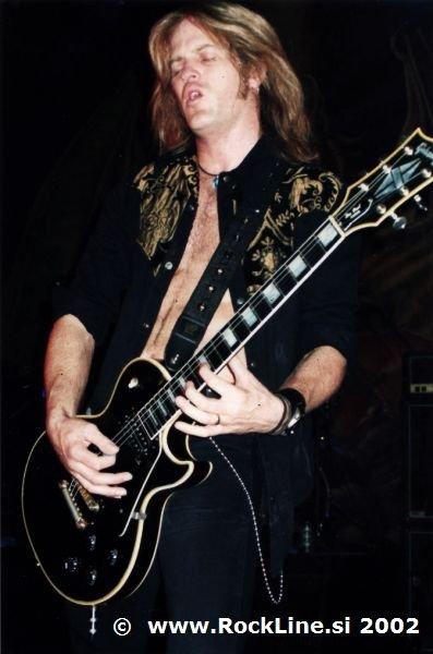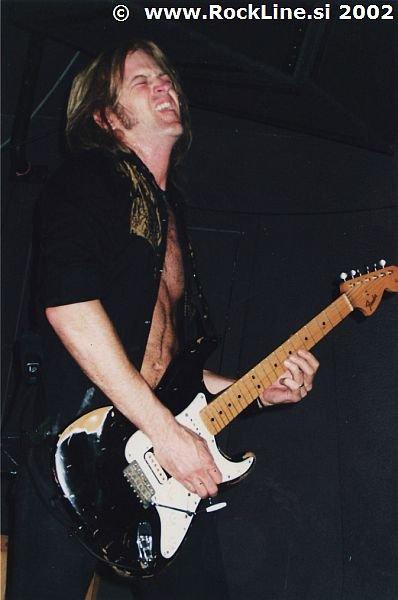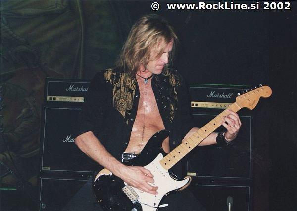 No vendar, kljub šoku za šokom, ki smo ga prestajali ob izjemni set listi (madona, le pomislil sem ravnokar na to in že me je oblila kurja polt)… Dougova solo točka namreč. Turkizna zdrilana, zlizana, olupljena startokasterca je bila že s samo pojavo na odru kreacija, ki je ponujala več kot le kos lesa s šestimi žicami in vgrajenimi magneti. In ko je Doug začel… To je to. Vživeto, popolnoma vživeto. Ko se človek in inštrument zlijeta v eno. Takšne solo točke ne pomnim. Ne Steve Vai, ne Victor Smolski, ne Y.J. Malmsteen… ma kakšna šolska glasbena “napiflanost”, to odpade. Tu ni prostora za hladnost. Striktno preprosti prvinski občutki. Kako je fant gnetel pull offe, prašil hammering znotraj kvint, se sprehajal z arpeggioti po vratu in okraševal vseskupaj s kratkimi rafali na hitro izmišljenih rifov in izrednega lickinga ter obešanja po tremolu. Poleg je delal katarzične grimase, šobil usta, za konec pa se ulegel na tla s kitaro in skoraj uprizoril pravi seks z njo medtem, ko je izvabljal melodijo iz nje. Doug je bil v takem efektu, da je kitaro z vso silo zalučal nazaj proti svojemu ozvočenju in pod vznožje Simonovih bobnov. “Na dobila si svoje, katera je sledeča na vrsti!?!?” Tooooo, devastacija do konca!!!!