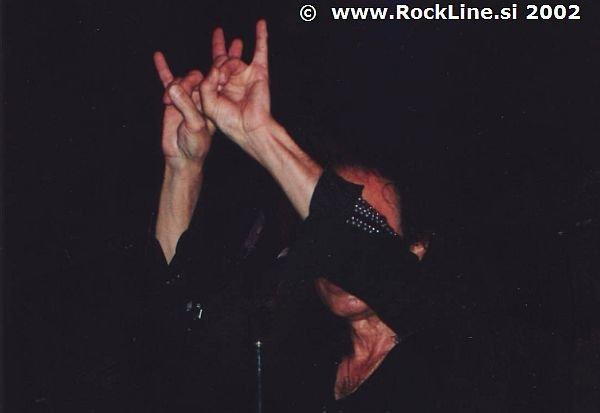 Potem so imeli roadyji precej dolg šov. Seveda se bojijo in v celoti upoštevajo avtoriteto njegove ekselence Ronnieja Jamesa Dia, ki rad ponori, če kdaj kakšen od zvočnikov vsaj malo in nehote prdne, kot ne bi smel. No, skozi gosto meglo in ob zvokih intra so se člani skupine prikobacali na oder. “Killing The Dragon”, takoj mravljinci. Uf, ta rif!!! Dio, pred menoj je Dio! 60 letni možakar, metermož, ki vriskne, da nas sleče iz kož. In tudi tokrat je bil Dio kot Dio izpred tridesetih let. Takoj sem zaznal magijo med legendo Jimmyjem Bainom (ex – Rainbow) in Ronniejem na odru. Dva dobra stara kompanjona med katerima ni nobene skrivnosti.