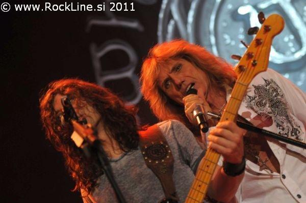Judas Priest so na turnejo kot goste povabili legendarne hard rockerje Whitesnake. Ne nujno najbolj primerna kombinacija, a lepo je bilo videti tudi Coverdale-a in njegovo bando jebačev. Whitesnake so si odrezali debelo uro za predstavitev svojega železnega repertoarja klasik, ki so jih zabelili z nekaj točkami z novega albuma Forevermore. A glede na predstavljeno tudi za Whitesnake ne bi bilo slabo, če bi počasi napovedali svoje slovo. Inštrumentalna četverka je nesporna, drugače tudi ne more biti, če imaš na kitarah imeni kot sta Doug Aldrich in Reb Beach, ki je mojstrsko ponujal sladko-težke hard rock riffe. Tudi ritem sekcija je svoje opravila povsem zadovoljivo, jabolko spora pa je brez dvoma večni mladenič David Coverdale. Ta je prvih nekaj komadov zelo lepo predstavil svoj sladko zapeljivi vokal, ki pa se je kaj kmalu zlomil. In se iz komad v komad lomil vedno bolj in bolj. Ogromno pomoči dobiva Coverdale z mešalke, boleče očitno v višjih legah, sicer pa krevsa in hrešči kot parna lokomotiva. Brez izdatne podpore back-vokalov bi stvar izpadla še bolj ubogo. A Coverdale se ne pač ne da. Zato si lahko tudi v relativno kratkem setu privošči kar dve solo točki, ki pa povrh vsega nista bili niti nič posebnega. Sam sem vsaj od Aldricha pričakoval kakšno bolj premišljeno kitarsko linijo, zato menim, da se je mnogo, mnogo bolje odrezal v vlogi Dio kitarista. Še bolj duhamoren je bil bobnarski solo, ki ni pokazal čisto nič spektakularnega. Vseeno pa je bilo prijetno slišati nesmrtne hite kot so železni, Is This Love, Here I Go Again in Still of the Night, nesramno pa so Whitesnake zrajcali z le nekaj sekundami poredne Slide It In, ki se je prevesila v Fool For Your Lovin’. Odlično pa je izpadla predvsem pretresljiva naslovna skladba novega albuma, balada Forevermore. Whitesnake v letu 2011 tako puščajo precej grenak okus, saj si Coverdale očitno ne more in noče priznati, da je vokalno precej ubog. Nasvet Milana Tarota bi tako lahko danes precej predrugačili: “Nek ne pušta kose kao Dejvid Koverdejl, nego zabrije kosu kao Rob Halford i sluša Đ U D A S P R I ST!”