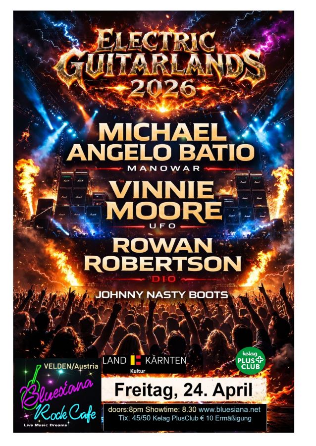 V petek 24. 4. 2026 bodo v sklopu nove evropske turneje na avstrijskem koroškem, v letoviškem mestecu Vrba na Koroškem (Velden Am Wörthersee). točneje v tamkajšnjem svetilniku bluesa rocka in metala – klubu Bluesiana Rock Cafe, nastopili štirje vrhunski, svetovno cenjeni kitarski virtuozi: Michael Angelo Batio, Vinnie Moore, Rowan Robertson in Johnny Nasty Boots.