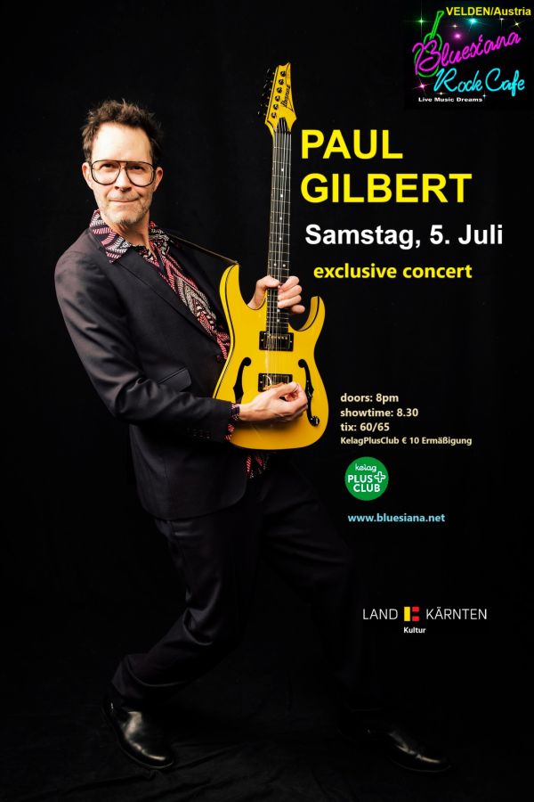 V soboto 5. 7. 2025 bo v avstrijski Vrbi na Koroškem (Velden Am Wörthersee) in tamkajšnjem klubu Bluesiana Rock Cafe, nastopil eden najatraktivnejših svetovnih kitaristov, veliki virtuoz in guru šeststrunske teorije, edinstveni Paul Gilbert. Ime Paula Gilberta je planetu Zemlja znano predvsem po njegovem članstvu v super rock zasedbi Mr. Big ter Racer X. Gilbert bo na tržaškem nastopu predstavljal material svoje dolgožive samostojne kariere v kateri je izdal do tega dne že 18. studijskih albumov (zadnjega med njimi “The Dio Album”, leta 2023), prav tako pa se zna prikrasti v njegov repertoar kakšna izmed klasik njegovih dveh matičnih skupin.