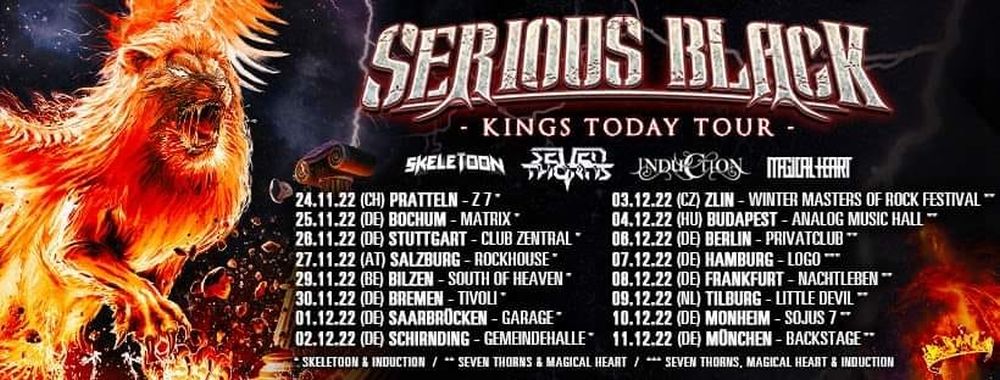 Serious Black, nemški powermetalski kvintet, ustanovljen leta 2014, napoveduje svojo novo turnejo, na kateri bo predstavljal svoj šesti studijski album “Vengeance Is Mine”, ki je izšel v letošnjem letu. Na datumu v Salzburgu, bosta prisotne pred nastopom Serious Black ogrevali skupini Skeletoon in Induction. Pri slednjih igrata kitari Tim Hansen, sicer sin slovitega Kaia Hansena (Helloween, Gamma Ray) ter Marcos Rodriguez, ki je sodeloval z Rage.