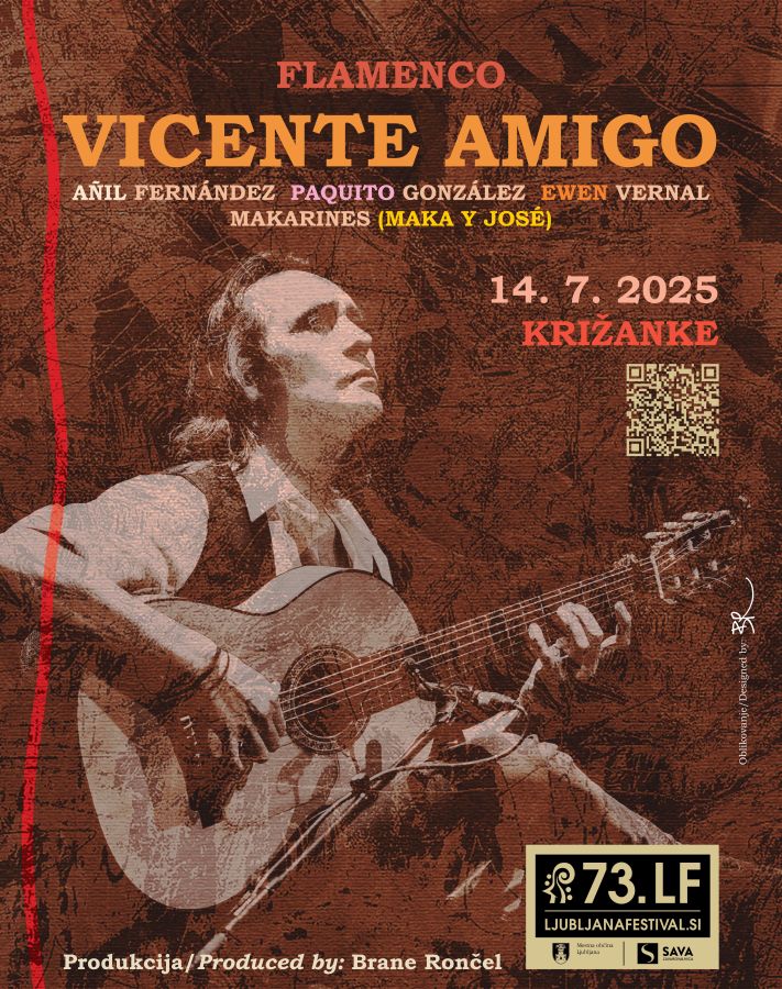 Sloviti andaluzijski flamenko je več desetletij v različnih glasbenih kontekstih na slovenske koncertne odre prinašal virtuoz, eden največjih kitaristov v zgodovini glasbe, vodilni zagovornik novega sloga flamenka in latino-jazz fuzije Paco de Lucia. Zadnjič je pri nas nastopil v sklopu 52. Festivala Ljubljana leta 2004. Vicente Amigo, ki je bil prvič v Sloveniji leta 1999 na povabilo Braneta Rončela in je nastopil v TV-oddaji Izza odra, je danes na Pacovem prestolu. Paco je delal z Johnom McLaughlinom, Alom Di Meolo, Larryjem Coryellom, Chickom Coreo, Vicente ustvarja v družbi glasbenikov, med katerimi so prav tako John McLaughlin, tudi Marcus Miller, Sting, Eliane Elias, Milton Nascimento, Dave Weckl in Tom Kennedy. Je dobitnik množice mednarodnih priznanj kot kitarist in skladatelj. Letos bo to njegov premierni in zaenkrat edini nastop z ustaljeno zasedbo, v kateri bosta dodano vrednost s svežim, sodobnim, slojevitim vokalnim pristopom in ploskanjem, ki nas bo povzdignilo, prispevala mednarodno uveljavljena brata Maka in José Makarines. V Križankah bo vroče, pa ne le zaradi polenih temperatur.