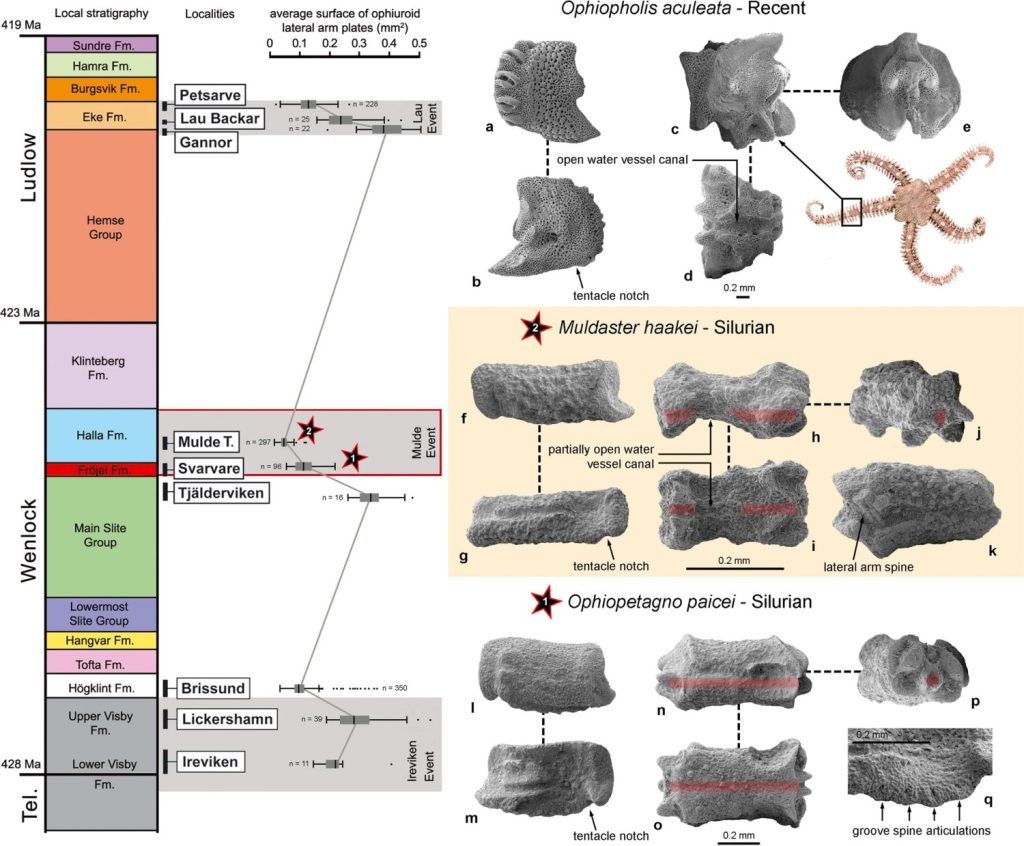 Skica iz znanstvene objave na kateri se nahaja primerjava sistematskih znakov recentne (živeče) vrste kačjerepa vrste Ophiopholis aculeata z obema izumrlima (fosilnima) vrstama kačjerepov Ophiopetagno paicei in Muldaster haakei.
