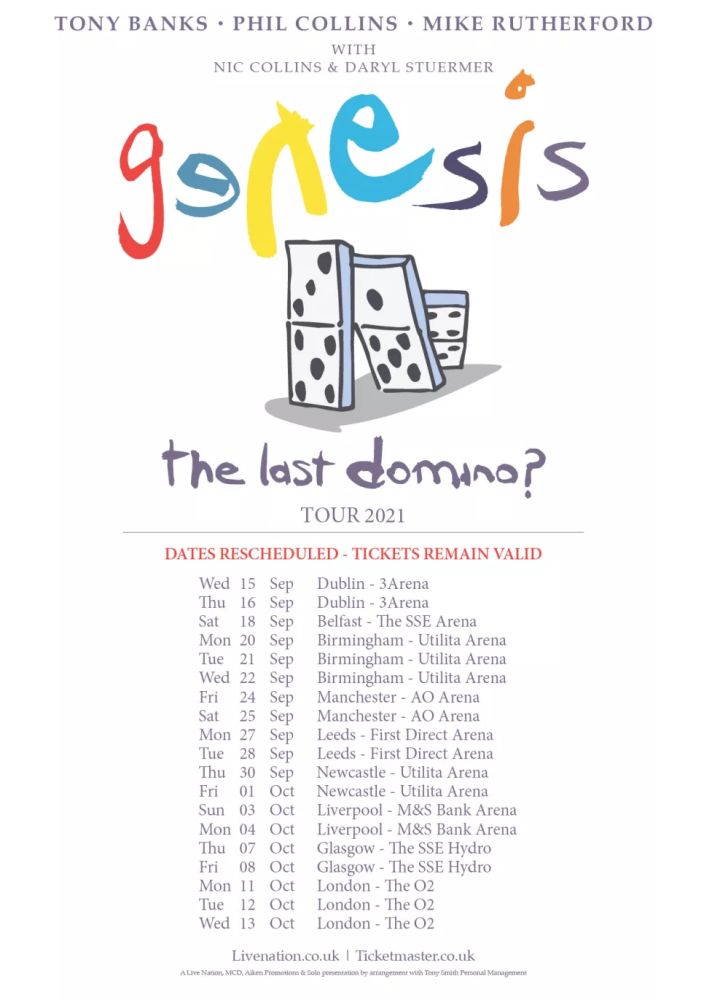 Genesis – ikonska progresivna rock zasedba iz Velike Britanije-, predstavljajo ‘videodražilec’ v zvezi s prihajajočo koncertno “The Last Domino?” turnejo. Ta je bila sprva napovedana že v lanskem marcu in bi se morala odviti v novembru 2020, a so jo Genesis zavoljo Covid-19 situacije po novem prestavili na september 2021.