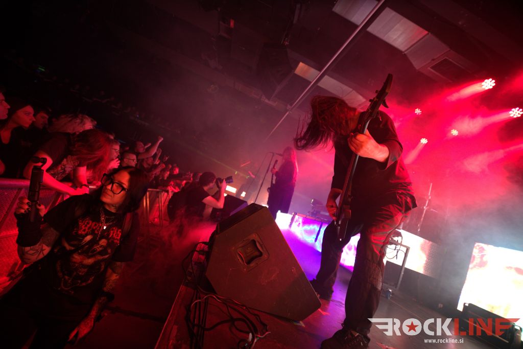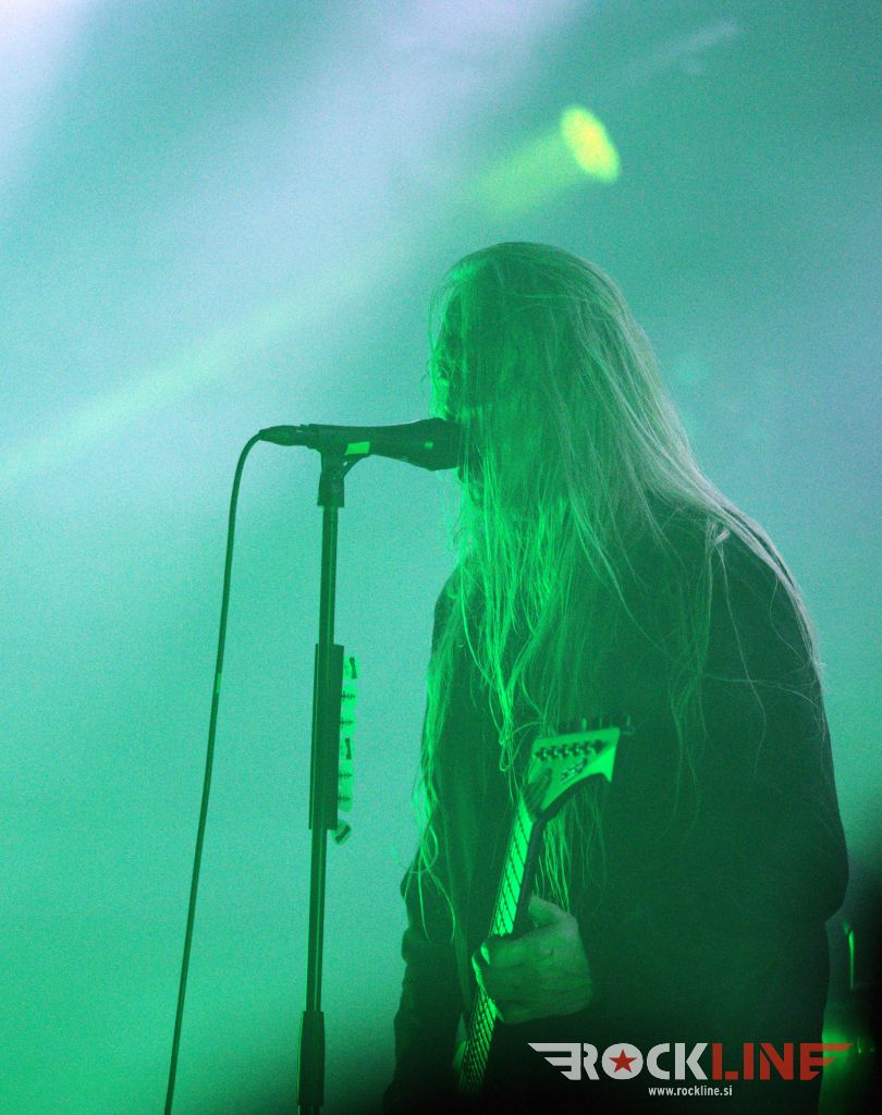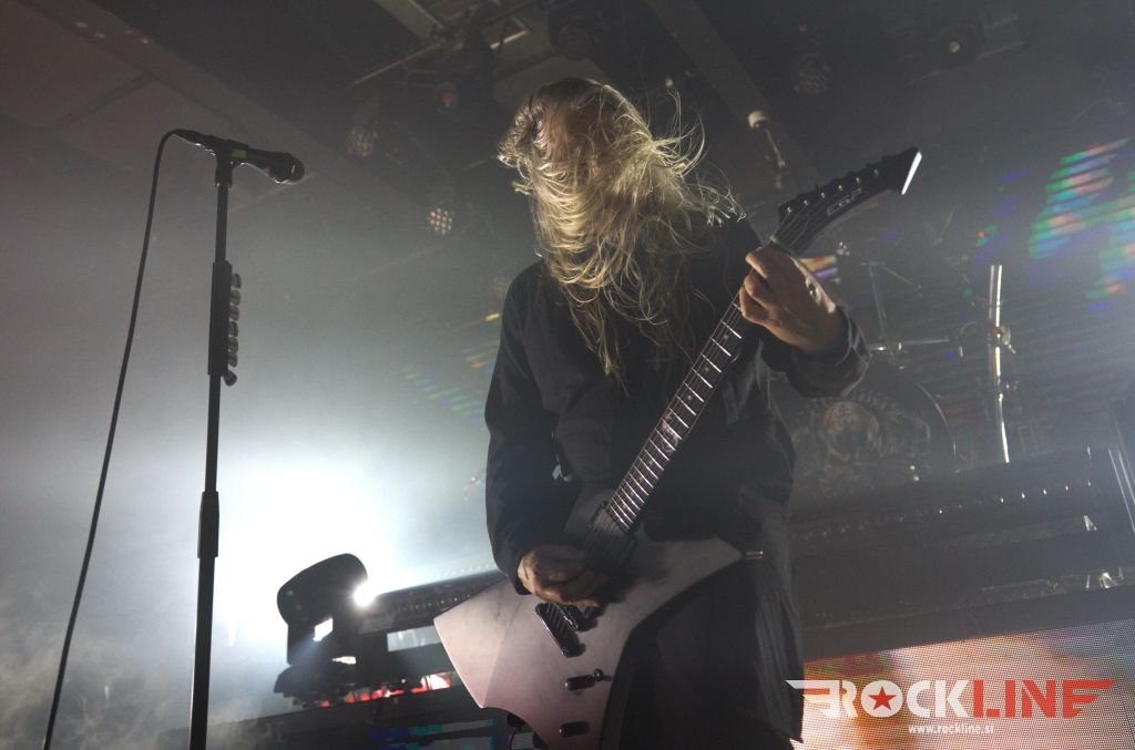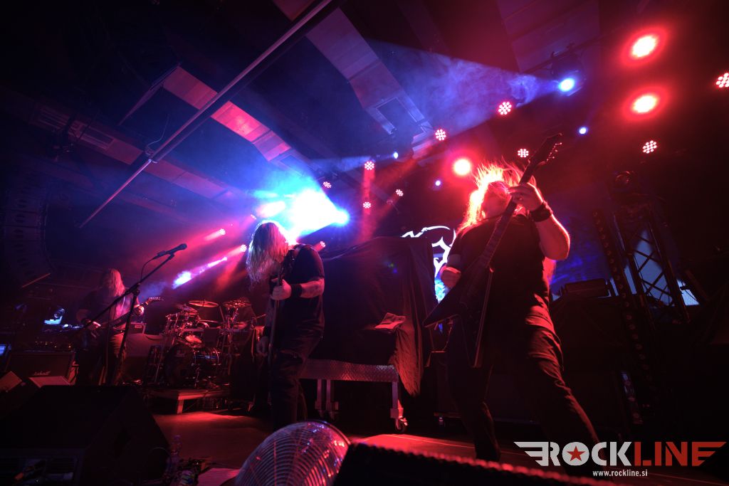 Oder so za Vreid nasledili veterani švedskega old school death metala Vomitory. Bend, ki je bil ustanovljen še v osemdesetih, je prav med to turnejo izdal nov studijski album “In Death Throes”. Ko so prispeli v Ljubljano je bil novi album napolnil ravno en teden starosti. Vomitory so kvartet, v katerem sta od originalnih članov danes brata, bobnar Urban in kitarist Tobias Gustafsson, postavo pa zaokrožata basist in vokalist Erik Rundqvist, ki vztraja v ekipi vse od drugega albuma “Redemption” dalje ter novinec Christian Fredriksson, ki je leta 2025 prevzel nase breme igranja glavne kitare. Vomitory so dokazali na tej predstavi, da ostajajo brezgrajna old school death metal mašinerija nepopustljive brutalne pogube, ki se čvrsto oklepa tudi gore diktatov. So bruhajoča mesoreznica. Izvedbeni format kvarteta ostaja nepopustljivo ošiljena, ostra in brezmilostna horda. Bend je odprl koncert s starejšo točko kariere, naslovno skladbo albuma “Revelation Nausea”, predstavil tudi dve točke najnovejšega albuma “In Death Throes” (For Gore And Country in Wrath Unbound) ter uničeval s svojo poltonsko, nizko hrumečo uglasitvijo plazovite riffovske kanonade skozi serijo stare šole death metalskega pohujšanja, ko so se zvrstile tudi Terrorize Brutalize Sodomize, Rage Of Honour, All Heads Are Gona Roll (vzeta iz prejšnjega, istoimenskega albuma), Regorge In The Morgue ter sklepna Chaos Fury. Publika pa je sodelovala s skupino v vratolomni ekstazi. Doza satanske gore uničevalnosti je bila naravnost sanjska.