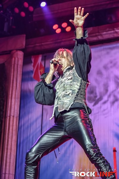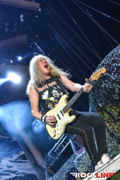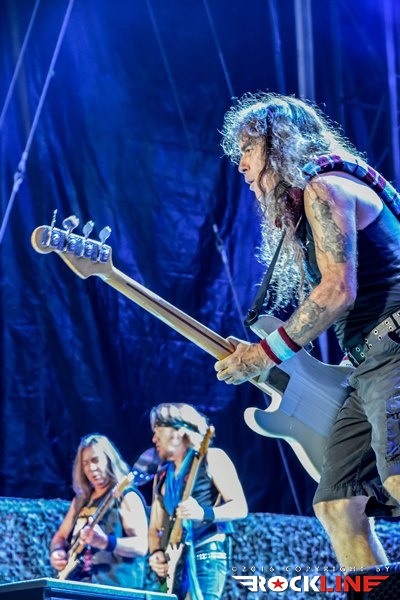 Med The Trooper je prišlo znova na vrsto Bruceovo klasično mahanje z Union Jackom (tokrat tudi z italijansko trobojnico), manjkal pa ni niti Eddiejev obisk in mečevalski dvoboj z Dickinsonom. Čudovito je v tržaško nebo odmeval Dickinsonov okultni dragulj Revelations z blestečo vokalno predstavo in izmenjavo srhljivih kitarskih melodij med trojico Smith/Murray/Gers. V podobni luči je nadaljevalo neverjetnih devet minut For the Greater Good of God in znova je dihjemajoča predstava ekipe na odru naježila kožo z mogočno kritiko vojn v imenu religije. Povratek na Brave New World je bil z The Wicker Man kratek, a sladek (in je nehote spomnil na eno najbolj pretiranih in s tem kultnih filmskih predstav Nicolasa Cagea v predelavi The Wicker Man in gateparajoči sceni »Oh, no! Not the bees! Not the bees! Aaaaaahhhhh! Oh, they’re in my eye! My eyes!«). Brez dvoma najbolj epski, mistični in eterični trenutek tržaškega koncerta je predstavljal spregledani deset minutni ep Sign of the Cross z odličnega in po krivici kritiziranega The X Factor. Bruce je, odet v črno kuto s kapuco in zlovešče zeleno sijočo lanterno, znova ukradel pozornost z megalomansko vokalno predstavo, ki jo je dopolnila bleščeča inštrumentalna izvedba in prav neverjetno je bilo opazovati rožljanje Harrisovega basa, ki je pri 62. letih skoraj ves koncert prečupal z nogo dvignjeno visoko na monitorju, streljajoč s svojim basom. Da o Gersovih akrobacijah niti ne izgubljam besed. Brez dvoma eden najbolj spektakularnih trenutkov je bil prvič po letu 1986 (!) igrani Flight of Icarus, ki kljub svoji kratkosti slabih štirih minut vsebuje vse kar vsebujejo veliki epi, v živo pa ga je nadgradila gromozanska struktura Ikara, ki je premikala krila in Dickinson, ki se je kot majhen otrok po odru sprehajal z dvojnim metalcem ognja. Nepozabno! Iron Maiden so nato s hiti Fear of the Dark, The Number of the Beast in Iron Maiden redni del seta zanesljivo in ob bučni podpori publike pripeljali do konca. Po oglušujočih »Ole, ole, ole, Maiden, Maiden!« se bend na oder vrne s prelepo The Evil That Men Do, mojstrsko izvedeno himno na smrt obsojenega zapornika Hallowed Be Thy Name, vidno odlično razpoloženi Iron Maiden pa se od tržaške publike poslovijo z nekoliko prežvečeno, a kljub temu udarno Run to the Hills.