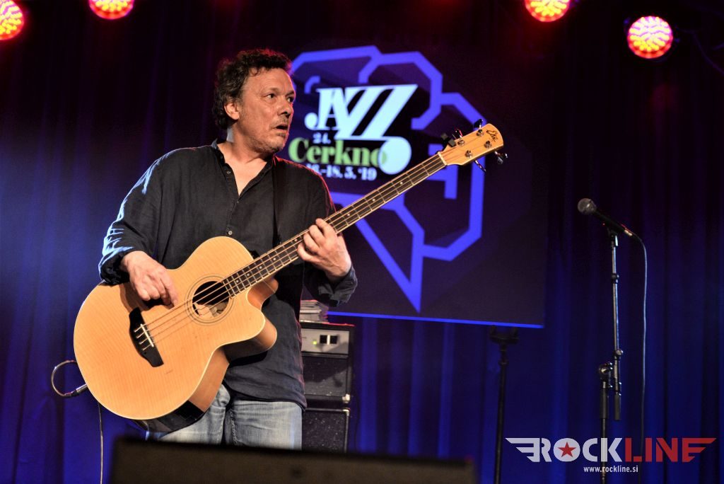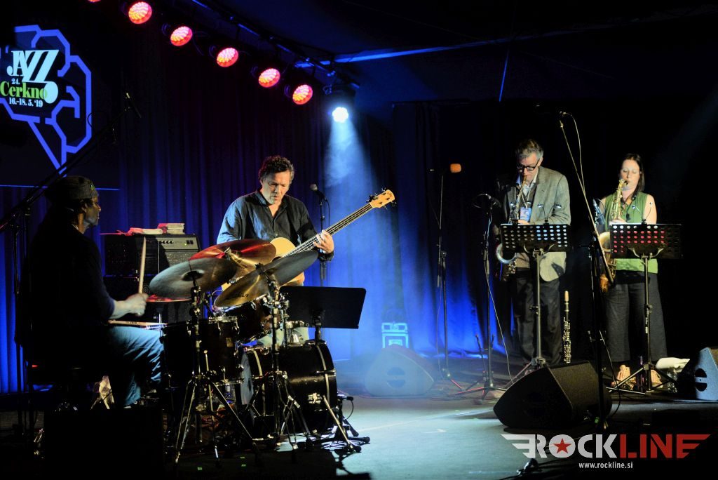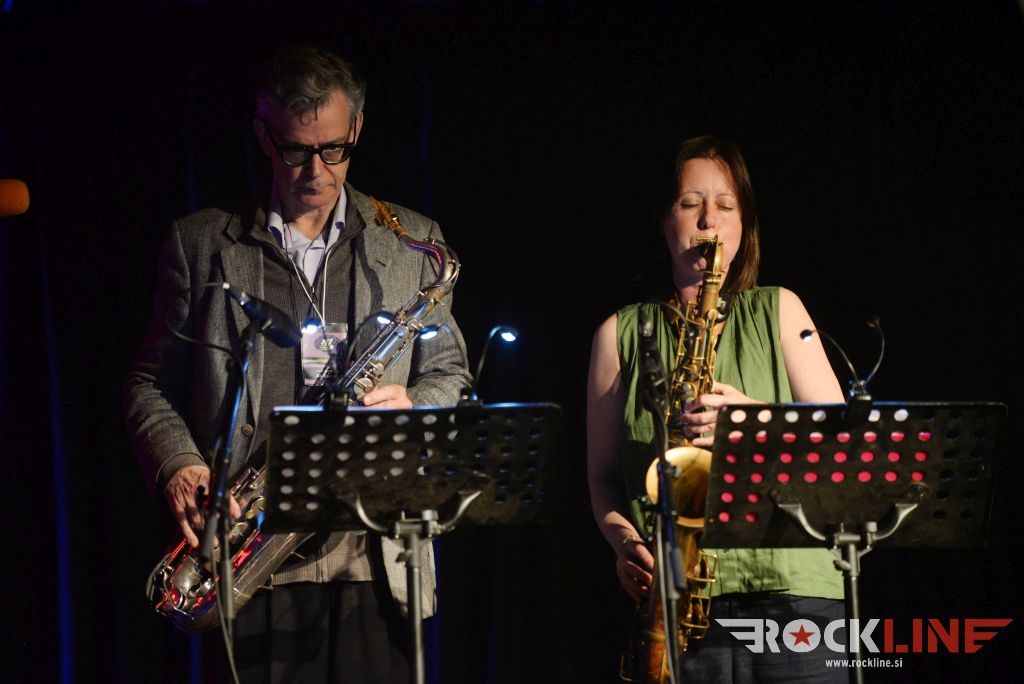 Kot zadnji drugega dne festivala so na oder stopili Luc Ex’ Assemblée. Za vrhunec drugega dne seveda. Upravičen vrhunec! Dobrodošli v nekakšni sintezi avant – punk –world music- jazza, mednarodne zasedbe dveh Nizozemcev, Valižanke ter Američana, pri kateri prebiva v prvi fronti močna in jedra sekcija prepleta dveh tenor saksofonov, v drugi pa podivjani žvenket akustične bas kitare ter genij izjemnega bobnarja Hamida Drakea, ki daje tej glasbeni zgodbi s svojo prisotnostjo prav posebno dimenzijo. Luc Ex, ki je pred tem sodeloval tudi v drugih eksperimentalnih zasedbah The Ex, Sol 6, Roof, 4Walls, je vodja ekipe, ki se lahko v stapljanju nebrzdanih jazzovskih deviacij (tudi v forme freejazza), z lahkoto zavihti v otipljive forme melosa, kjer ob šundru, ne manjka občevanja z elementi svetovne glasbe. Bend lahko v svoji modalni fazi nenadoma poljubno-prosto »razpade« na vse štiri konce in tako razgalja pravi kakofonični šundr, pa se spet sestavi nenadoma nazaj, kar navdaja tak glasbeni koncept s srčno noto spontanosti in nepredvidljivim razvojem dogodkov. Kot to dojema poslušalec, bend mora biti sicer zelo zbran. Posebna zgodba kvarteta je Hamid Drake, ki je res »velika riba« na polju sodobnih dognanj v svetu jazzovskega bobnanja. Ta je naravnost briljiral z izjemnim občutkom. Večkrat je prešel na preprosto ritmiko, ki je poglabljala celo punkoidno naravo kvarteta, potem pa v tej preproščini kreiral čudodelne prehodne in jazzovsko zasoljene akrobacije, polnokrvno izzivalnih ter iskrivih domislic, ki jemljejo sapo. Luc Ex na akustični bas kitari je vzbujal pozornost zlasti po tem, kako ga »trga« in razmetava na odru med izvedbo. Prav teatralno se vživlja v izvedbo materiala in s svojimi nebrzdanimi gibi, pa tudi grimasami, v polju vživetosti in odklopa, nemalokrat spomni na našega Petra Deklevo (Srečna Mladina), ki ga prav tako rado razmetava po odru, ko ga odpelje energija. Naravnost! Tudi zelo grobo in večkrat tudi z udarjanjem polnih akordov. V tem je Luc razvijal izredno prodoren in debel kontrastni zvok,nad katerem so lebdele proste forme saksofonov. Res, da je bend lahko popolnoma ušel z vajeti, pa je na trenutke balansiral predstavo s točkami spravljive mirnosti, čutne mehkobe, ki zahtevajo izdatno mero čutnosti in pretanjenosti, s čimer je dražil lahko tudi v kabaretni maniri. Skrajno usekano, lucidno, zabavno, za uho nenehno invazivno in ščegeče prebrisano . V navihani šegavosti so spomnili celo na simpatičnost finskega tria Mopo, ki je v Cerknem nastopil leta 2016 Ab Baars je začinil koncert tudi z rabo japonske piščali iz bambusa imenovane šakuhači, sicer pa sta Mussonova in Baars dozirala koncertne momente tudi z rabo klarineta (Baars) in soprano saksofona (Mussonova).