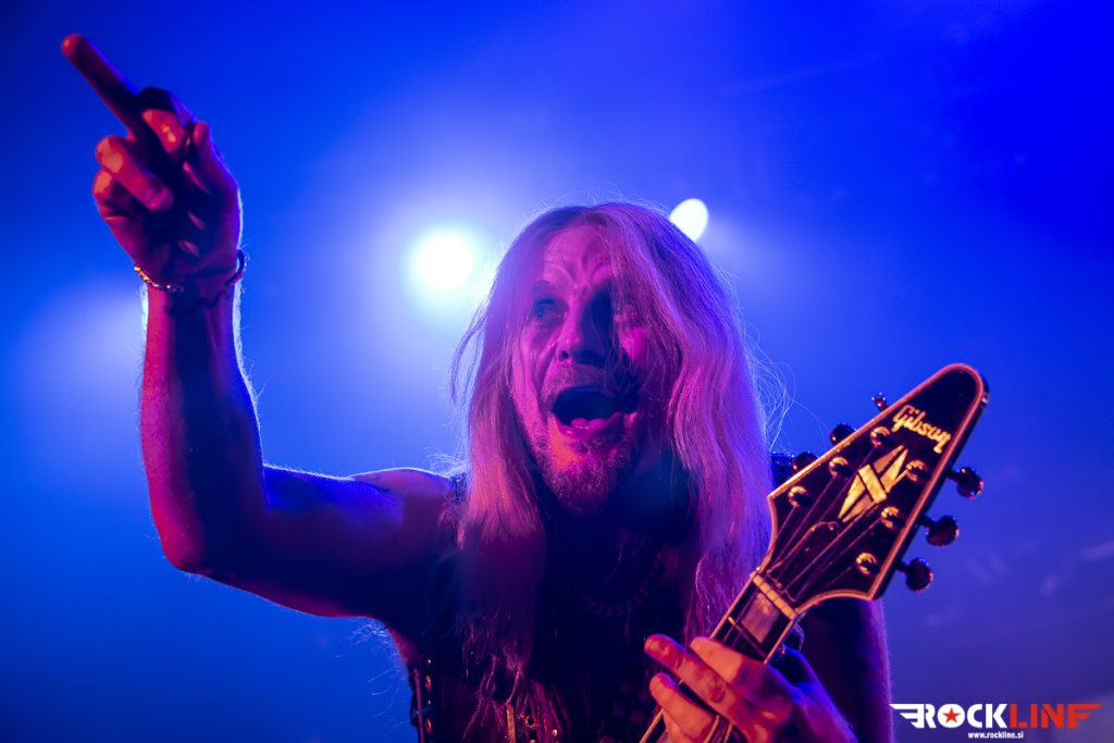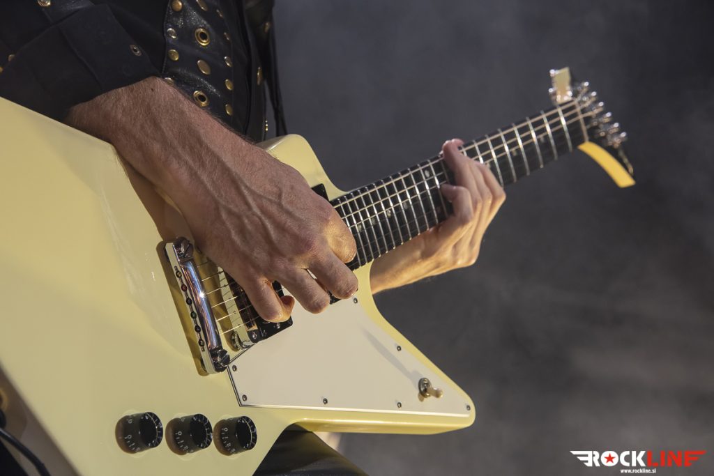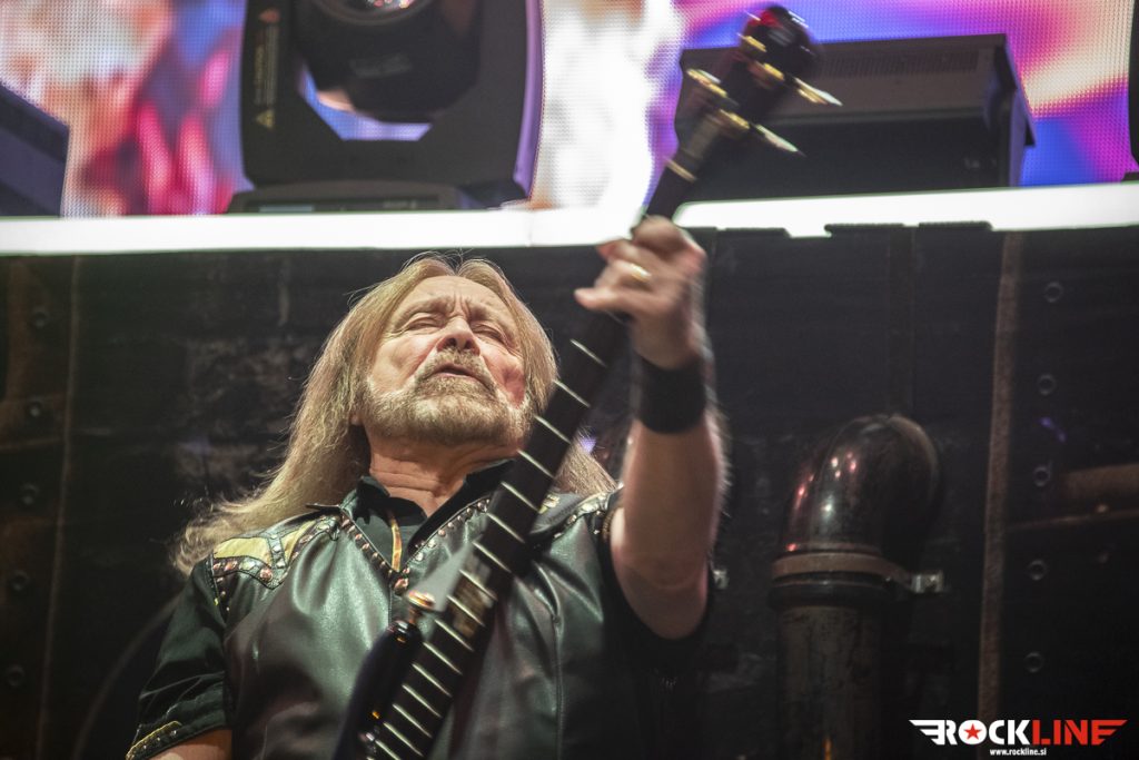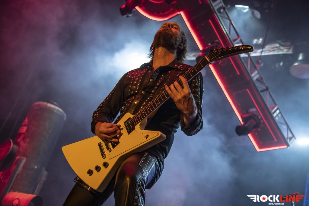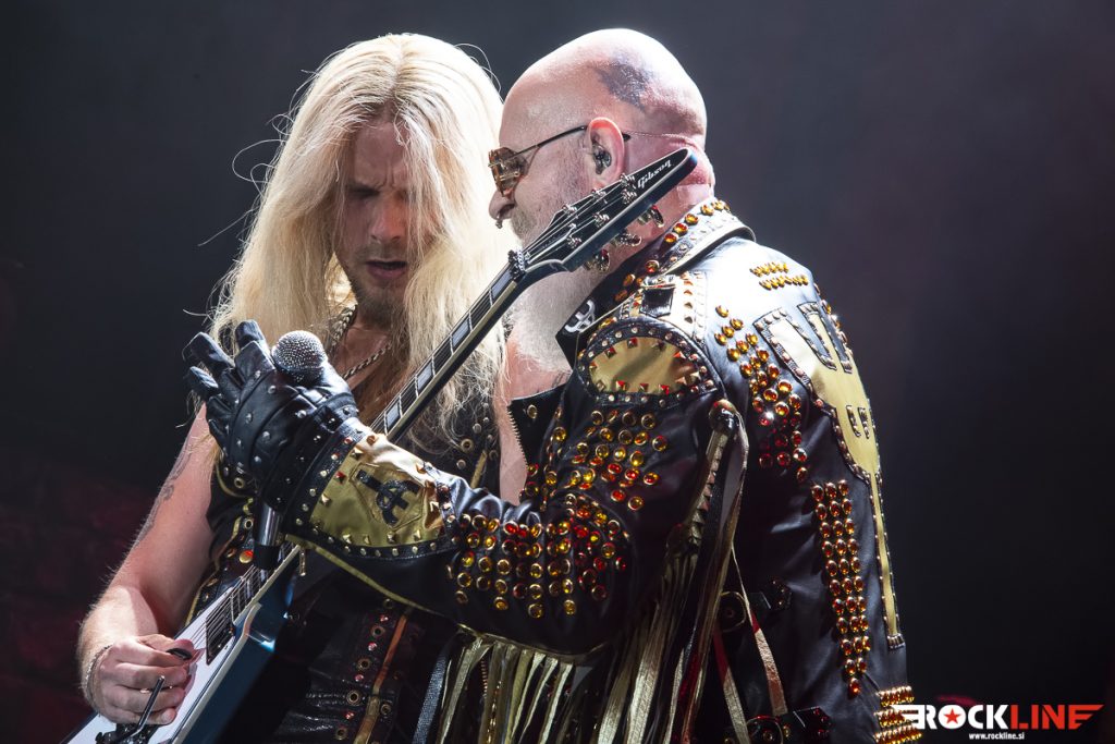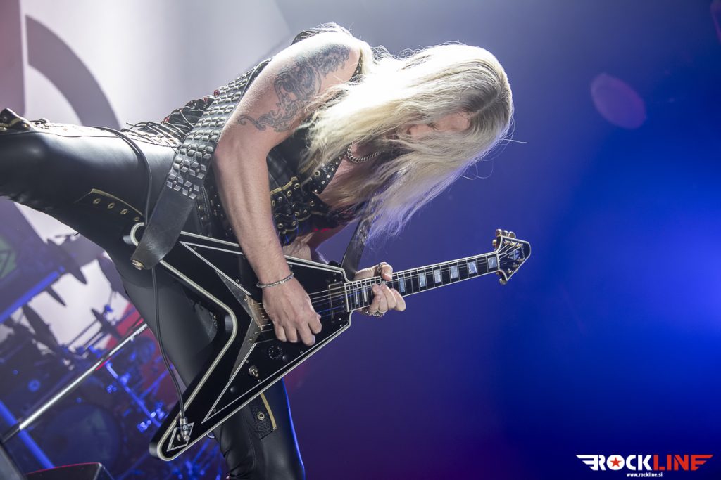 Če je dvorana med The Dead Daisies še precej samevala pa se je do devete ure zvečer že precej lepo napolnila. Povsem vrhnje tribune so bile sicer zastrte s črno ponjavo, medtem ko se je parter skorajda v celoti zapolnil, lepo število obiskovalcev pa je zasedlo tudi spodnje tribune. V dvorani je završalo, ko je iz zvočnikov zatulila Black Sabbath himna War Pigs, še bolj pa, ko se je ob zvokih Battle Hymn nad publiko spustil ogromen Judas Priest križ in z naravnost osupljivo igro svetlobnih učinkov eksplodiral ob prihodu benda na oder in ne, ni bilo mogoče verjeti, da so Judas Priest Ljubljano pozdravili prav z nadaljevanjem Battle Hymn, spregledano Painkiller čarovnijo One Shot At Glory, ki so jo sploh prvič v svoji pol stoletja dolgi karieri v živo zaigrali šele na lanskem Bloodstock festivalu. Kocine so šle ob epski Painkiller bombi pokonci v istem trenutku in tisti precej anemični in rutinski koncert z Metaldays 2018 in vse skrbi, da bi se lahko ponovil so šle hipoma v pozabo. Judas Priest so bili torkovega večera v izjemni formi in odlično razpoloženi! Tudi zvok se je po uvodnem donenju hitro precej stabiliziral in bil za stožiške razmere več kot soliden, le bas Iana Hilla je bil na trenutke nekoliko preveč izrazit in v ospredju (če je že on na odru stalno v ozadju in ves čas prikovan na isto mesto, hehe). Komaj smo si opomogli po uvodnem skoraj sedem minutnem epu, že so Priest udarili z edinim komad s še aktualnega Firepower, Lightning Strike in v vsej svoji veličastno podobi se je razbohotil osupljiv oder, ki je zgledal kot nekakšna industrijska železarna polna opozoril za nevarnost in »vstop dovoljen le pooblaščenim«, poleg tega pa je vsak komad spremljala lastna animacija na ogromnem ozadju, povrh vsega pa še osupljiv »lightshow«. Tako čudovite igre luči v Stožicah bržda še ni bilo. Najbolj prelep in čustven moment je bil vsekakor, ko se je sredi enega izmed komadov v svoji solaži pojavil kitarski bog Glenn Tipton, škoda le, da ga nismo uzrli tudi v živo.