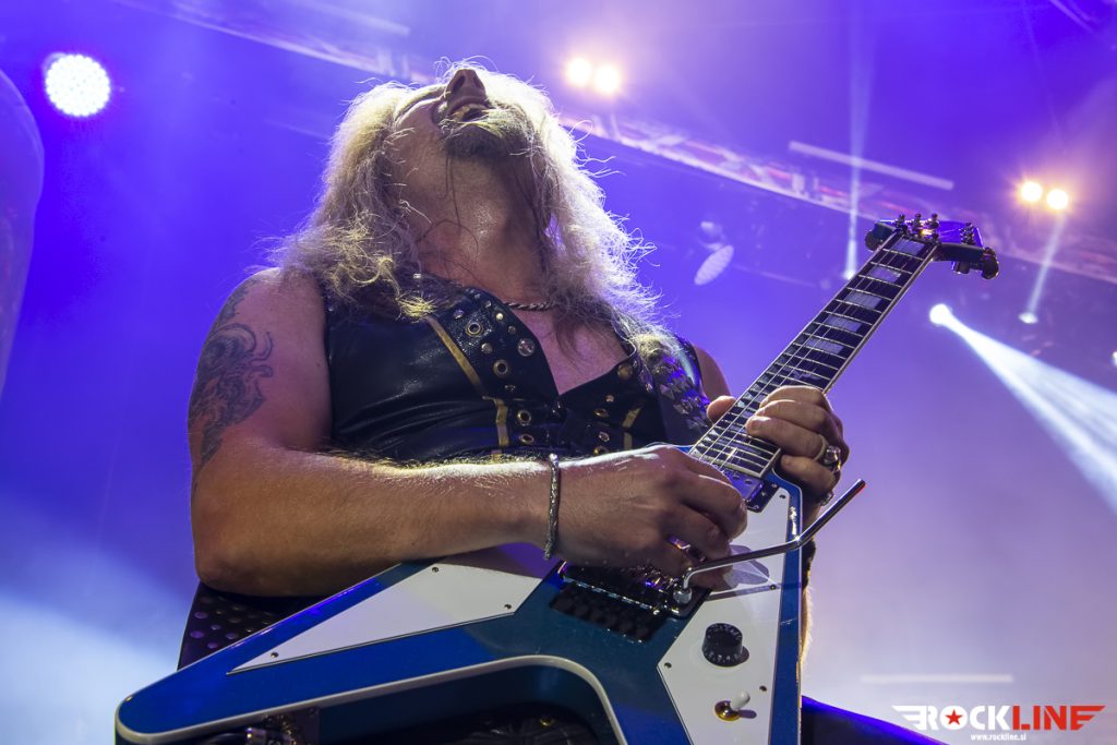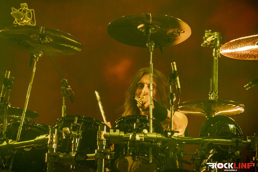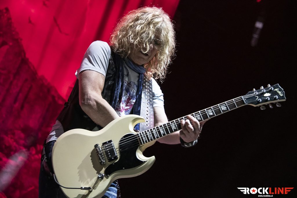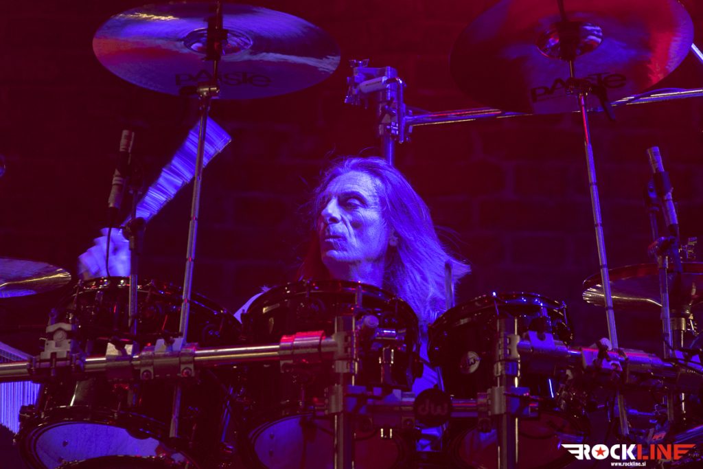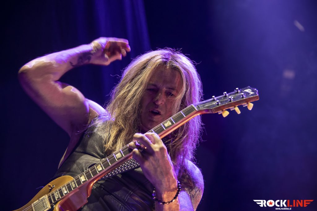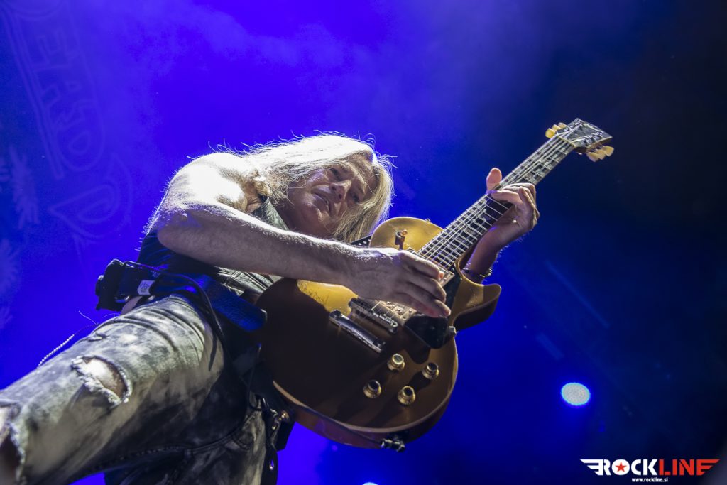 Če je dvorana med The Dead Daisies še precej samevala pa se je do devete ure zvečer že precej lepo napolnila. Povsem vrhnje tribune so bile sicer zastrte s črno ponjavo, medtem ko se je parter skorajda v celoti zapolnil, lepo število obiskovalcev pa je zasedlo tudi spodnje tribune. V dvorani je završalo, ko je iz zvočnikov zatulila Black Sabbath himna War Pigs, še bolj pa, ko se je ob zvokih Battle Hymn nad publiko spustil ogromen Judas Priest križ in z naravnost osupljivo igro svetlobnih učinkov eksplodiral ob prihodu benda na oder in ne, ni bilo mogoče verjeti, da so Judas Priest Ljubljano pozdravili prav z nadaljevanjem Battle Hymn, spregledano Painkiller čarovnijo One Shot At Glory, ki so jo sploh prvič v svoji pol stoletja dolgi karieri v živo zaigrali šele na lanskem Bloodstock festivalu. Kocine so šle ob epski Painkiller bombi pokonci v istem trenutku in tisti precej anemični in rutinski koncert z Metaldays 2018 in vse skrbi, da bi se lahko ponovil so šle hipoma v pozabo. Judas Priest so bili torkovega večera v izjemni formi in odlično razpoloženi! Tudi zvok se je po uvodnem donenju hitro precej stabiliziral in bil za stožiške razmere več kot soliden, le bas Iana Hilla je bil na trenutke nekoliko preveč izrazit in v ospredju (če je že on na odru stalno v ozadju in ves čas prikovan na isto mesto, hehe). Komaj smo si opomogli po uvodnem skoraj sedem minutnem epu, že so Priest udarili z edinim komad s še aktualnega Firepower, Lightning Strike in v vsej svoji veličastno podobi se je razbohotil osupljiv oder, ki je zgledal kot nekakšna industrijska železarna polna opozoril za nevarnost in »vstop dovoljen le pooblaščenim«, poleg tega pa je vsak komad spremljala lastna animacija na ogromnem ozadju, povrh vsega pa še osupljiv »lightshow«. Tako čudovite igre luči v Stožicah bržda še ni bilo. Najbolj prelep in čustven moment je bil vsekakor, ko se je sredi enega izmed komadov v svoji solaži pojavil kitarski bog Glenn Tipton, škoda le, da ga nismo uzrli tudi v živo.