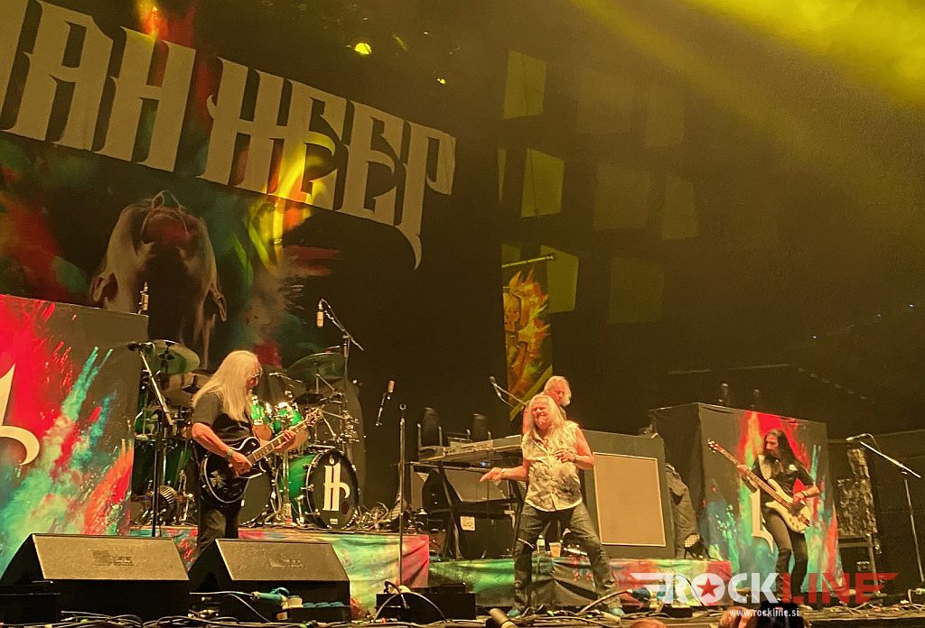 A pojdimo po vrsti. Ura je 18.45 in na odru so Uriah Heep. Legende, ki so lani izdale aktualni studijski album “Chaos & Colour” (2023, RockLine recenzija), so tričetrt ure nastopa izkoristile za izvedbo repertoarja, s katerim so predstavili najnovejši album, v preostanku razpoložljive minutaže, pa so dostavili seveda najbolj znane uspešnice. A koncert Uriah Heep z vsega 45 minutami časa, je odločno premalo, da bi pravega ljubitelja te skupine potešil. Bend je hipoma vzpostavil dobro znano kuliso z navito Save Me Tonight iz najnovejšega albuma “Chaos & Colour”, ki ga je nasledila še ena novejša himna Grazed By Heaven iz predhodnika “Living The Dream” (2018, RockLine recenzija). Kvintet, ki mu poveljuje neuničljivi kitarist Mick Box – letos bo napolnil 76. let, zveni v živo navito kot strela. Masivne fraze v kombiniranju s čokatim Hammond zvokom Phila Lanzona, še vedno izredno svež, žametast in energije poln vokal Bernieja Shawa in pod vsem armiranobetonska ritem sekcija z eksplozivnim bobnarjem Russellom Gilbrookom ter izjemnim melodičnim bas kitarskim akrobatom, to je Dave Rimmer, ostaja v živo strašna. Slikovita! Grabežljiva. Gre za skupino, ki neprenehoma igra. Nastopa na koncertih. Tudi v zvočnem oziru je vse štimalo. Seveda pa je svoje dostavila publika, ki se je konkretno nagnetla že do nastopa Uriah Heep in v parterju je bilo v sprednjih vrstah posebej peklensko. Ob “Demons And Wizards” (1972) klasiki Rainbow Demon, še eni novejši jurišnici Hurricane, pa navito metaliziranim “Innocent Victim”(1978) tornadom Free’N’Easy, je druženje s skupino kar prehitro minevalo. A so Uriah Heep privarčevali glavnino dinamita za sam finale. Najprej z ‘gorostasim’ rifom – to je klasiko Gypsy v katero so vpadli direktno, brez Hammond uvoda (kot to beleži studijski prvenec), temu pa sta sledili po pričakovanjih, Easy Livin’, ki je silovito zamajal temelje dvorane, potem pa še sklepno klasiko železnega repertoarja, akustično Lady In Black, ob kateri je gromovito sodelovala cela Stadthalle!