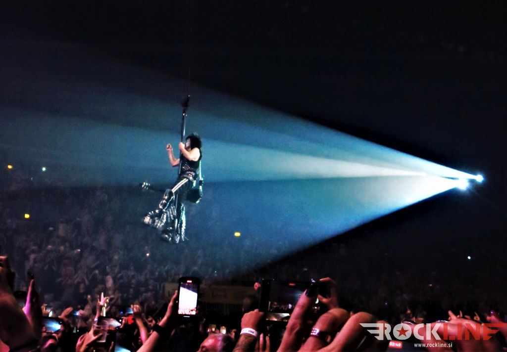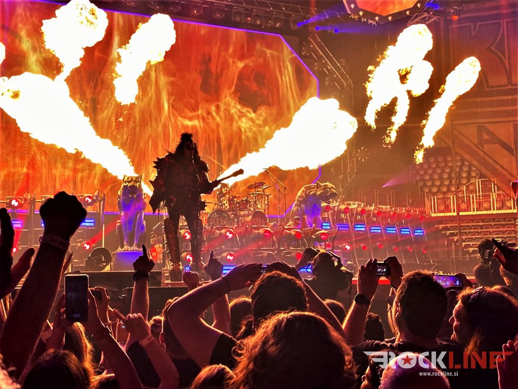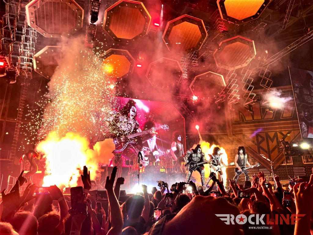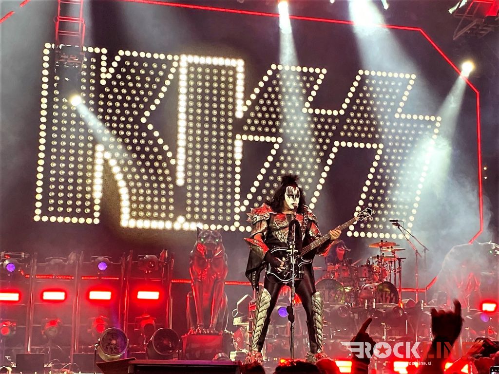 Kakorkoli. Predskupino smo rutinsko izpustili, pri čemer smo si privoščili toliko površnosti in nečimrnosti, da nismo izbezali niti njenega imena. Zanimal nas je le dvourni Kiss spektakel. Rondo izbranega repertoarja niti ni presenečal mnogo, nemara le vrnitev odlične »Animalize« skladbe Heaven’s On Fire v setlisto, sicer pa je kvartet nizal precej ustaljen nabor izbranih singlov in hitov kariere. Pri Kiss je posebnost ta, da glasbo na koncertih pravzaprav zasenči vse ostalo, kar spremlja njeno odrsko interpretacijo. Od odrskih oprav kvarteta, na čelu z značilno obrazno poslikavo, Geneovem zloglasnem jeziku, da o ostalem niti ne načenjamo besed. Čeprav jih je treba. Da so Kiss eno tistih podjetij, ki je najbolj podrobno naštudirala vse načine učinkovitega trženja, so poudarjale že štiri kolosalne figure članov nameščene levo in desno od odra, ki so spominjale na orjaške kamnite kipe, še preden se je vzdignila sama odrska zavesa. Po nasnetem uvodu, ki je bil do polovice skrajšan, je počilo, črno pregrinjalo je padlo, The Demon, The Spaceman, The Starchild in The Catman, pa so se izpod vrha spuščali vsak na svojem podestu po jeklenicah na oder. Oder se je v hipu znašel v ognjenih zubljih. Ob kupu detonacij ni manjkalo dodatnih dimnih zaves in prasketanja isker. Oder je bil izjemno prostran. V kolikor si stal recimo kakih deset metrov stran od odra, le ta definitivno ni prišel ves v tvoje vidno polje. Ko si mislil, da si na odru že videl vse, si ob novem pogledu nanj, vedno znova uzrl še kak nov detajl. Kiss so mašinerija, ki je do popolnosti ‘naoljena’. Česa Kiss ne bi imeli, kar imajo druge velike rock in metal zasedbe? Kiss imajo kvečjemu več, ali pa v vsaki že uporabljeni ideji s strani različnih glasbenih izvajalcev namerno dodatno pretiravajo. To je vsekakor dobrodošlo, saj so Kiss tista zloglasna rock in glam metal zasedba brezvestnega ekscesa in šok terapije, kar pa od nekdaj privlači vedno nove in nove trume privržencev.