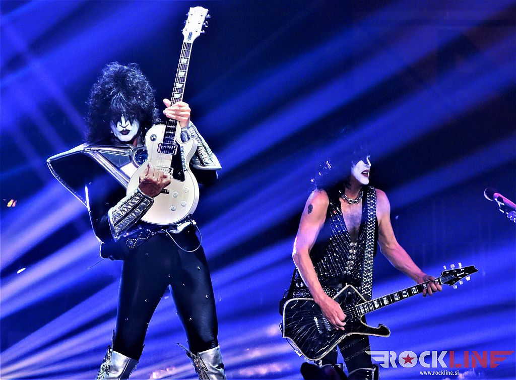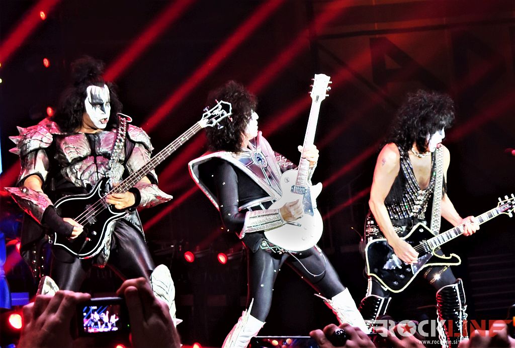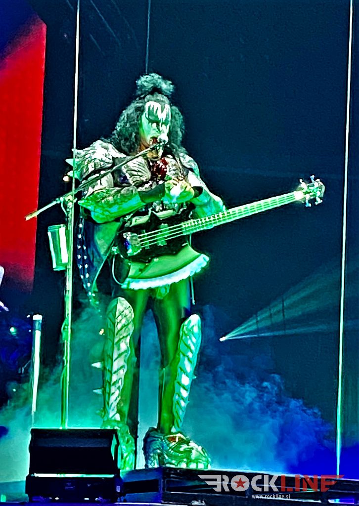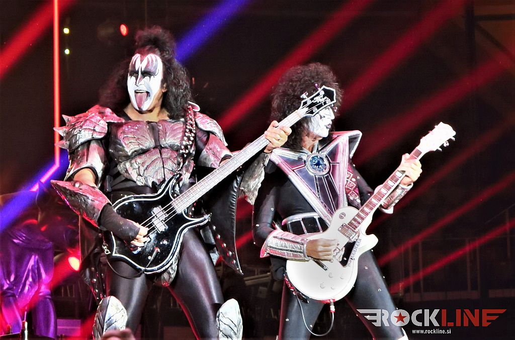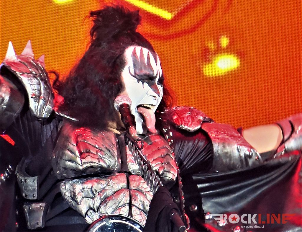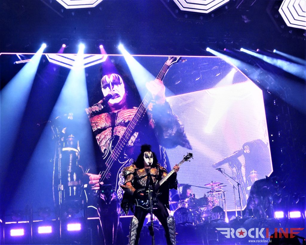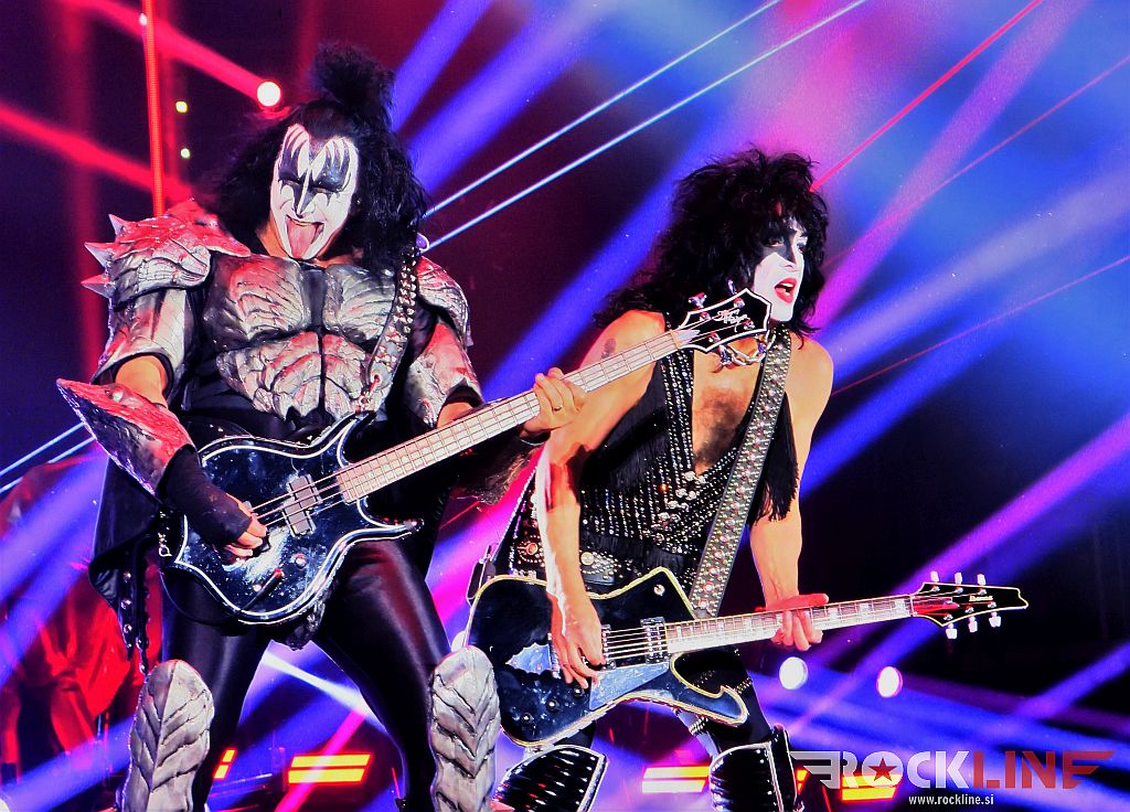 Gene Simmons bo denimo proti koncu avgusta letos napolnil 73. let, Paul Stanley pa se je priključil klubu sedemdesetletnikov prav v letošnjem januarju. Originalna člana sta neverjetna. Geneovi odvečni kilogrami so kar dobro zamaskirani pod kolosalnim oklepom v katerem se basist nahaja med koncertnimi predstavami, medtem ko zadržuje Stanley tudi v svojih sedemdesetih neverjetno odrsko agilnost, razposajenost in navihanost. Povsod ga je dovolj. Šviga z leve na desno ter pri tem ne ostaja niti za hip brez sape. Tudi v vokalnem oziru je povsem korekten, četudi je z leti izgubil seveda nekaj prodornosti. Kiss uporabljajo glede spremljevalni vokalov v celoti matrice (nasneti ‘playback’), večkrat pa je bil sumljiv glede tega tudi Genejev bas. Že takoj v uvodni ‘thinlizzyjevski’ Detroit Rock City njegova desnica še zdaleč ni bila sinhrona. Kremeniti ‘jezični badass gromovnik’ je na odru opremljen s črnimi brisačkami (da se ne vidi vse pobrisane umazanije), s katerimi nenehno briše svoj znoj in če ste srečnež svoje sorte, lahko Gene zaluča kakšno preznojeno krpo naravnost proti vam. Sicer pa je možakar izžareval trpljenje pod bataljonom reflektorjem tudi tako, da se je nenehno polival z vodo. Vse povsod. Tudi po bas kitari. Pri tem ni pozabil konkretno škropiti tudi publike. Simmons, Thayer in Singer imajo tudi vsak solo točko, pri čemer jih na posebnih, dodatnih podestih med točkami dvignejo (‘apzajlajo’) tik pod reflektorje. Simmons kompenzira svoje pomanjkanje znanja igranja bas kitare (ob sami obrazni poslikavi) že samo s svojim orjaškim jezikom. To je njegova žrtev za večno slavo, ki jo je dosegel s Kiss! Ko pa je med ‘svojo solažo’ visoko nad odrom ter obsijan v zeleni svetlobi, pa pregrizne vrečko rdeče želatine, z učinkom kot bi bljuval kri. Nihče mu ne gleda pod prste. V solo točki uporablja znamenito bas kitaro v obliki sekire. Thayerjeva solaža pa je pospremljena s serijo detonacij. Odveč je dodajati, da spominja odrska kulisa na pekel. Odveč je dodajati, da je igra snopov reflektorske svetlobe enkratna, neponovljiva in veličastna. Izpiljena do perfekcije. Pri tem ne izostajajo niti ‘laserski’ žarki. Stanley ostaja še vedno izjemen pogonski motor skupine. Med Love Gun se je z glavnega odra ‘odzajlal’ na dodaten manjši oder, nameščen v ostalem parterju, kjer je kraljeval sam na svojem odru. Tu je ostal tudi v času izvedbe nadobvezne I Was Made For Lovin’ You, potem pa se je po zadnjem refrenu znova namestil na prevozno sredstvo, ki ga je po taisti (‘zip-line’) jeklenici dostavilo nazaj na glavni oder.