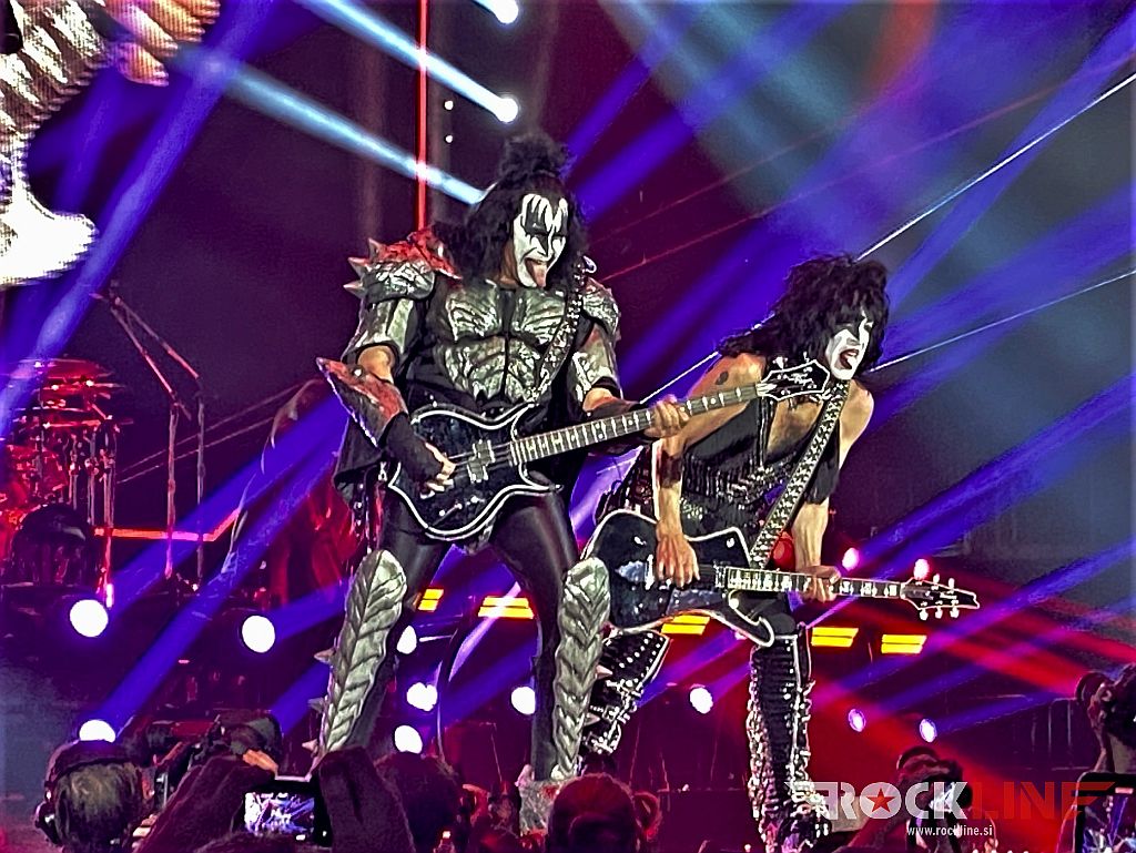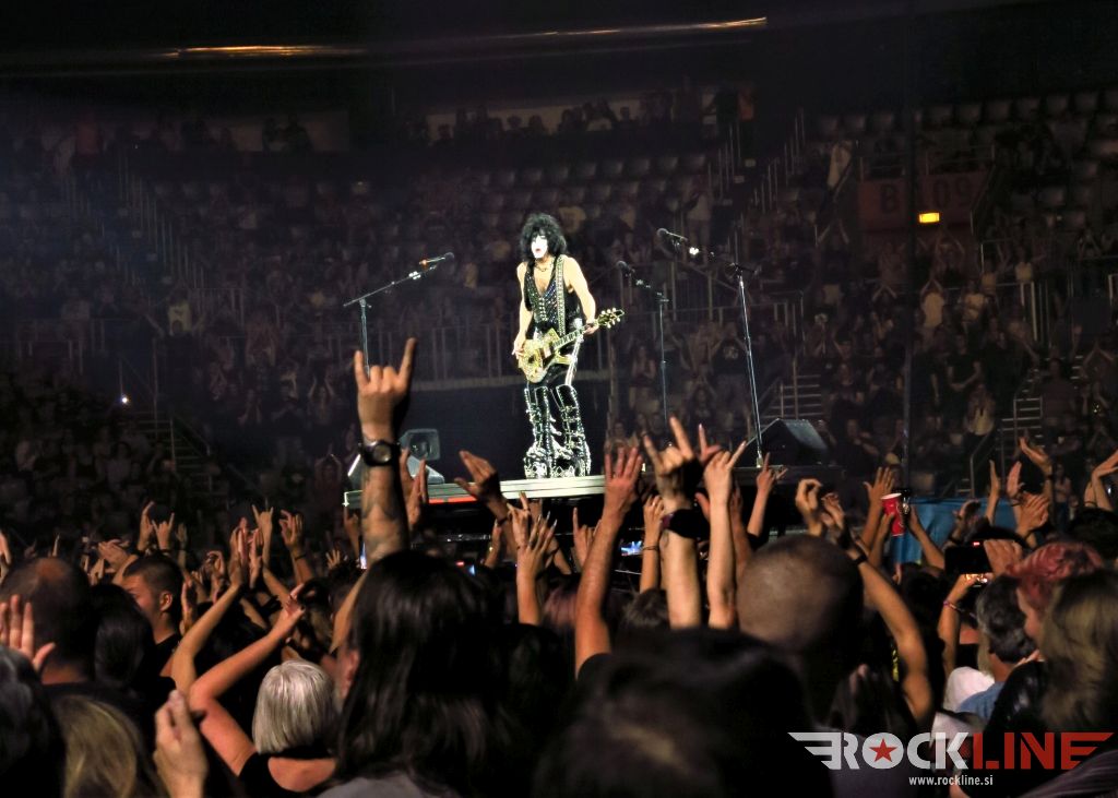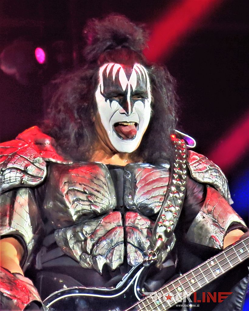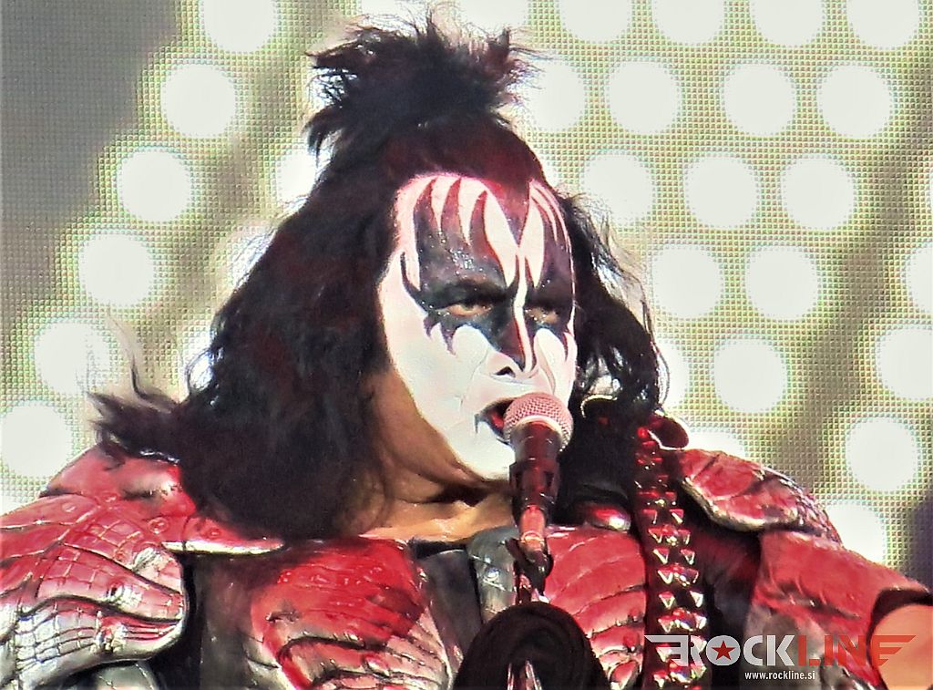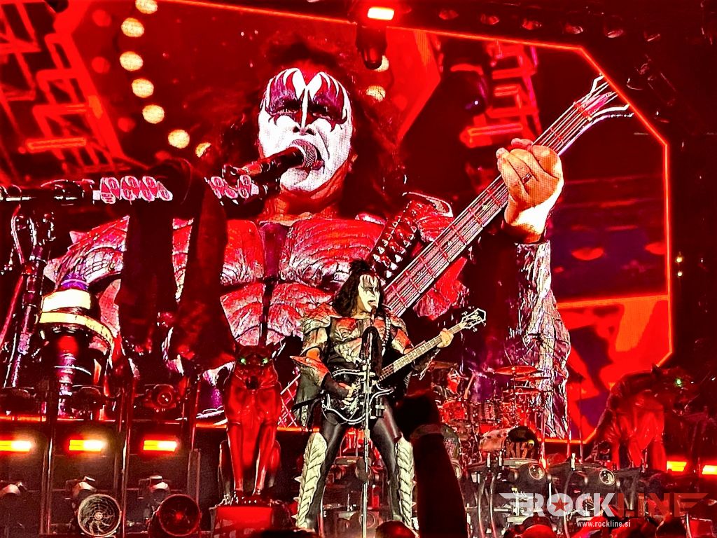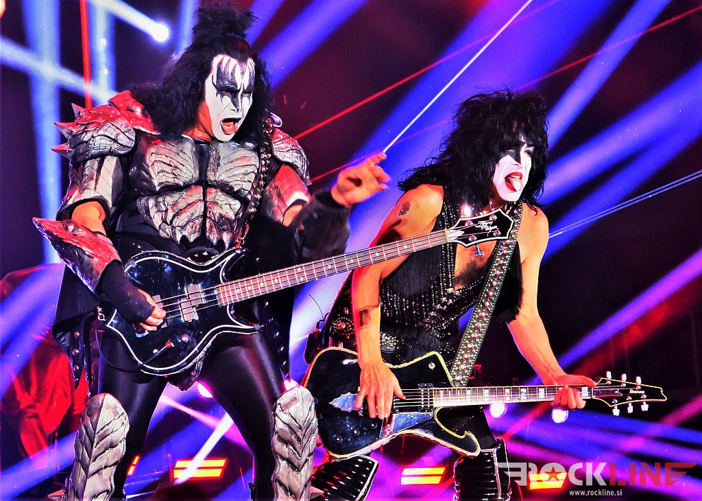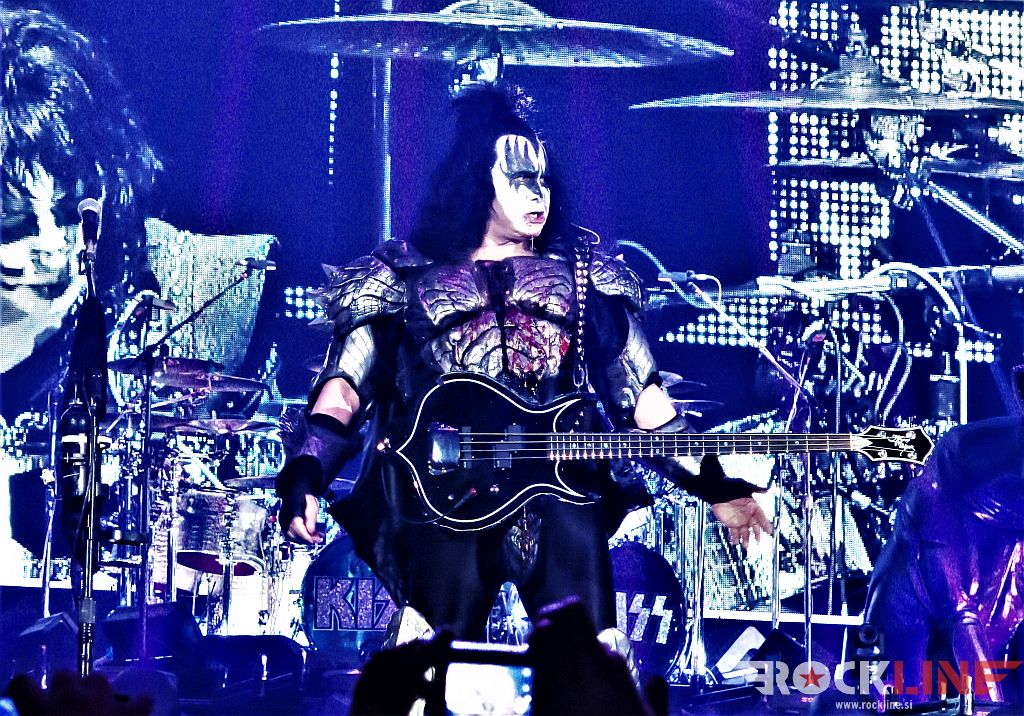 Gene Simmons bo denimo proti koncu avgusta letos napolnil 73. let, Paul Stanley pa se je priključil klubu sedemdesetletnikov prav v letošnjem januarju. Originalna člana sta neverjetna. Geneovi odvečni kilogrami so kar dobro zamaskirani pod kolosalnim oklepom v katerem se basist nahaja med koncertnimi predstavami, medtem ko zadržuje Stanley tudi v svojih sedemdesetih neverjetno odrsko agilnost, razposajenost in navihanost. Povsod ga je dovolj. Šviga z leve na desno ter pri tem ne ostaja niti za hip brez sape. Tudi v vokalnem oziru je povsem korekten, četudi je z leti izgubil seveda nekaj prodornosti. Kiss uporabljajo glede spremljevalni vokalov v celoti matrice (nasneti ‘playback’), večkrat pa je bil sumljiv glede tega tudi Genejev bas. Že takoj v uvodni ‘thinlizzyjevski’ Detroit Rock City njegova desnica še zdaleč ni bila sinhrona. Kremeniti ‘jezični badass gromovnik’ je na odru opremljen s črnimi brisačkami (da se ne vidi vse pobrisane umazanije), s katerimi nenehno briše svoj znoj in če ste srečnež svoje sorte, lahko Gene zaluča kakšno preznojeno krpo naravnost proti vam. Sicer pa je možakar izžareval trpljenje pod bataljonom reflektorjem tudi tako, da se je nenehno polival z vodo. Vse povsod. Tudi po bas kitari. Pri tem ni pozabil konkretno škropiti tudi publike. Simmons, Thayer in Singer imajo tudi vsak solo točko, pri čemer jih na posebnih, dodatnih podestih med točkami dvignejo (‘apzajlajo’) tik pod reflektorje. Simmons kompenzira svoje pomanjkanje znanja igranja bas kitare (ob sami obrazni poslikavi) že samo s svojim orjaškim jezikom. To je njegova žrtev za večno slavo, ki jo je dosegel s Kiss! Ko pa je med ‘svojo solažo’ visoko nad odrom ter obsijan v zeleni svetlobi, pa pregrizne vrečko rdeče želatine, z učinkom kot bi bljuval kri. Nihče mu ne gleda pod prste. V solo točki uporablja znamenito bas kitaro v obliki sekire. Thayerjeva solaža pa je pospremljena s serijo detonacij. Odveč je dodajati, da spominja odrska kulisa na pekel. Odveč je dodajati, da je igra snopov reflektorske svetlobe enkratna, neponovljiva in veličastna. Izpiljena do perfekcije. Pri tem ne izostajajo niti ‘laserski’ žarki. Stanley ostaja še vedno izjemen pogonski motor skupine. Med Love Gun se je z glavnega odra ‘odzajlal’ na dodaten manjši oder, nameščen v ostalem parterju, kjer je kraljeval sam na svojem odru. Tu je ostal tudi v času izvedbe nadobvezne I Was Made For Lovin’ You, potem pa se je po zadnjem refrenu znova namestil na prevozno sredstvo, ki ga je po taisti (‘zip-line’) jeklenici dostavilo nazaj na glavni oder.