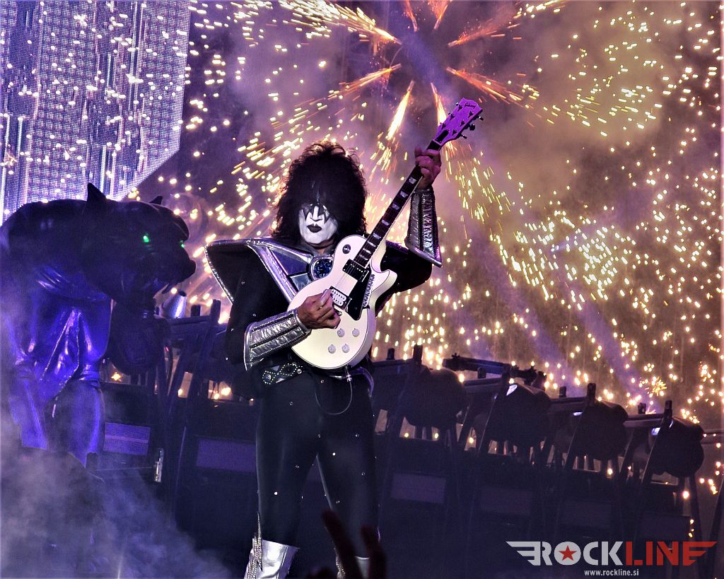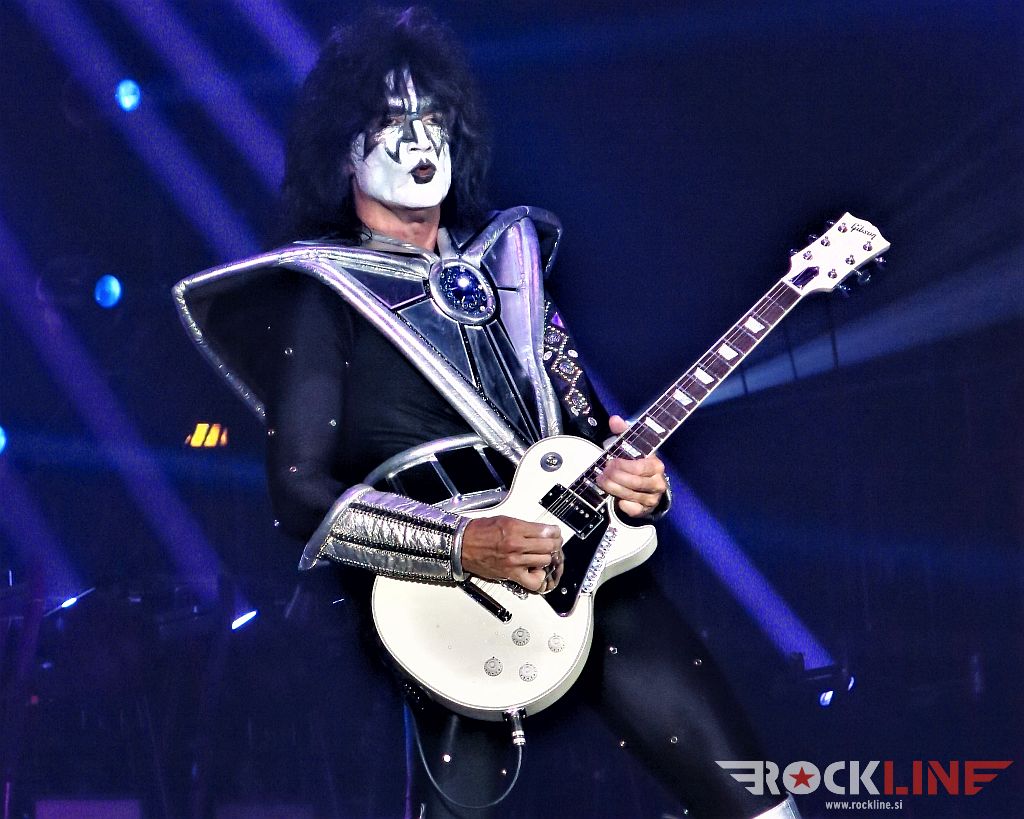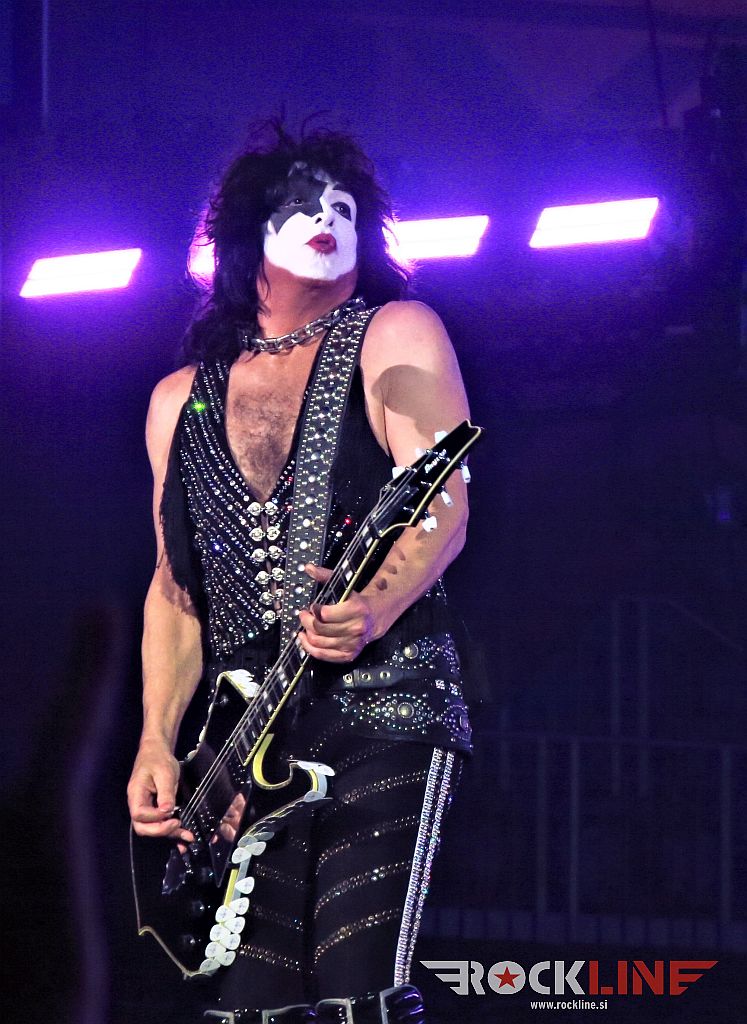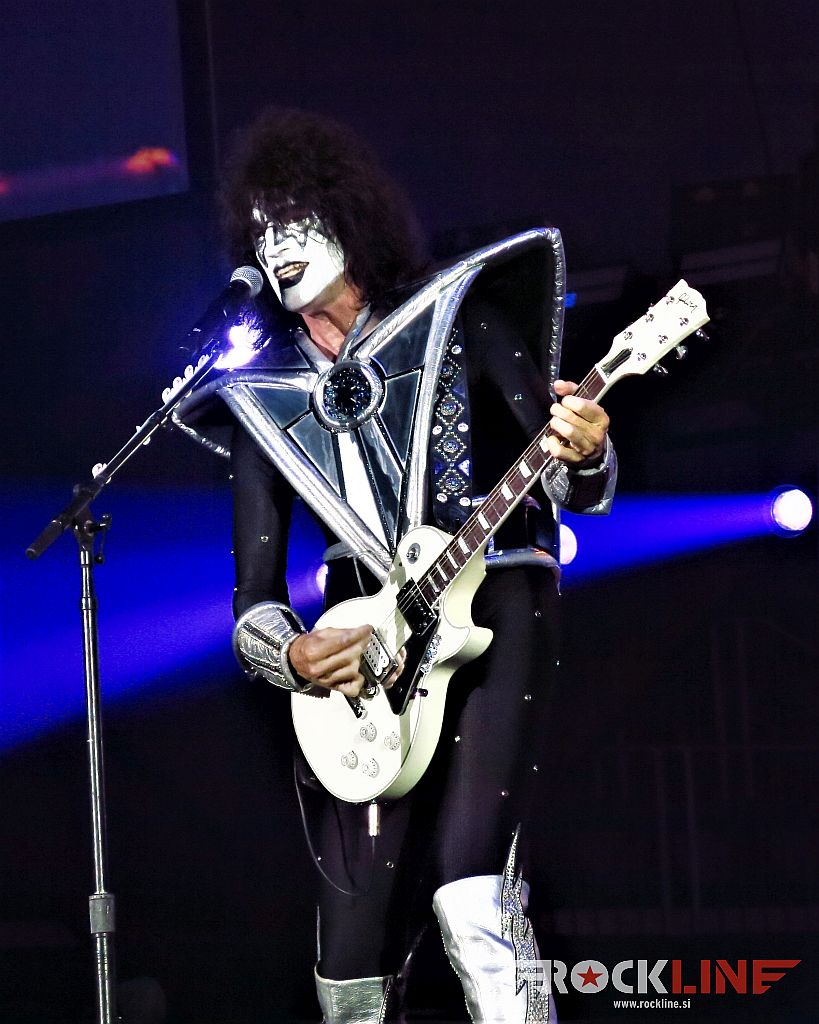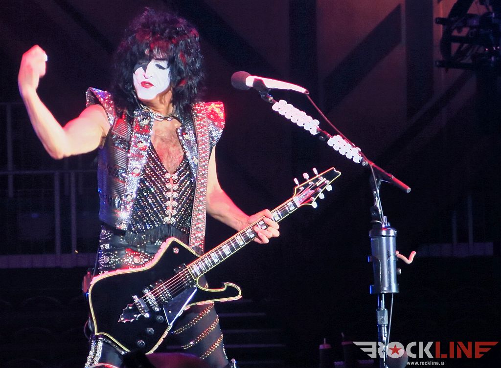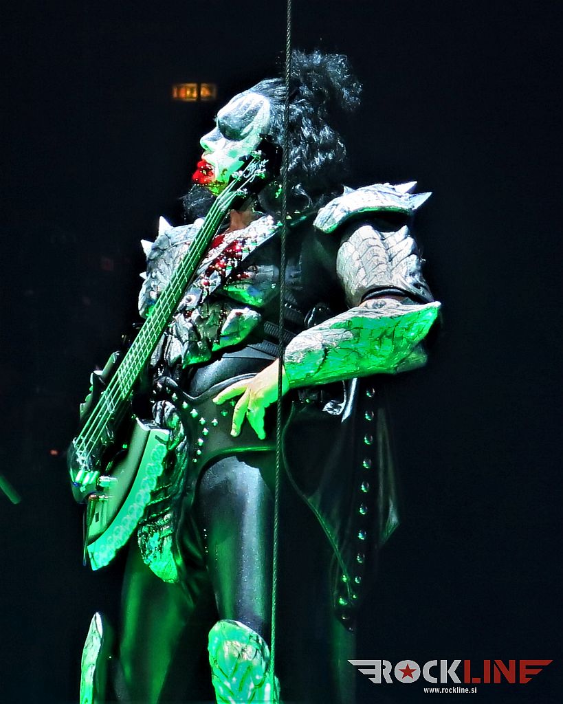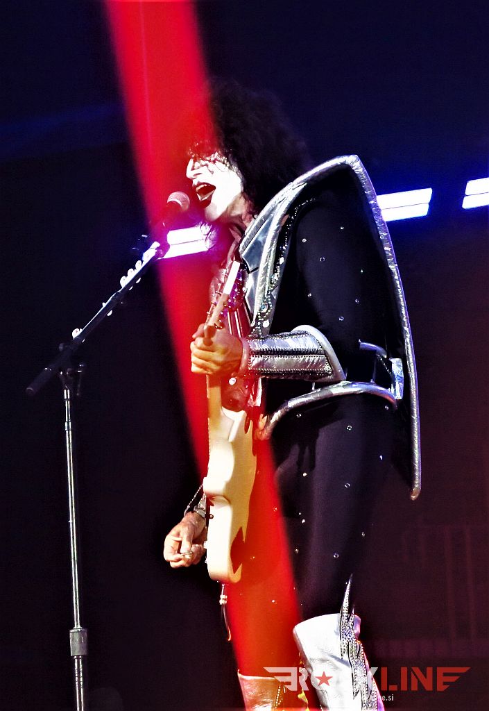 Gene Simmons bo denimo proti koncu avgusta letos napolnil 73. let, Paul Stanley pa se je priključil klubu sedemdesetletnikov prav v letošnjem januarju. Originalna člana sta neverjetna. Geneovi odvečni kilogrami so kar dobro zamaskirani pod kolosalnim oklepom v katerem se basist nahaja med koncertnimi predstavami, medtem ko zadržuje Stanley tudi v svojih sedemdesetih neverjetno odrsko agilnost, razposajenost in navihanost. Povsod ga je dovolj. Šviga z leve na desno ter pri tem ne ostaja niti za hip brez sape. Tudi v vokalnem oziru je povsem korekten, četudi je z leti izgubil seveda nekaj prodornosti. Kiss uporabljajo glede spremljevalni vokalov v celoti matrice (nasneti ‘playback’), večkrat pa je bil sumljiv glede tega tudi Genejev bas. Že takoj v uvodni ‘thinlizzyjevski’ Detroit Rock City njegova desnica še zdaleč ni bila sinhrona. Kremeniti ‘jezični badass gromovnik’ je na odru opremljen s črnimi brisačkami (da se ne vidi vse pobrisane umazanije), s katerimi nenehno briše svoj znoj in če ste srečnež svoje sorte, lahko Gene zaluča kakšno preznojeno krpo naravnost proti vam. Sicer pa je možakar izžareval trpljenje pod bataljonom reflektorjem tudi tako, da se je nenehno polival z vodo. Vse povsod. Tudi po bas kitari. Pri tem ni pozabil konkretno škropiti tudi publike. Simmons, Thayer in Singer imajo tudi vsak solo točko, pri čemer jih na posebnih, dodatnih podestih med točkami dvignejo (‘apzajlajo’) tik pod reflektorje. Simmons kompenzira svoje pomanjkanje znanja igranja bas kitare (ob sami obrazni poslikavi) že samo s svojim orjaškim jezikom. To je njegova žrtev za večno slavo, ki jo je dosegel s Kiss! Ko pa je med ‘svojo solažo’ visoko nad odrom ter obsijan v zeleni svetlobi, pa pregrizne vrečko rdeče želatine, z učinkom kot bi bljuval kri. Nihče mu ne gleda pod prste. V solo točki uporablja znamenito bas kitaro v obliki sekire. Thayerjeva solaža pa je pospremljena s serijo detonacij. Odveč je dodajati, da spominja odrska kulisa na pekel. Odveč je dodajati, da je igra snopov reflektorske svetlobe enkratna, neponovljiva in veličastna. Izpiljena do perfekcije. Pri tem ne izostajajo niti ‘laserski’ žarki. Stanley ostaja še vedno izjemen pogonski motor skupine. Med Love Gun se je z glavnega odra ‘odzajlal’ na dodaten manjši oder, nameščen v ostalem parterju, kjer je kraljeval sam na svojem odru. Tu je ostal tudi v času izvedbe nadobvezne I Was Made For Lovin’ You, potem pa se je po zadnjem refrenu znova namestil na prevozno sredstvo, ki ga je po taisti (‘zip-line’) jeklenici dostavilo nazaj na glavni oder.