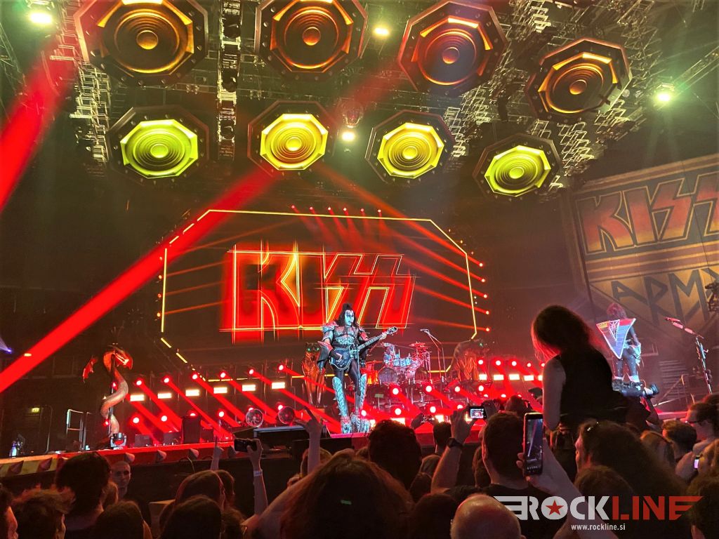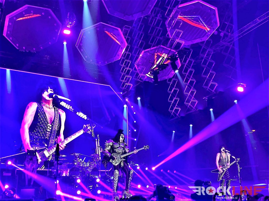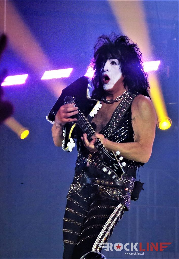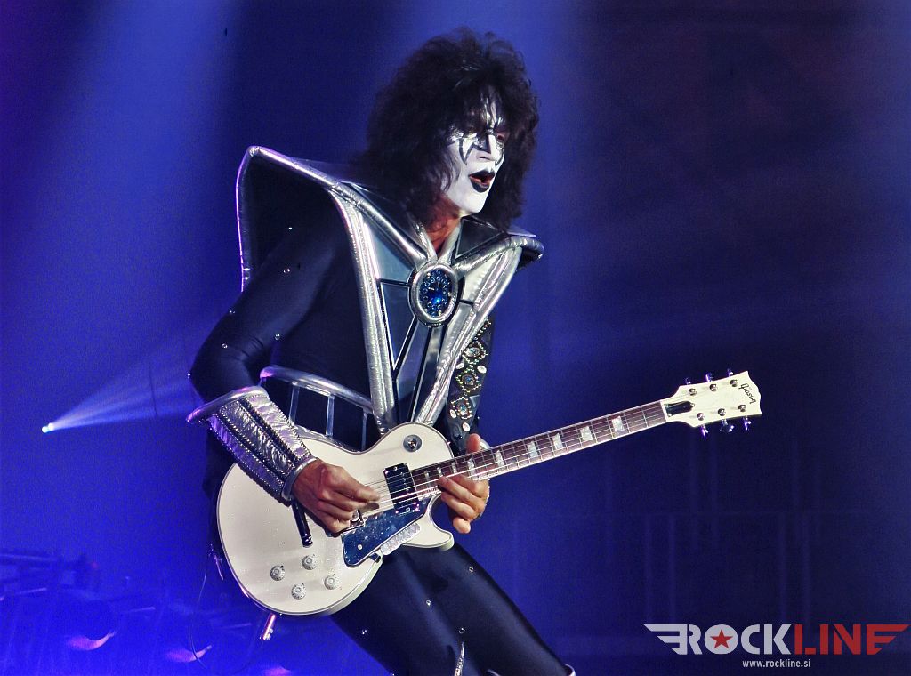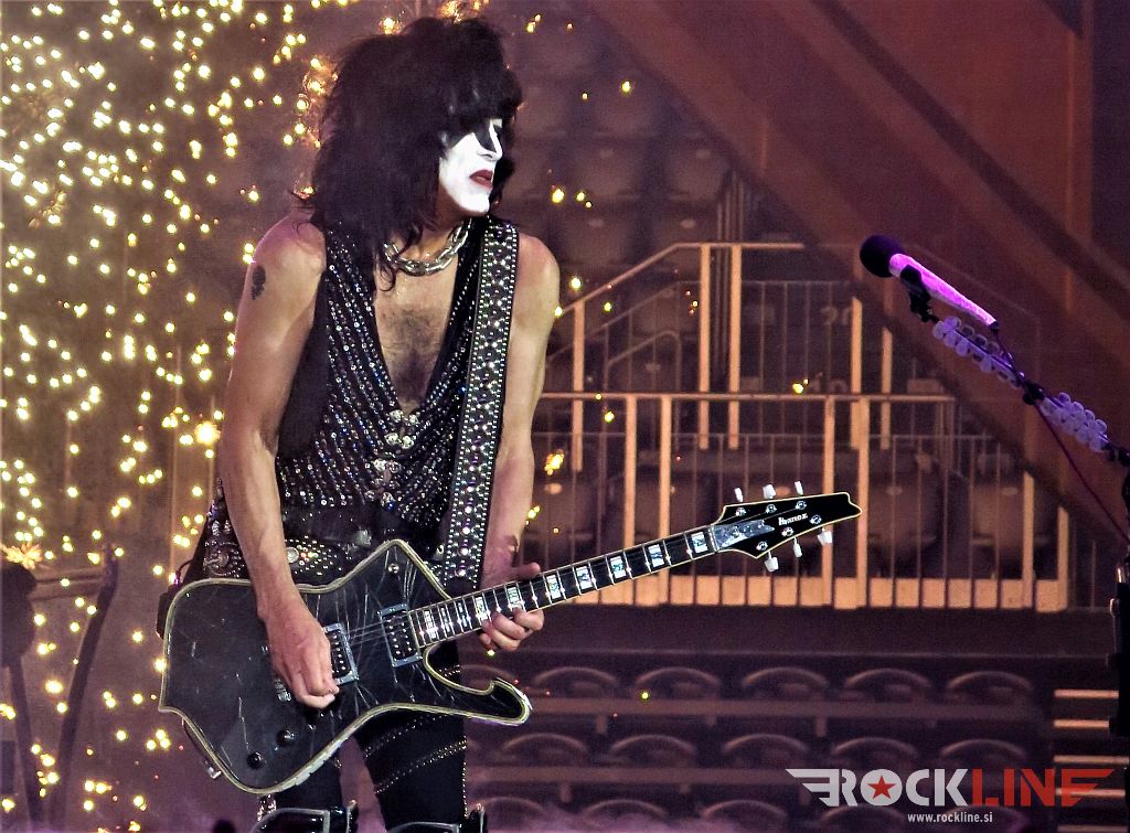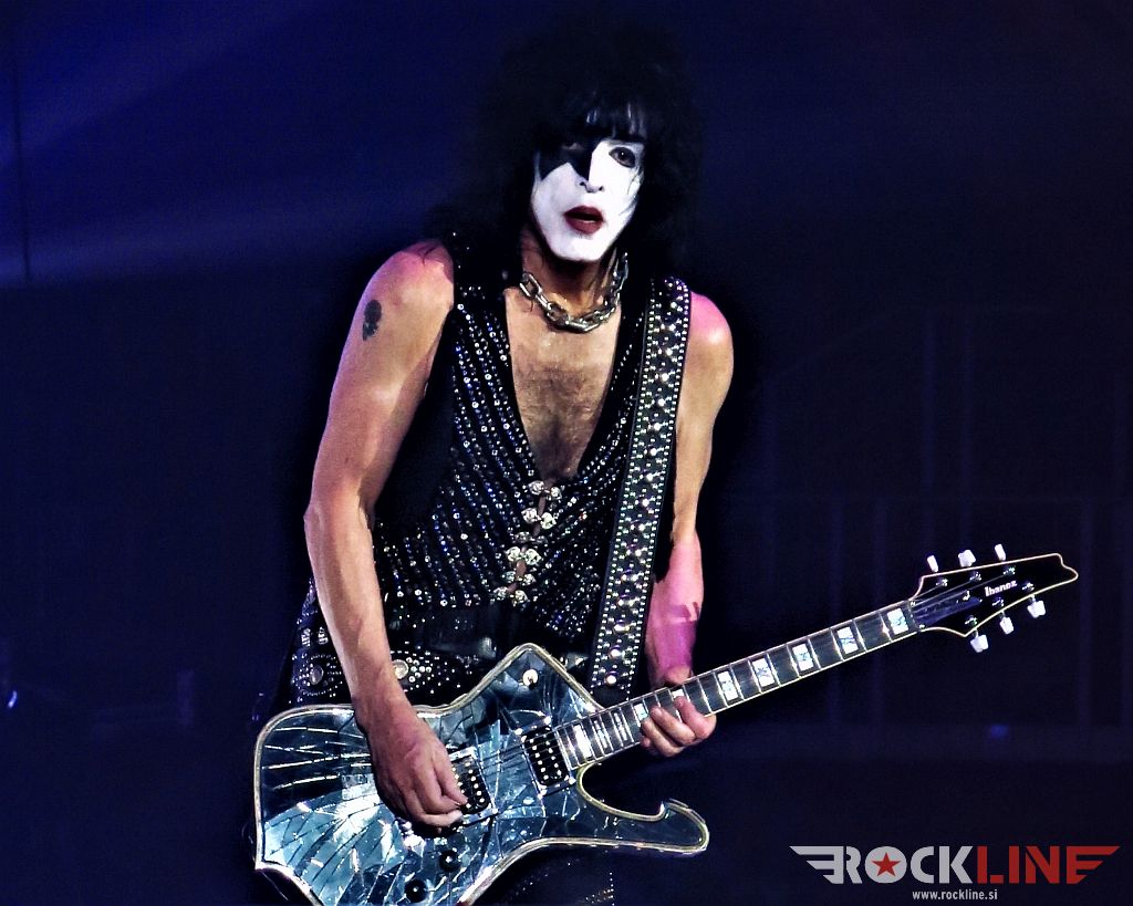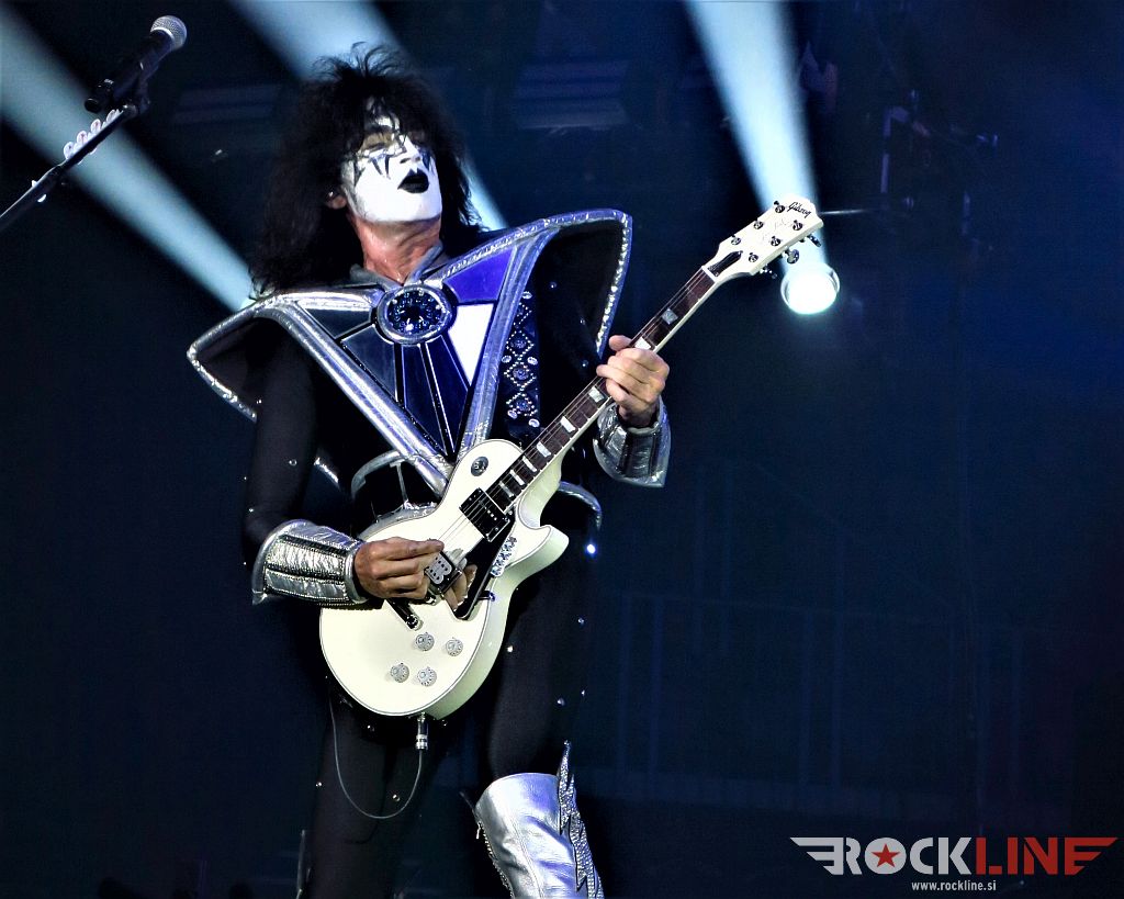 Gene Simmons bo denimo proti koncu avgusta letos napolnil 73. let, Paul Stanley pa se je priključil klubu sedemdesetletnikov prav v letošnjem januarju. Originalna člana sta neverjetna. Geneovi odvečni kilogrami so kar dobro zamaskirani pod kolosalnim oklepom v katerem se basist nahaja med koncertnimi predstavami, medtem ko zadržuje Stanley tudi v svojih sedemdesetih neverjetno odrsko agilnost, razposajenost in navihanost. Povsod ga je dovolj. Šviga z leve na desno ter pri tem ne ostaja niti za hip brez sape. Tudi v vokalnem oziru je povsem korekten, četudi je z leti izgubil seveda nekaj prodornosti. Kiss uporabljajo glede spremljevalni vokalov v celoti matrice (nasneti ‘playback’), večkrat pa je bil sumljiv glede tega tudi Genejev bas. Že takoj v uvodni ‘thinlizzyjevski’ Detroit Rock City njegova desnica še zdaleč ni bila sinhrona. Kremeniti ‘jezični badass gromovnik’ je na odru opremljen s črnimi brisačkami (da se ne vidi vse pobrisane umazanije), s katerimi nenehno briše svoj znoj in če ste srečnež svoje sorte, lahko Gene zaluča kakšno preznojeno krpo naravnost proti vam. Sicer pa je možakar izžareval trpljenje pod bataljonom reflektorjem tudi tako, da se je nenehno polival z vodo. Vse povsod. Tudi po bas kitari. Pri tem ni pozabil konkretno škropiti tudi publike. Simmons, Thayer in Singer imajo tudi vsak solo točko, pri čemer jih na posebnih, dodatnih podestih med točkami dvignejo (‘apzajlajo’) tik pod reflektorje. Simmons kompenzira svoje pomanjkanje znanja igranja bas kitare (ob sami obrazni poslikavi) že samo s svojim orjaškim jezikom. To je njegova žrtev za večno slavo, ki jo je dosegel s Kiss! Ko pa je med ‘svojo solažo’ visoko nad odrom ter obsijan v zeleni svetlobi, pa pregrizne vrečko rdeče želatine, z učinkom kot bi bljuval kri. Nihče mu ne gleda pod prste. V solo točki uporablja znamenito bas kitaro v obliki sekire. Thayerjeva solaža pa je pospremljena s serijo detonacij. Odveč je dodajati, da spominja odrska kulisa na pekel. Odveč je dodajati, da je igra snopov reflektorske svetlobe enkratna, neponovljiva in veličastna. Izpiljena do perfekcije. Pri tem ne izostajajo niti ‘laserski’ žarki. Stanley ostaja še vedno izjemen pogonski motor skupine. Med Love Gun se je z glavnega odra ‘odzajlal’ na dodaten manjši oder, nameščen v ostalem parterju, kjer je kraljeval sam na svojem odru. Tu je ostal tudi v času izvedbe nadobvezne I Was Made For Lovin’ You, potem pa se je po zadnjem refrenu znova namestil na prevozno sredstvo, ki ga je po taisti (‘zip-line’) jeklenici dostavilo nazaj na glavni oder.