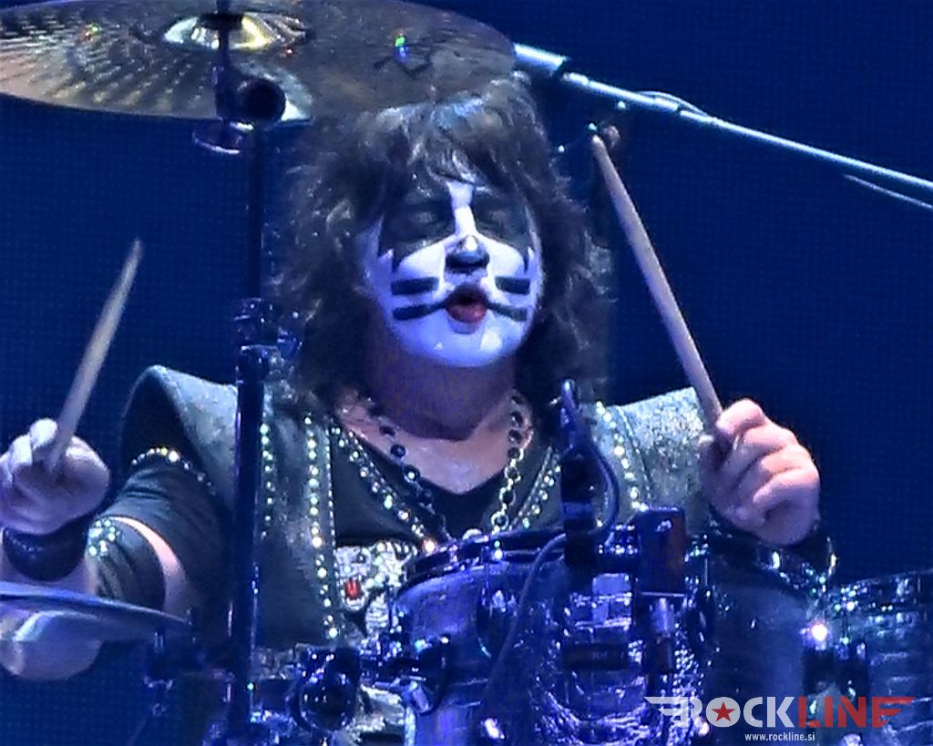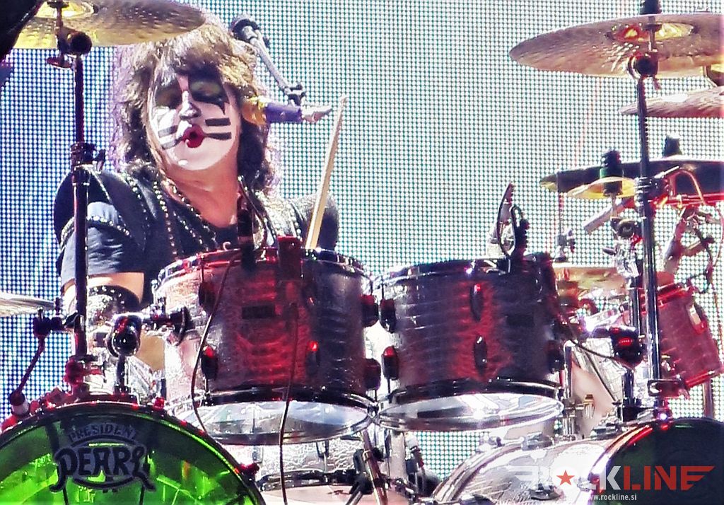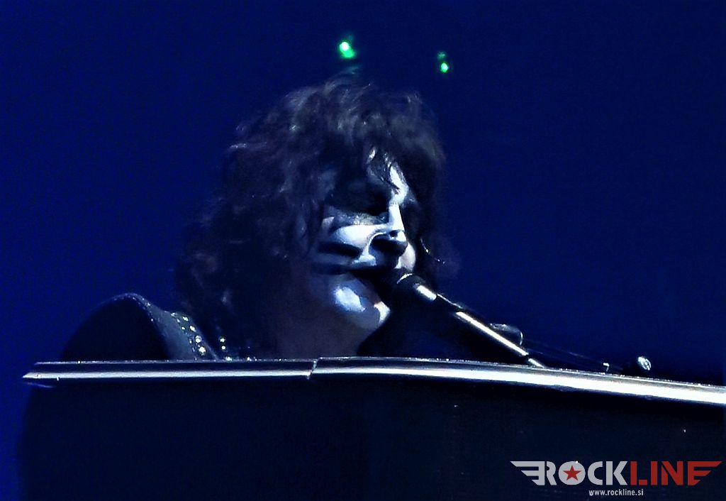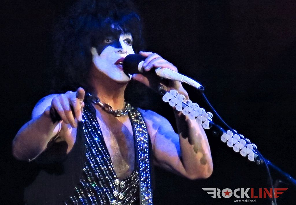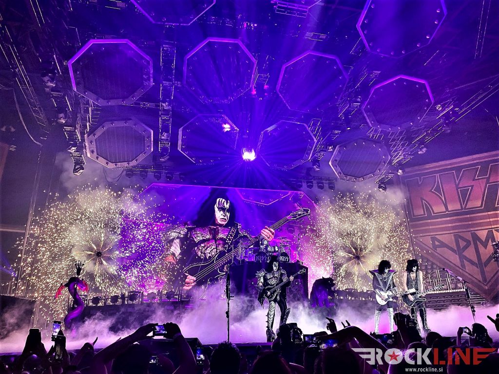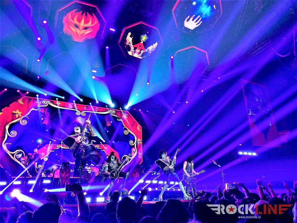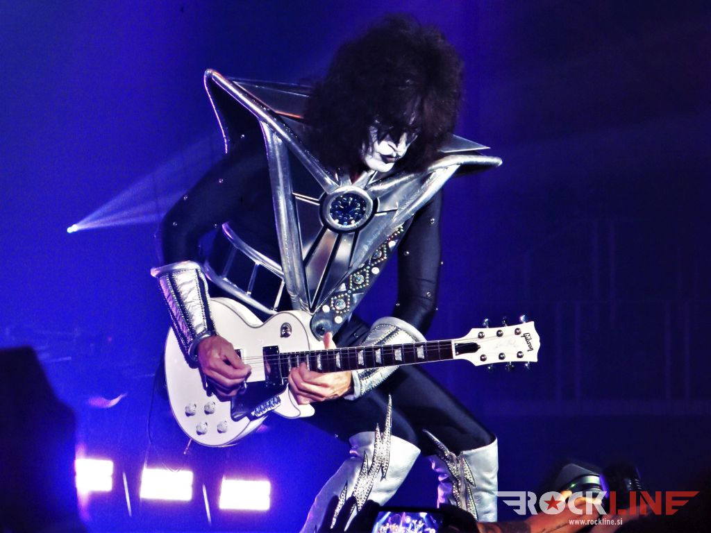 Gene Simmons bo denimo proti koncu avgusta letos napolnil 73. let, Paul Stanley pa se je priključil klubu sedemdesetletnikov prav v letošnjem januarju. Originalna člana sta neverjetna. Geneovi odvečni kilogrami so kar dobro zamaskirani pod kolosalnim oklepom v katerem se basist nahaja med koncertnimi predstavami, medtem ko zadržuje Stanley tudi v svojih sedemdesetih neverjetno odrsko agilnost, razposajenost in navihanost. Povsod ga je dovolj. Šviga z leve na desno ter pri tem ne ostaja niti za hip brez sape. Tudi v vokalnem oziru je povsem korekten, četudi je z leti izgubil seveda nekaj prodornosti. Kiss uporabljajo glede spremljevalni vokalov v celoti matrice (nasneti ‘playback’), večkrat pa je bil sumljiv glede tega tudi Genejev bas. Že takoj v uvodni ‘thinlizzyjevski’ Detroit Rock City njegova desnica še zdaleč ni bila sinhrona. Kremeniti ‘jezični badass gromovnik’ je na odru opremljen s črnimi brisačkami (da se ne vidi vse pobrisane umazanije), s katerimi nenehno briše svoj znoj in če ste srečnež svoje sorte, lahko Gene zaluča kakšno preznojeno krpo naravnost proti vam. Sicer pa je možakar izžareval trpljenje pod bataljonom reflektorjem tudi tako, da se je nenehno polival z vodo. Vse povsod. Tudi po bas kitari. Pri tem ni pozabil konkretno škropiti tudi publike. Simmons, Thayer in Singer imajo tudi vsak solo točko, pri čemer jih na posebnih, dodatnih podestih med točkami dvignejo (‘apzajlajo’) tik pod reflektorje. Simmons kompenzira svoje pomanjkanje znanja igranja bas kitare (ob sami obrazni poslikavi) že samo s svojim orjaškim jezikom. To je njegova žrtev za večno slavo, ki jo je dosegel s Kiss! Ko pa je med ‘svojo solažo’ visoko nad odrom ter obsijan v zeleni svetlobi, pa pregrizne vrečko rdeče želatine, z učinkom kot bi bljuval kri. Nihče mu ne gleda pod prste. V solo točki uporablja znamenito bas kitaro v obliki sekire. Thayerjeva solaža pa je pospremljena s serijo detonacij. Odveč je dodajati, da spominja odrska kulisa na pekel. Odveč je dodajati, da je igra snopov reflektorske svetlobe enkratna, neponovljiva in veličastna. Izpiljena do perfekcije. Pri tem ne izostajajo niti ‘laserski’ žarki. Stanley ostaja še vedno izjemen pogonski motor skupine. Med Love Gun se je z glavnega odra ‘odzajlal’ na dodaten manjši oder, nameščen v ostalem parterju, kjer je kraljeval sam na svojem odru. Tu je ostal tudi v času izvedbe nadobvezne I Was Made For Lovin’ You, potem pa se je po zadnjem refrenu znova namestil na prevozno sredstvo, ki ga je po taisti (‘zip-line’) jeklenici dostavilo nazaj na glavni oder.