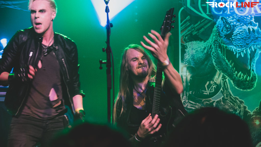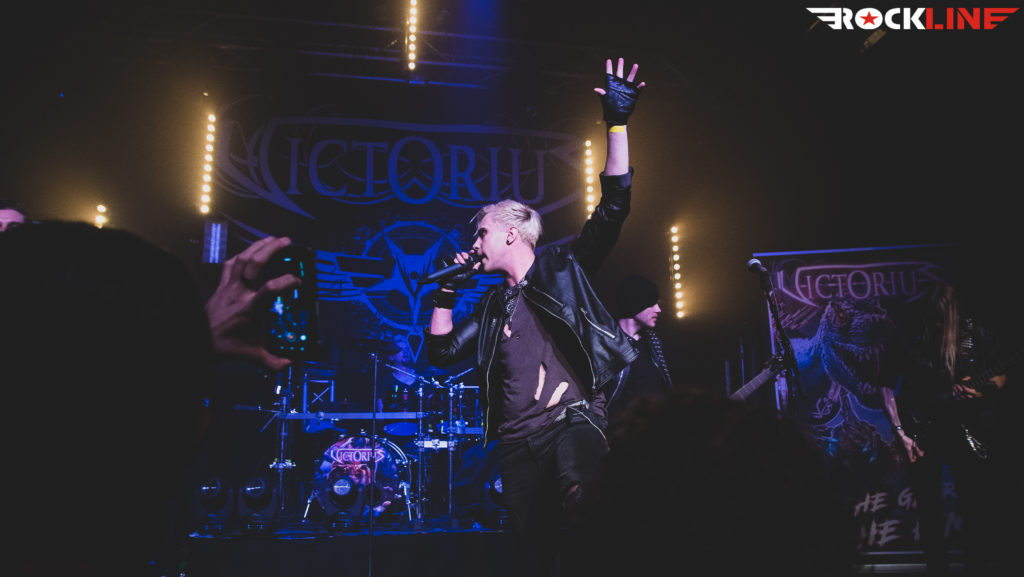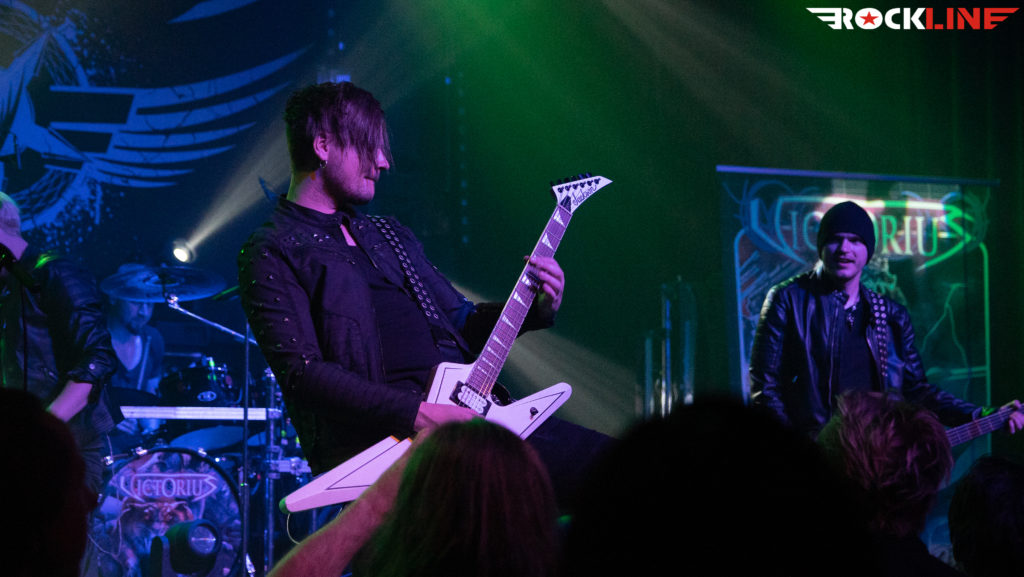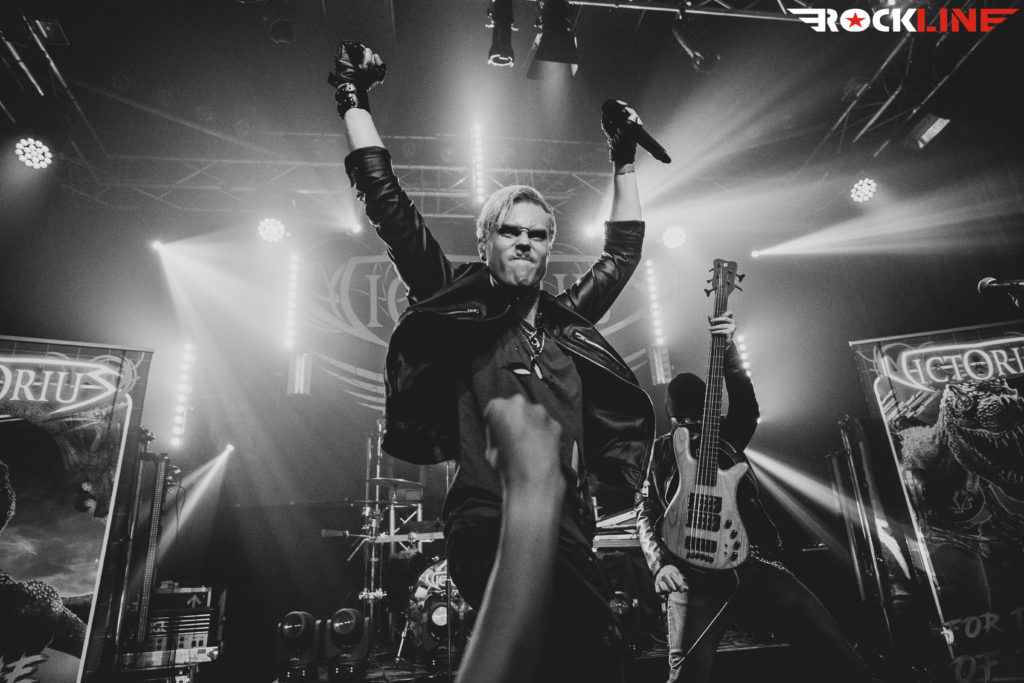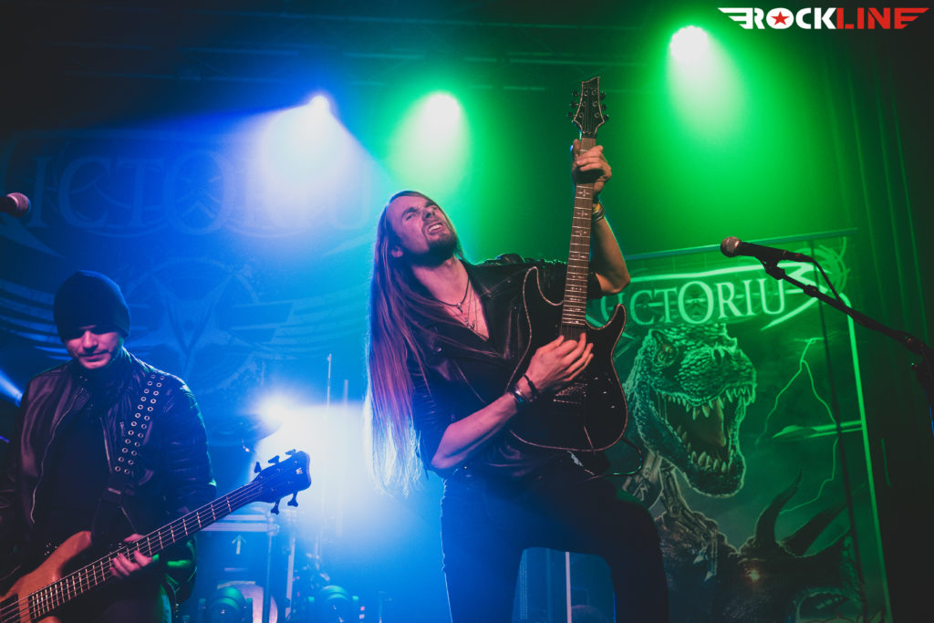 Victorius, nemški povermetalci, ki so tu nastopili 28. 1. 2017 pred Grave Digger (RockLine recenzija koncerta TUKAJ), ali na dan, ko je Slovenija na moč elegantno speljala bronasto kolajno favorizirani Hrvaški na SP v rokometu, so torej odprli večerno rajanje v graškem Explosivu. Prvi se je usidral v fokusu vidnega polja vokalist David Baßin. Zaradi nove poblanžerane pričeske in kratko postriženega lasišča, ob čemer bi človek hipoma pomislil, da je sam samcati Jan Vetter aka Farin Urlaub prestopil iz Die Ärzte branit barve power metala. Tudi kliše vžiga, če si srčen in predan. Verjeti moraš vanj. In Victorius to preprosto morajo verjeti. Čuti se, da veliko igrajo. Da niso več zelenci. Zelo samozavestno obvladujejo oder. Skupina je morala nedavno odkriti, da pri mulariji, ki preživlja dneve ob nažiganju arkadnih iger, vžiga lišp in kič (na meji parodije), nad umetnikovo kreativnostjo. Tako je z EP-jem »Dinosaur Warfare – Legend of the Power Saurus«, izdanim 2018 za Massacre Records, vnesla v svoj izgled nekaj Dragonforce in Gloryhammer grotesknosti (lahko bi vpel še naše Space Unicorn of Fire, da bo mera polna). A ko pomisliš, da v teh sferah občasno kolobarijo tudi (začasno zamrznjeni) Edguy, gre pač za trend, v katerem se po novem preizkušajo tudi Victorius. Bend je pretežno izvajal komade z EP-ja (Dinosaur Warfare, Lazer Tooth Tiger, Legend of the Power Saurus, Razorblade Raptor), poleg pa dodal povsem novi komad, s prihajajočega novega albuma »Space Ninjas from Hell«, ki je bil obilneje založen s klaviaturami in pompom. Komad Super Sonic Samurai. Korekten nastop kvinteta, ki ga ob Baßinu, zapolnjujejo še Dirk Scharsich (kitara), Florian Zack (kitara), Andreas Dockhom (bas kitara) in Frank Koppe (bobni).