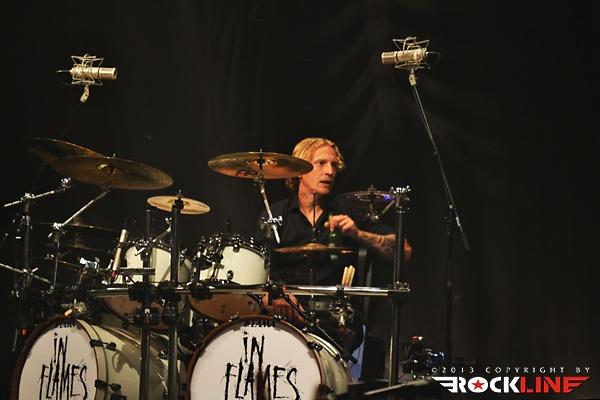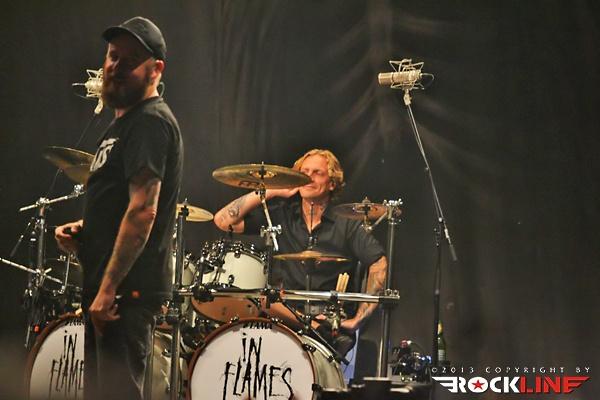 Dogajanje na glavnem odru prvega dne festivala so zaključili veterani iz švedskega Gothenburga In Flames. V Tolminu se dobro počutijo, njihov nastop na Metaldays festivalu pa na taistem prizorišču ni prvi! In Flames so naoljen stroj, ki je na festivalski oder vdrl z vso silo. Glede na to, da poteka promocija albuma širom sveta že debeli dve leti in glede na to, da smo In Flames ujeli v sklopu začetnega dela taiste turneje sredi CUK Kina Šiške konec septembra 2011, se je bilo nadejati razširjenih sprememb repertoarja. A smo pričakali bore malo sprememb. »Sounds of a Playground Fading«, deseti studijski album skupine, je doživel še eno odrsko konkretizacijo, ko so se In Flames vneli po odru že kar z otvoritveno naslovno skladbo albuma. Koncert se je odvijal v spremstvu izjemno močne reflektorske osvetlitve, pravzaprav že kar oslepljujoče. O kvaliteti nastopa ne gre dvomiti. Pravzaprav brez mnogo naporov so In Flames do tal požgali prizorišče prvega dne festivala, fanatična publika pa jim je nič manj fanatično jedla iz roke. Anders Fridén (vokal), Björn Gelotte (kitara), Daniel Svensson (bobni), Peter Iwers (bas kitara) in Niclas Engelin (kitara), ki je leta 2011 v ekipi permanentno zamenjal iztrošenega Jesperja Strömblada, so rutinirano trosili napalm skozi izvedbo falange novejših koračnic in cel festival se je preselil na nekakšno predodrsko gruvajočo ponjavo, ki s svojim prožnim vzmetenjem sinhrono sledi čvrstemu ritmičnemu primežu skupine. Zmes čvrstih ritmov, podprtih s plejado modnih breakdown zank in kombinacije melodičnih sekvenc s kitarami v tercah ter riffovske agresije, se je enkrat več izkazala za zmagovito in preverjeno potezo, s čimer so In Flames z lahkoto upravičili vlogo headlinerja festivala. Žal se je tudi med njihovim nastopom kazala hiba v ozvočenju in precej nerazločnosti v samem riffanju obeh kitar, a je bila s podobnimi peripetijami obtežena tudi falanga skupin, ki so nastopale na glavnem odru pred In Flames. Kaj več od občutka rutine In Flames niso pričarali. Kdor jih še ni videl, je lahko neobremenjeno užival, kdor jih ima rad toliko bolj, kdor pa jih je »firbcal« že večkrat, je dobil to kar je pričakoval. Od In Flames v letu 2013 veliko modernega in malo, če ne kar nič, klasičnega. Tudi stare klasike, kot je recimo The Hive, zvenijo v novi In Flames drži danes povsem drugače kot v zlatih časih njihovega melodic death metal pionirstva. Lepo, korektno, a brez presežnikov in v skladu s pričakovanji. Glavno, da je narodu zatrgalo na polno v glavah in to je bil tudi osnovni namen skupine!
