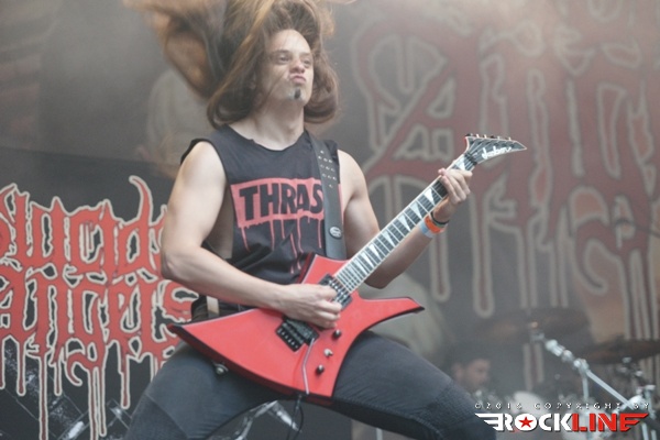 Drugi oder so v nadaljevanju zavojevali grški thrash metal revitalisti Suicidal Angels doma iz nič manj grških Aten. Bend je v lanskem letu izdal aktualni studijski album »Division of Blood« in temu primerno podredil tudi repertoar, v katerem je bil poudarek na preigravanju novih skladb. Pri Suicidal Angels ni slepomišenja. Dobiš natanko to kar vidiš. In skozi leta ne odstopajo mnogo od svoje začrtane glasbene usmeritve. V njihovih kompozicijah se izdatno čuti vpliv thrash metal titanov Slayer. In bend je udaril na plano s kar tremi skladbami albuma »Divison Of Blood«, ki so jih zaigrali zapovrstjo. Začenši v svojem slogu. Uničujoče in brezkompromisno. »Samomorilsko«. Capitals Of War, Divison of Blood in Image of the Serpent so se kotalili druga za drugo, medtem pa so obiskovalci hitro našli premnogo simpatij z agresijo in bljuvanjem ognja, ki je prihajalo z odra ter tako soustvarili izredno kemično interakcijo s sicer skrajno podivjano skupino. Edino kar moti pri Suicidal Angels je štorasta raba Angleščine in na trenutke kronična doza generičnosti, ki občasno zaveje iz njihovih kitarskih fraz. Bend je na odru predstavil tudi novega kitarista Gusa Draxxa, ki je v lanskem letu zamenjal Chrisa Tsitsisa. Suicidal Angels so sicer izredno dobro uigrana skupina. Več kot očitno je, da redno nastopa na odrih Evrope in sveta. Če ni vključena v turnejski paket s po več skupin, se pojavlja redno na poletnih evropskih festivalih. Natrpan urnik velikih garačev iz vrst grškega thrash metal revitalizma torej. Bend je v štiridesetih minutah »veseloigre« natresel še Beggar of Scorn, Bleeding Holocaust, Reborn in Violence, Bloodbath, Mooshing Crew ter Apokathilosis.