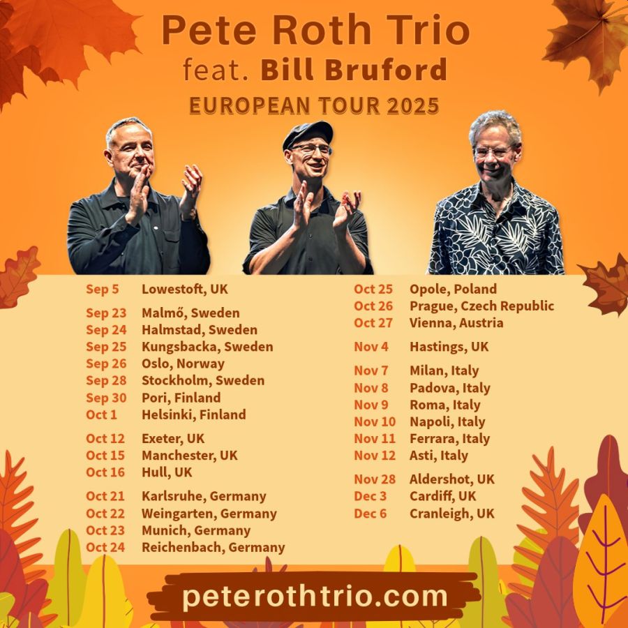 Pete Roth Trio – PRT, jazz rock fusion trio, kjer poleg Rotha sodelujeta še Bill Bruford in Mike Pratt, so objavili evropske koncertne termine. Glavina koncertov je usmerjena skozi september na Skandinavijo, potem pa se v drugi polovici oktobra premaknejo na staro evropsko celino, kjer bodo Sloveniji najbliže nastopili 27. oktobra na Dunaju in potem kasneje, še 8. novembra v Padovi.
