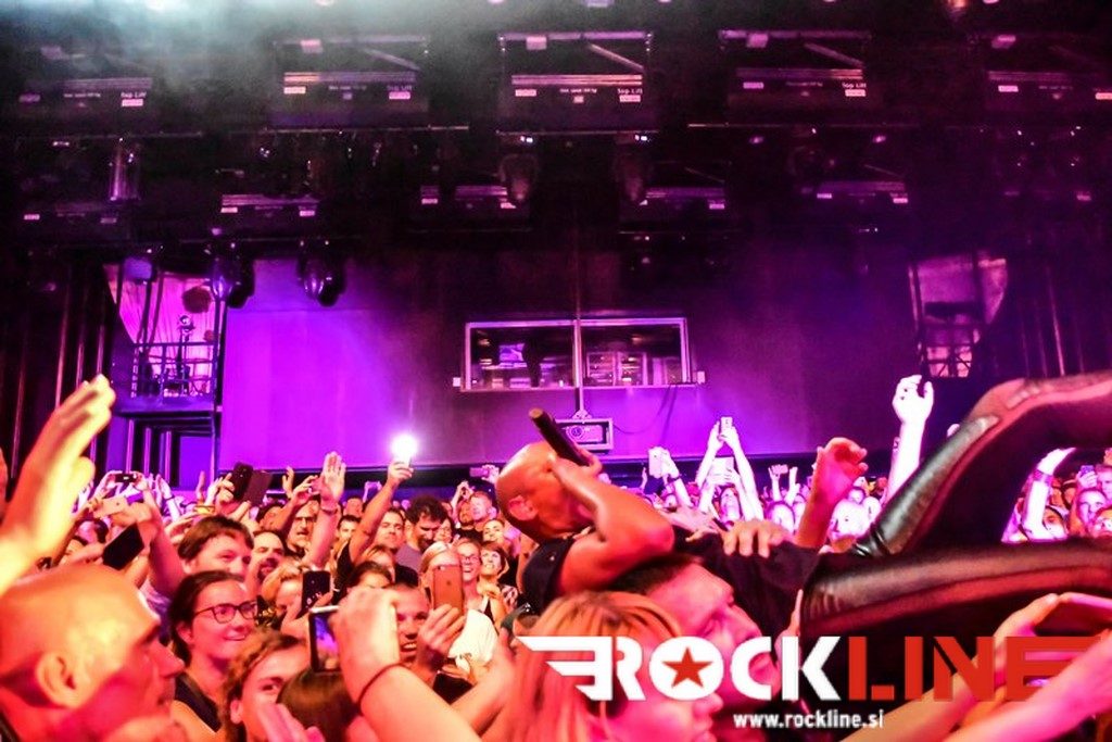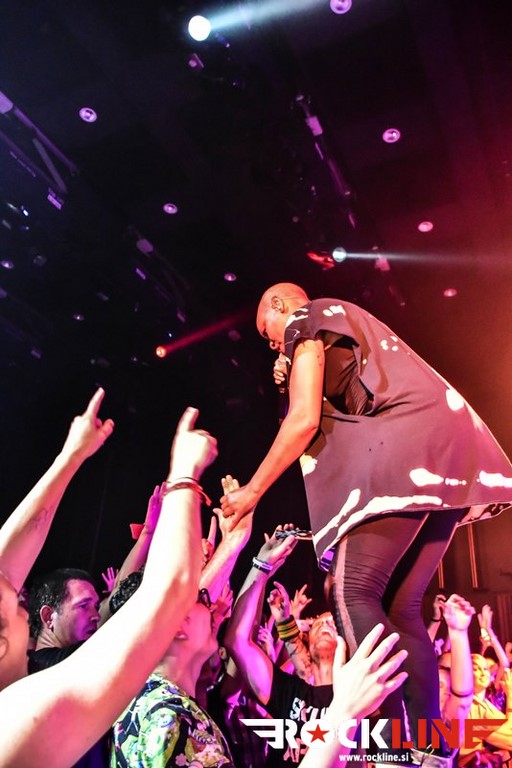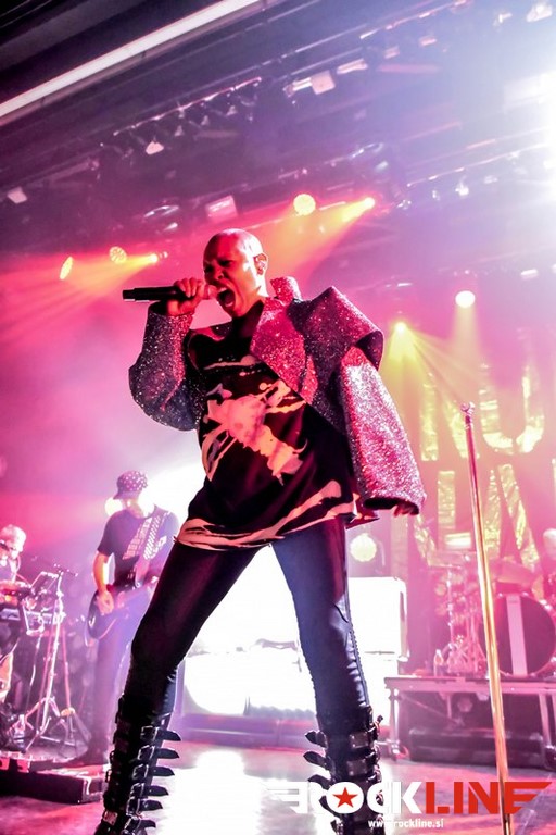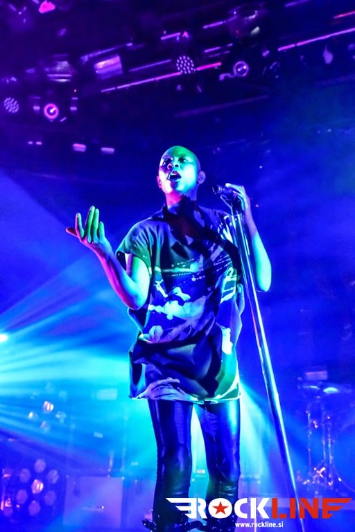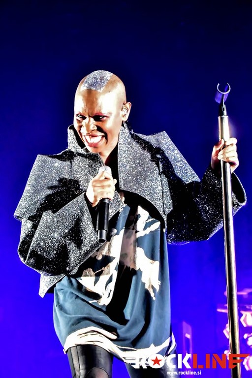 V uvodnem delu si je Skin seveda privoščila nekaj ekstravagance glamovskih prijemov, a je seveda v nadaljevanju skozi prve tri komade kaj hitro odvrgla s sebe »štoraste« kose konfekcije. Že uvodoma si je privoščila prvi izlet med publiko, ko je nekaj časa stala na ograji, ki je ločevala oboževalce od foto pita in odra ter vestno opazovala kakšna je situacija, potem pa se ulegla s hrbtom na roke zgoščene publike. To je storila še nekajkrat med koncertom. Gre za ustaljeni trik, ki vedno vžge, prodornost te pevke pa je izjemna tudi po plati, da je neverjetno gibčna in v svoji elastičnosti dobesedno stesana do meje prave atletske telovadke. Ves čas je tekala z leve na desno, pri čemer se je vneto držala pročelja odra, hkrati s tekanjem pa prepevala z neverjetno rušilno intenziteto. Neverjetna koncertna forma torej. Ne, tu niso bila nikakršna poživila v igri, vse je delovalo povsem pristno in naravno, na kar zna ob takšni ekstraterestrični superiornosti, človek zlobno pomisliti. Karizmatična pevka je dejansko sama peljala cel koncert, ko je skrbela za šov teater tudi s posrečenimi komentarji v premorih in fantje, pa čeprav gre za odlične glasbenike, so ob njej delovali kot hvaležni statisti, čeprav še zdaleč temu ni bilo tako. Na metalskih koncertih se na takšnih koncertih v Kinu Šiška navadno drsaš po politem pivu, no tega večera pa je bilo po tleh obilje posutih plastičnih slamic in olupkov limet. Hja, tudi to priča o povsem drugem profilu publike, glede na tisto, ki je vsega dan prej na taistem prizorišču gledala koncert Queensryche in Firewind (RockLine recenzija koncerta TUKAJ). Seveda je bilo na spregledu tudi nekaj »mavričarjev«, pa tudi nekaj »toplih« punc. Skratka, pisana druščina »v glavi osvobojenih«!