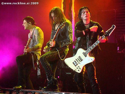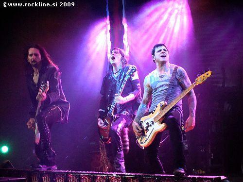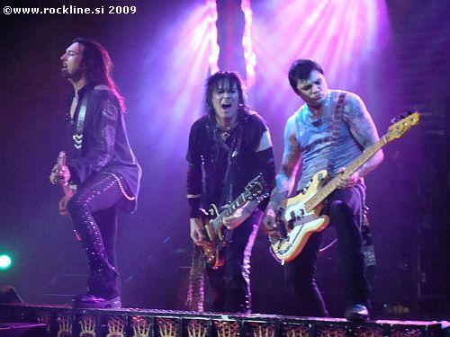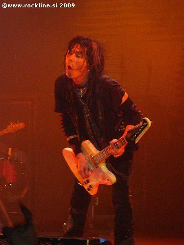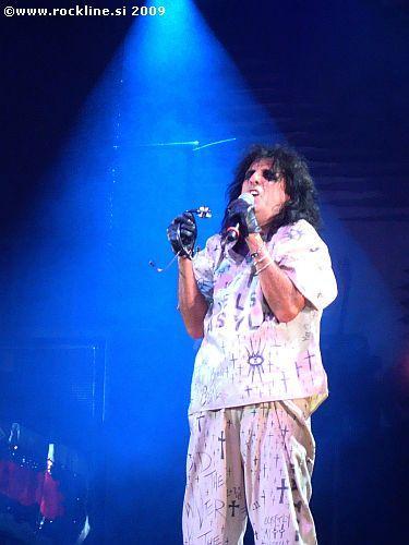 Šolski zvonec za intro, sedaj gre zares! Predstava, zgodba se je začela. Alice Cooper je tista osebnost v zgodovini rocka, ki je svojo glasbo prenesel na oder ter na njem kreiral in režiral dih jemajoče predstave, ki so nemalokrat šokirale občinstvo. Bratislavska zgodba se je začela plesti s hitom School’s Out, katerega naloga je že uvodoma razgreti množico, band s to potezo doseže, da je kontakt s publiko vzpostavljen že takoj, ne šele postopoma, tekom nastopa, kot se to nemalokrat dogaja. Postavitev na odru je bil veličastna – visoko v zraku bobnarski set Jimmyja DeGrassa, h kateremu so iz obeh strani vodile stopnice, v zraku so kot scena visele gromozanske različno oddaljene črke, ki so odru dodale tretjo, globinsko dimenzijo. Kakšna dinamika na odru! Primarno na desni strani stoječ glavni kitarist Keri Kelli (ex-Pretty Boy Floyd) ter leva stran odra v obliki drugega kitarista Damona Johnsona (Brother Cane) in bas kitarista Chucka Garrica (ex-Dio, ex-L.A. Guns..) nenehno menjavajo položaje, menjavajo tempo, ob inštrumentalnih delih stopijo skupaj in ustvarijo “Iron Maiden” rušilno kitarsko moč, ko pa je potrebno ustvarijo prostor za delodajalca in igrajo v navidezni temi, ko so vse oči usmerjene v Alicea Cooperja. Morda je prav vsa kinetičnost kitaristov vzrok, da so malo slabše pristopili k svojim harmoničnim vokalnim nalogam, ko so kot neizkušeni rački stali daleč od mikrofonov in se jih je slišalo odločno preslabo – to se je zgodilo denimo pri komadu Devil’s Blood. Izjemna koncertna kilometrina je Alicea Cooperja dodobra izšolala, stric dobro ve, kako ugoditi publiki. Na odru se prelevi v vlogo igralca, kateremu asistira nekajčlanska spremljevalna ekipa, in skupaj pišejo zgodbo, v katero gledalec, pardon, poslušalec, zapade, prebudijo in streznejo ga šele prižgani reflektorji ob koncu koncerta. Zgodba je sestavljena iz udarnih komadov s težkimi kitarskimi linijami, ki se na odru spremenijo v dramatične trenutke, in baladnih bluesy rock koračnic, ki razbremenijo tempo in poskrbijo za nekaj “oddiha”, premora v zgodbi. Tu je še nekaj dolgih inštrumentalnih delov, kjer na svoj račun pridejo glasbeniki, ki v času ko Cooperja ni na odru, stopijo izza njegove sence in dobijo nekaj trenutkov za samopromocijo. Pravo mazilo za ušesa je kitarist Kelli, kateremu je heavy rock zares pisan na kožo in katerega karizma zasenči ostale Cooperjeve najete muzičarje. Alice Cooper s šestimi križi ni več rosno mlad, kar se pozna na njegovem vokalu, a mu teatralnost nastopa ponuja krinko, da lahko vokalne linije po mili volji spreminja in jih prilagodi trenutnemu dogajanju na odru – takšno zvito taktiko spretno izkorišča, kar na momente izpade celo zelo dobro!