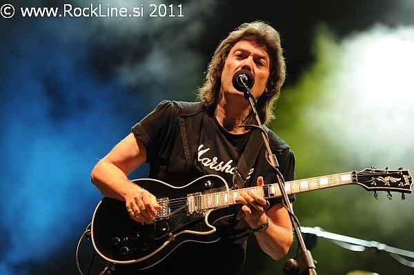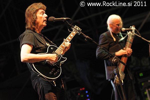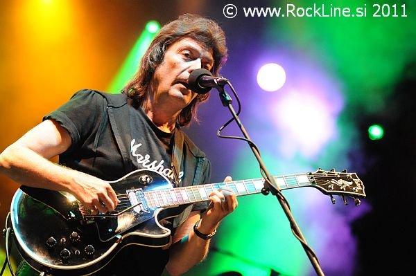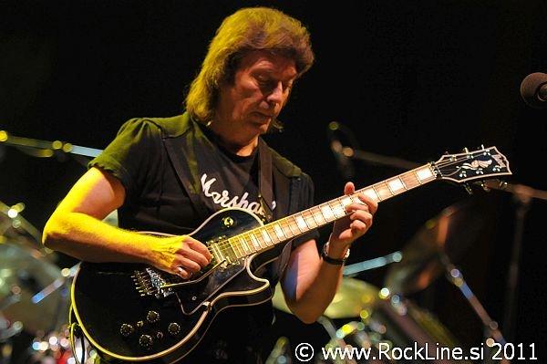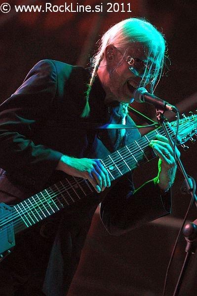 Hackett ni pozabil na aktualni studijski album “Out Of The Tunnel’s Mouth”. Every Day se je dramatično prelil v Emerald And Ash – izjemno klasično prog rockersko zgibanko ustvarjeno za nove čase, ki je ovila oder v smaragdno zelene reflektorske odtenke. Ti so se prebijali skozi megleno svilene tančice. Še posebej magična in visoko vibrantna izmed Stevovih avtorskih skladb v vzdušju pa deluje Fire On The Moon, ki jo je skupina odigrala proti sredini koncerta. Ta je izstopala po svojem dualnem obrazu. Krhko zibanje brhkih tonov piana, ki obdajajo Hackettov vokal speljan skozi efekt music box v kiticah, do prave refrenske erupcije harmoniziranih vokalnih kolažev, ki lebdijo na močni podpori melotrona v refrenu. Tu je še tretja, odlična skladba novega albuma, prava uspavanka, kot že namiguje sam naslov Sleepers, vključena v drugem delu takoj za Genesis klasiko Fly On The Windshield in kjer se je razmahnil Townsend na blok flavti, klasični flavti in v koncu z odlično tenor saksofon solažo. V set listi je izmed del Steveove solo kariere presenetila vključitev korakajoče folkovsko usmerjena Golden Age Of Steam iz albuma “Darktown” in ki ne skriva motivske podobnosti uvodnemu delu Genesis skladbe Battle Of Epping Forest. Seveda so tu standardi, ki so hkrati tudi najznamenitejša dela Hackettove solo kariere in pravzaprav obvezni sestavni del njegovega koncertnega repertoarja. Prva je magična Ace Of Wands, ki je med nastopom še posebej zlezla pod kožo, saj poseduje presunljivo kompatibilno retoriko neo klasicizma in keltske pastorale, kakršni bi zavidal v iskanju popolnega motiva tudi sam Mike Oldfield. Tu je fantastična Spectral Mornings in njena sorodnica, ki domuje na istem albumu (“Spectral Mornings”) – eksperimentalna Clocks. Slednjo je skupina prihranila povsem za zaključni del koncerta. V drugi polovici je za srhljivi intermezzo poskrbela “Defector” skladba The Steppes z razpotegnjenim uvodnim delom popolnega jazzovskega eksperimentiranja v režiji glavnih “krivcev” Towsenda na soprano saksofonu, Kinga na pianu in O’Toolea na tolkalih. Sledi nenaden preklop, kjer prevzame glavno beseda ritem linija, ki v ritmu spominja na počasne, dolge korake velikana. Le tega pa kaj kmalu nadgradijo arabeske enkratnega prepleta instrumentalne trojice Hackett, King, Townsend. Dejansko je ta trenutek na odru priklical občutke, kot bi poslušal Ravellov Bolero izkrivljen v melodiciranju skozi tonaliteto arabesk. Svojstveno razpoloženjsko stanje, v vsem hipnotično . Možakar je set listo zabelil še s povsem novo Prairie Angles, ki bo vključena na prihajajoči novi studijski album “Beyond The Shrouded Horizon” – slednja skladba v “grobosti” nadomešča v novem koncertnem repertoarju skladbo Still Waters, katero je Steve izvedel npr. na koncertu preteklo leto v Trstu. Tu si je možakar nadel naprstnik in z nekaj sunkovitimi “licki” izvabil iz kitare v solaži rušilno nadistorziran zvok nanizajoč edino točko, ki bi lahko zadišala všečno celo kakšnemu metalcu dovzetnemu glasbene presvetlitve.