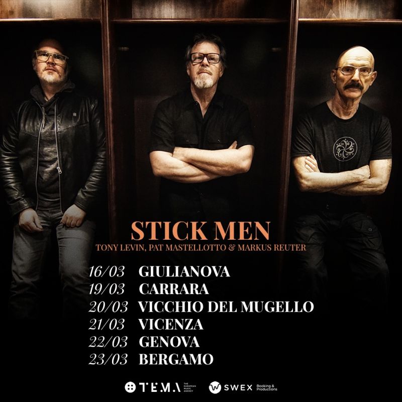 Stick Men, mednarodna progresivnorockovska senzacija, ki jo zastopa zvezdniški trio na relaciji Marcus Reuter (kitara) in ‘KingCrimsonovca’ Pat Mastelotto (bobni) in Tony Levin (bas kitara, Chapman Stick), se odpravlja v letošnjem marcu na nekaj koncertov po Italiji!