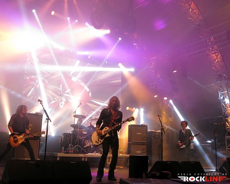 Bend je stal na odru ob pol enajsti zvečer. Pred njim so ogrevali prisotne tudi druge zasedbe (Lucifer, itn..), a brez omembe vrednih vrlin »obče rock’n’roll estetike«, zato smo jih preskočili. The Darkness so po pričakovanju odprli koncert z novo skladbo Solid Gold. Bili so dobro sprejeti. Kakih 1200 obiskovalcev jih je pričakalo v muhastih vremenskih razmerah. Med koncertom je namreč tudi blago deževalo. Dejansko so se prve vrste zgostile zlasti na rovaš poznavalcev in fenov skupine, tako da druščine Justina Hawkinsa ni pričakala povsem apatična in povečini bikerska publika, kar smo doživljali na tem festivalu pretekla leta, ko so nastopali mdr. takšni velikani rocka, kot so Uriah Heep, 10CC, Alvin Lee ali/in Asia.
